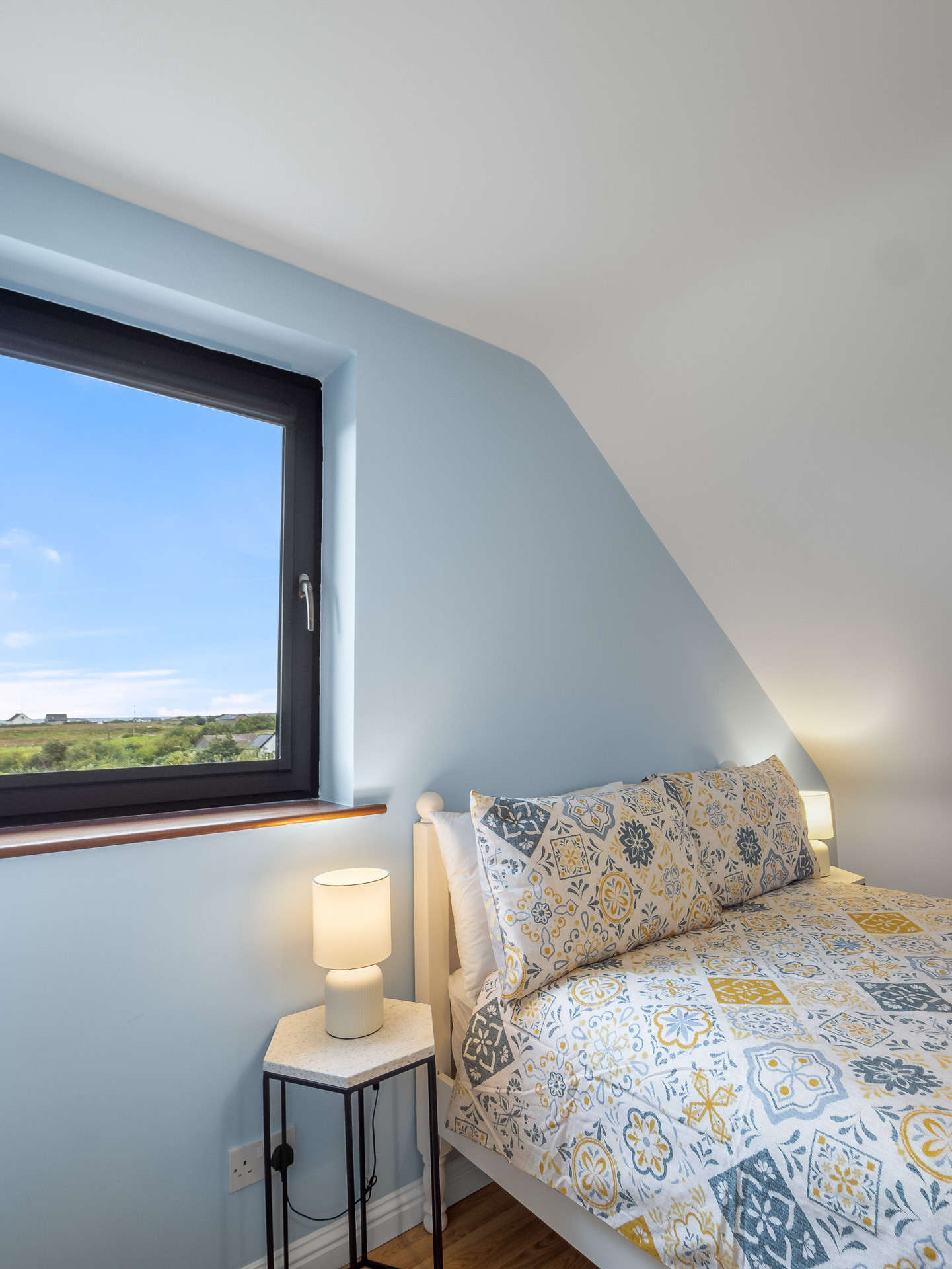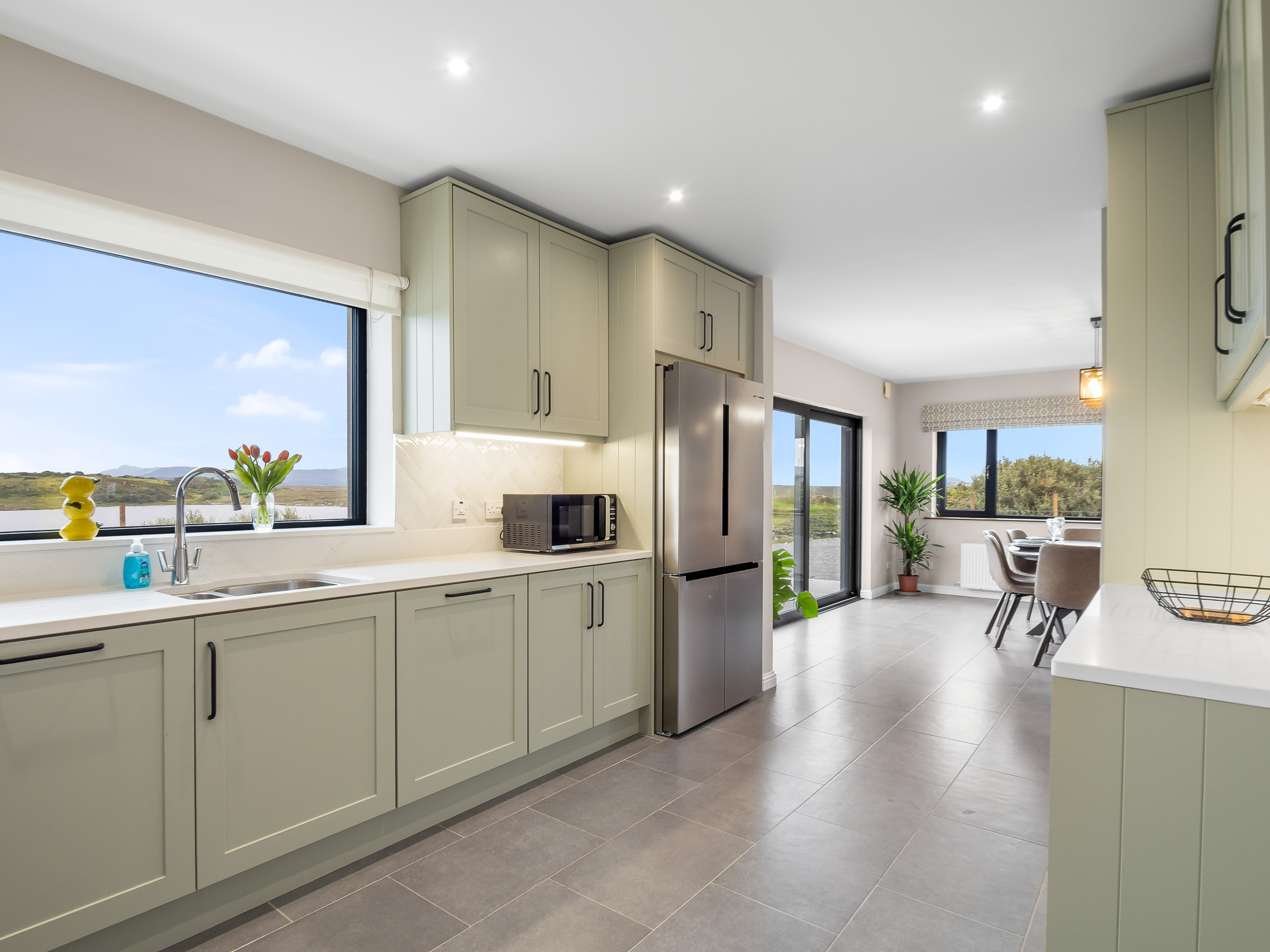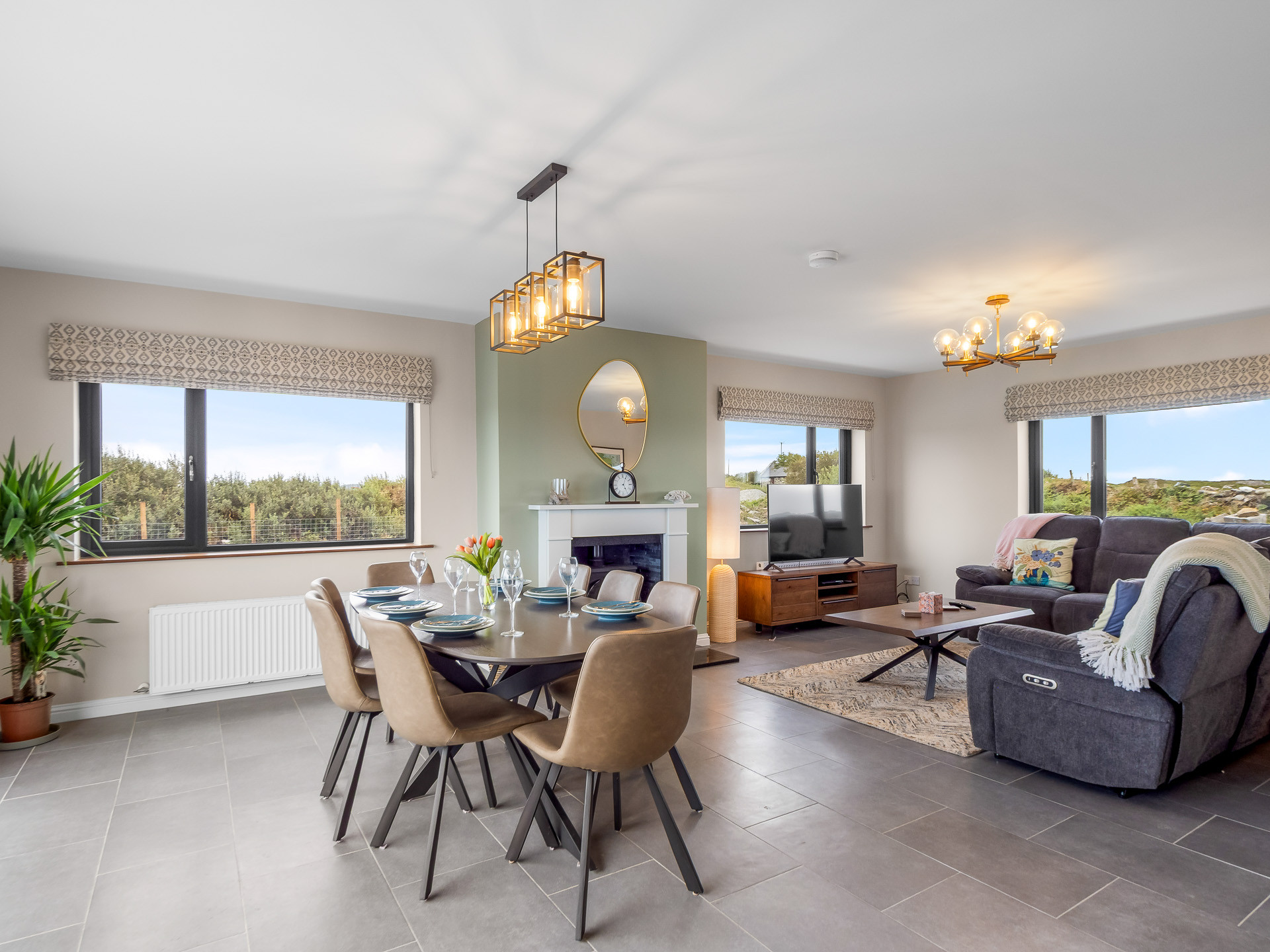 As the day begins, the Connemara landscape greets you: shifting skies, tranquil waters, and a horizon that seems endless. Afternoons might be spent walking the sandy shores of nearby Mannin Bay, cycling along quiet country lanes, or simply watching the light sweep across the mountains from the comfort of the open-plan living area. As evening draws in, gather around the dining table with family and friends, share stories, and let the peace of the place sink in.
