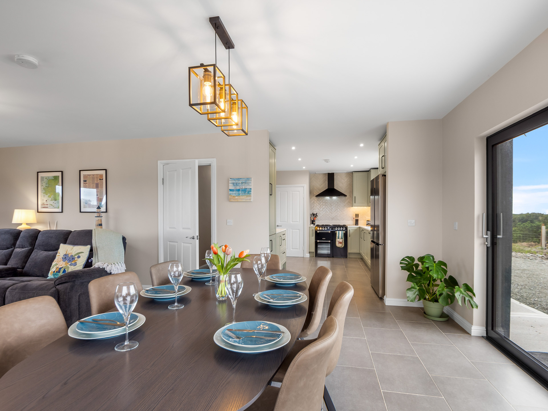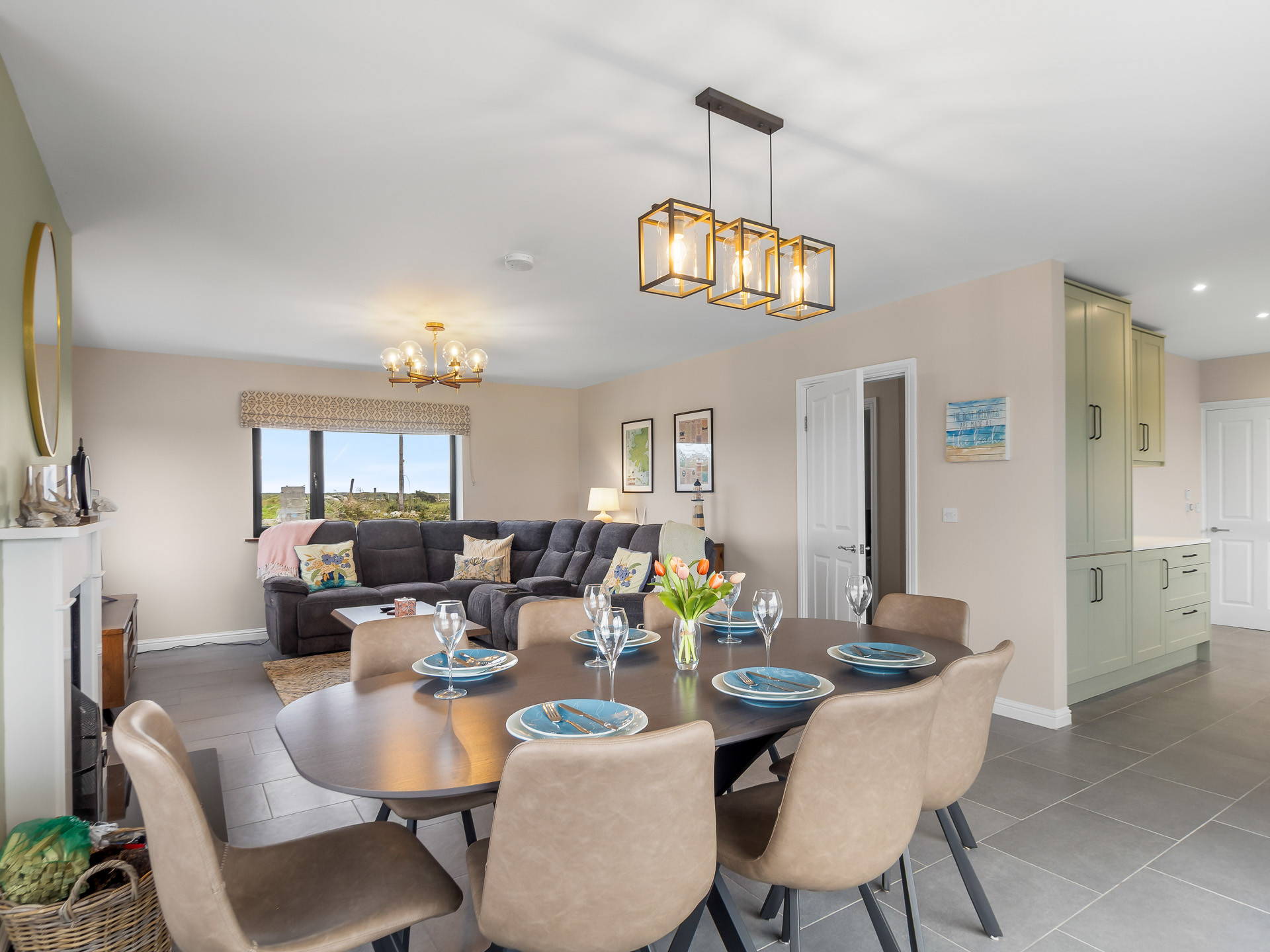 The dining area has another sofa with the large dining table comfortably seating up to 8 guests-the perfect place to relax and soak up the stunning countryside & sea views. There are double doors leading out onto the large patio area with BBQ, table & chairs, perfect for dining Al fresco or enjoying a glass of wine watching the sunset.