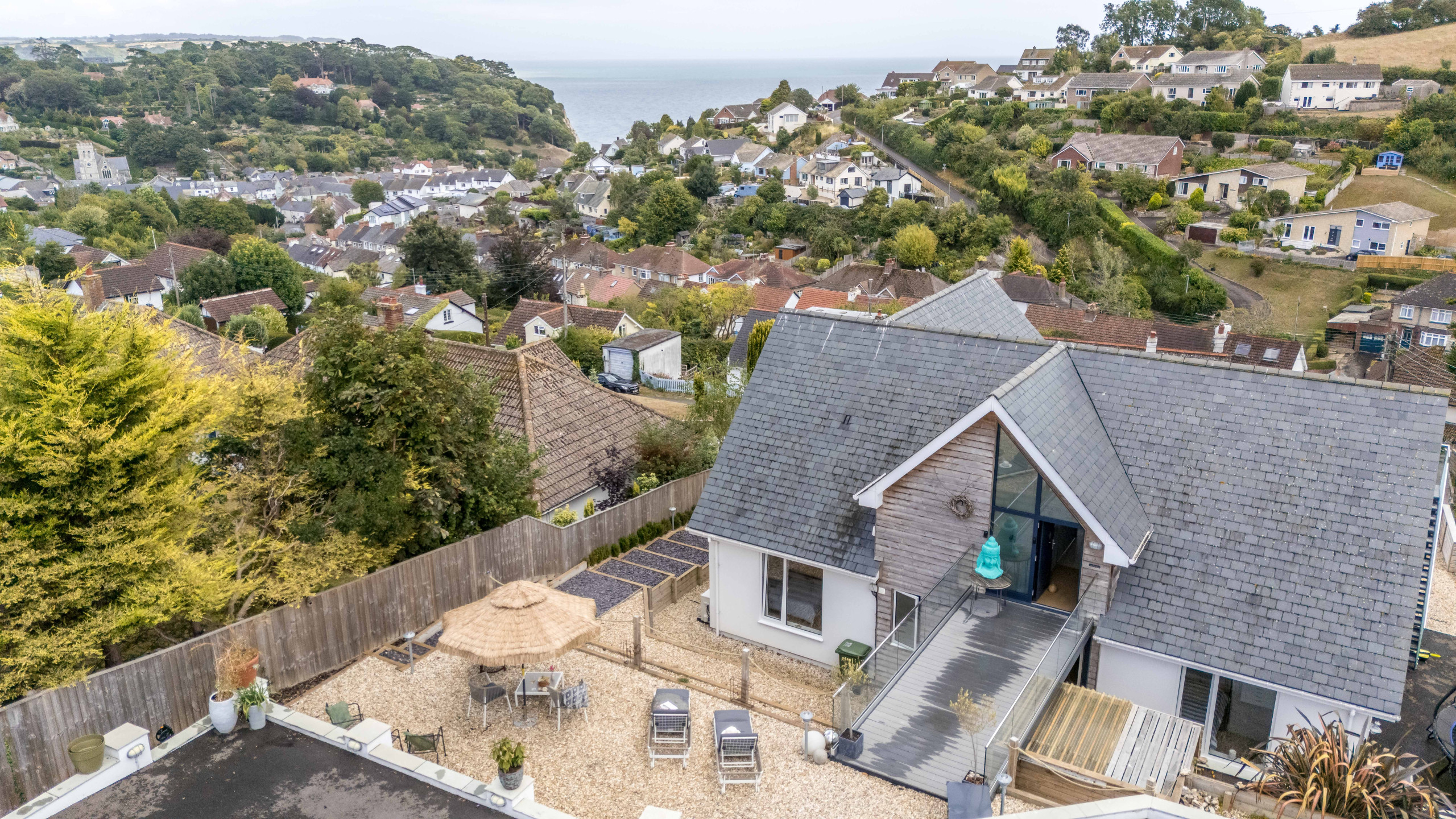 - A dramatic floor-to-ceiling gable window with uninterrupted sea and village views