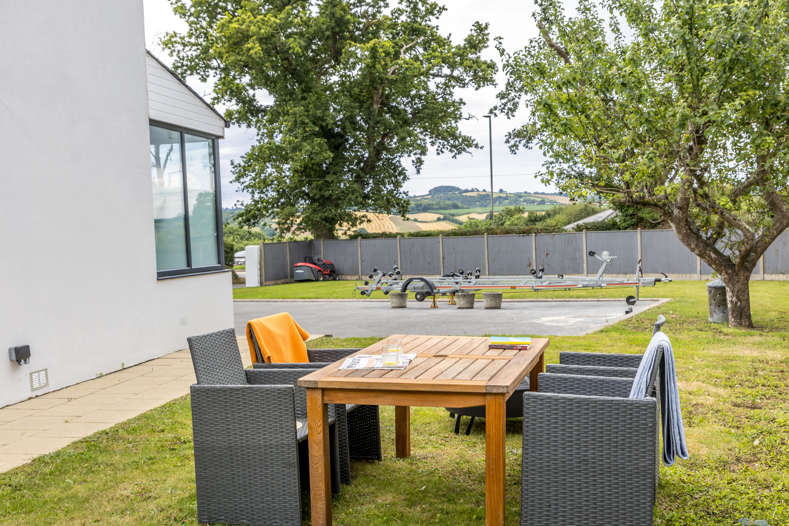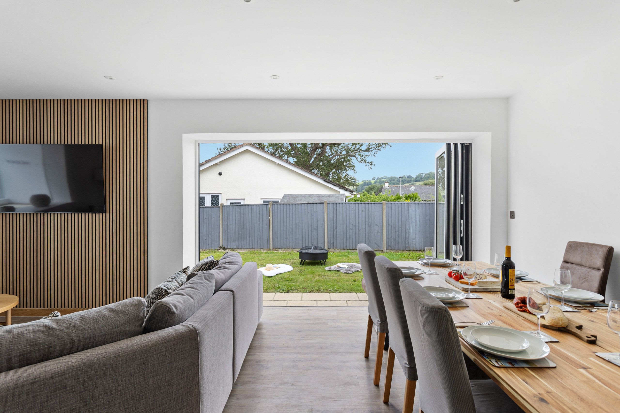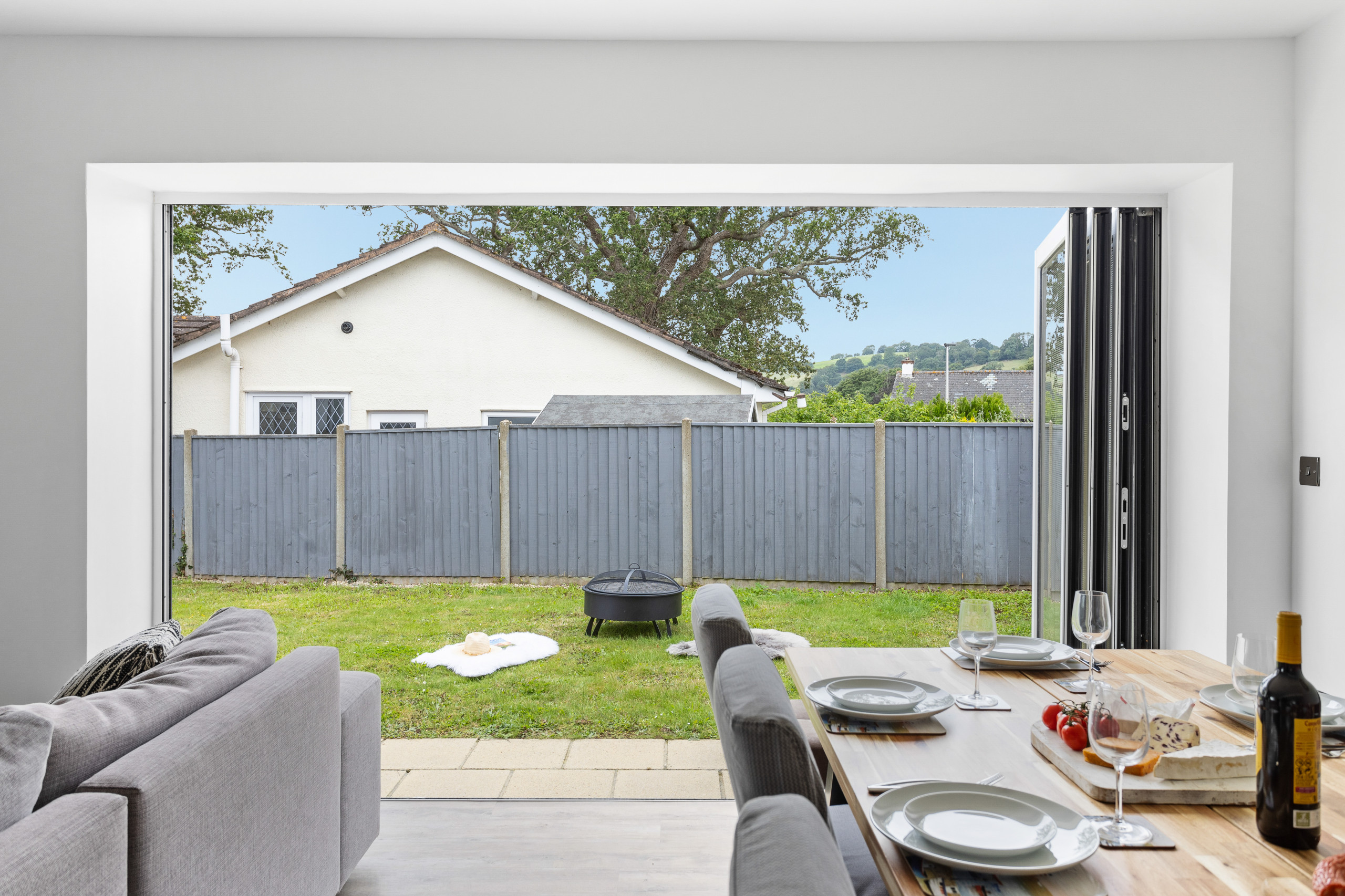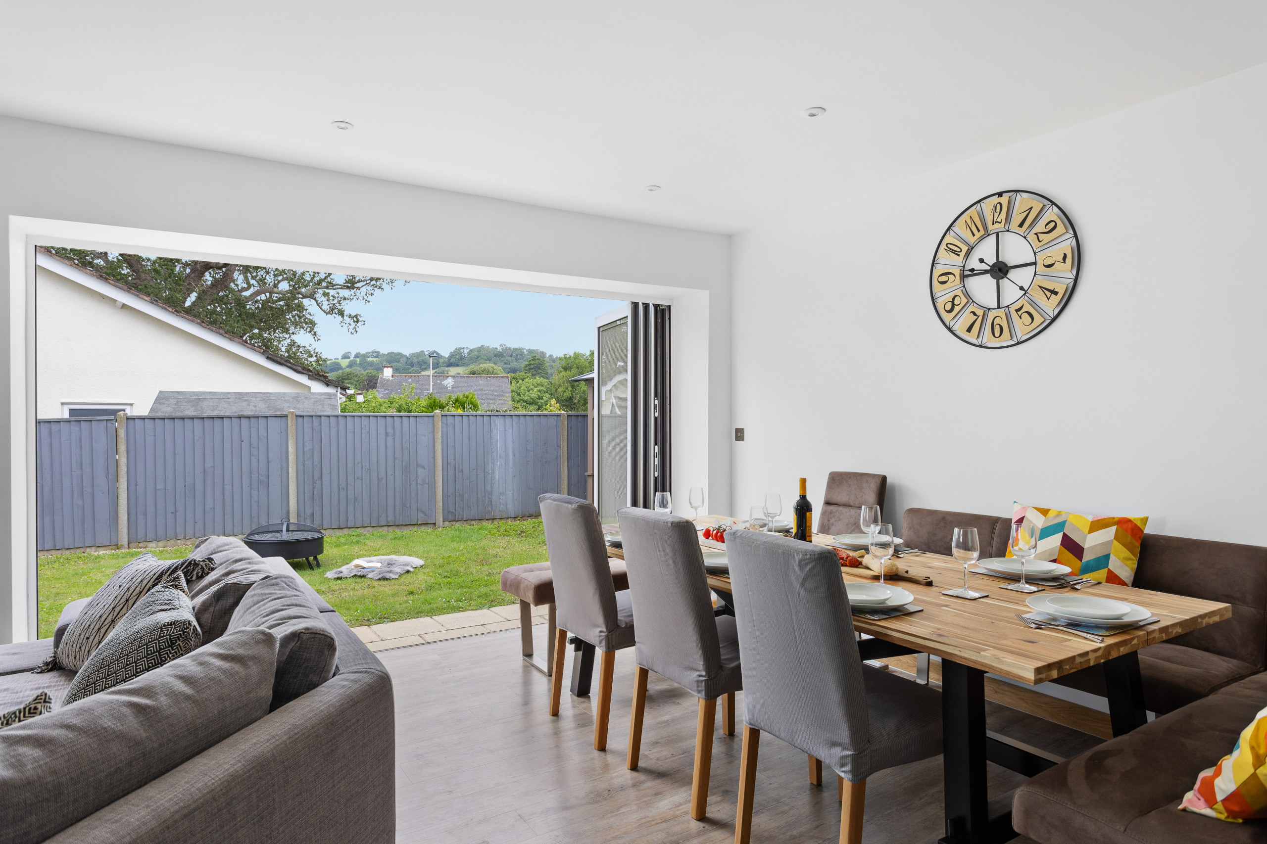 As you approach Greenacre from the sweeping driveway and private front lawn, the welcoming hallway reveals the thoughtfully-designed living and dining zones and kitchen, which seamlessly flow throughout the ground floor. Plush curved sofas invite you to sink in and unwind after a day of exploration. The adjacent dining area also features elegantly curved seating, providing a delightful space at mealtimes. Large bi-fold doors flood the space with natural light, creating a warm and inviting ambience, looking out onto the lawns; and a pleasant seating area protected by a pergola for shade on a hot day or to keep showers at bay. There’s also a snug room (or 5th bedroom), which includes a double sofa bed, large smart TV, electric fire, and comfy chairs.