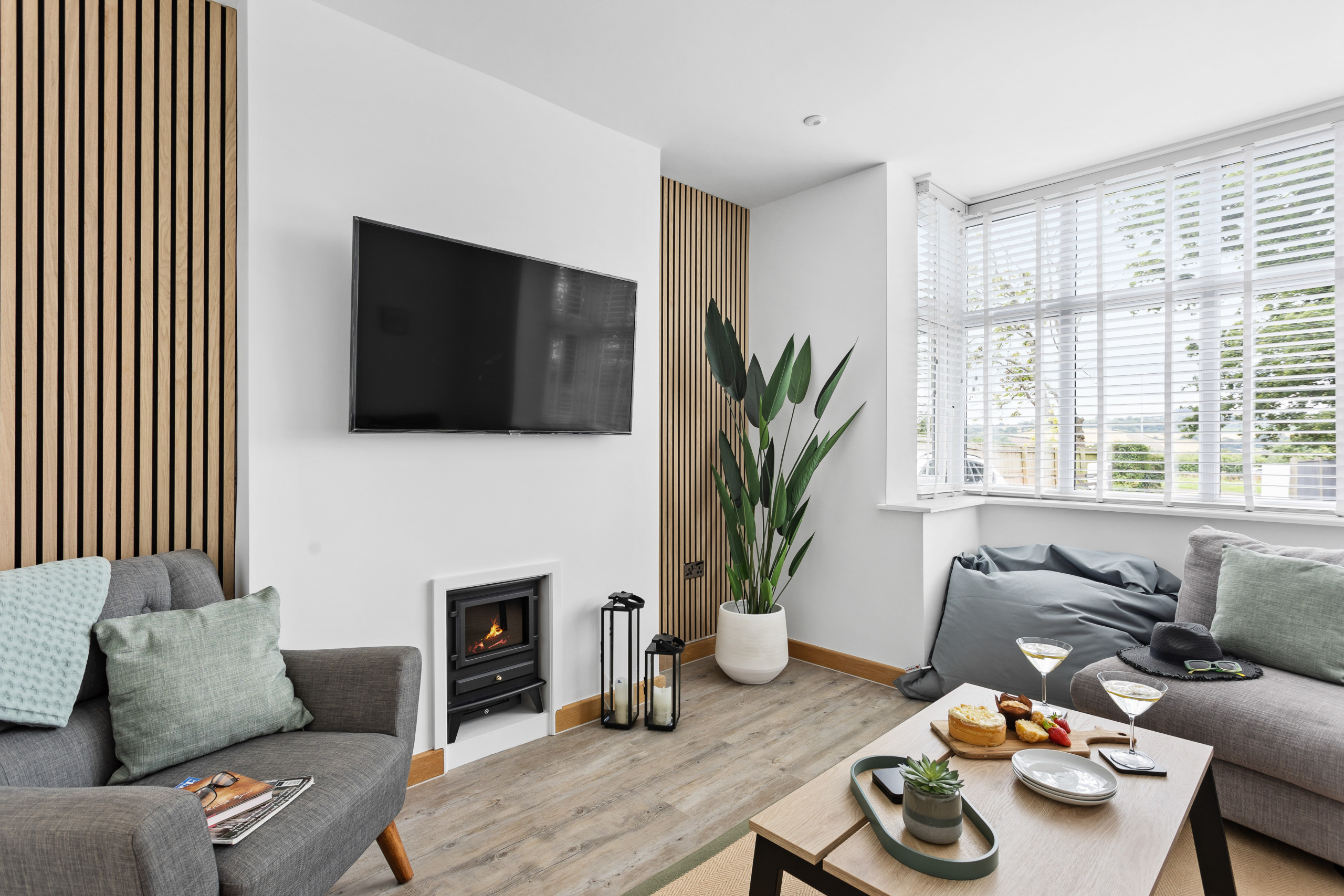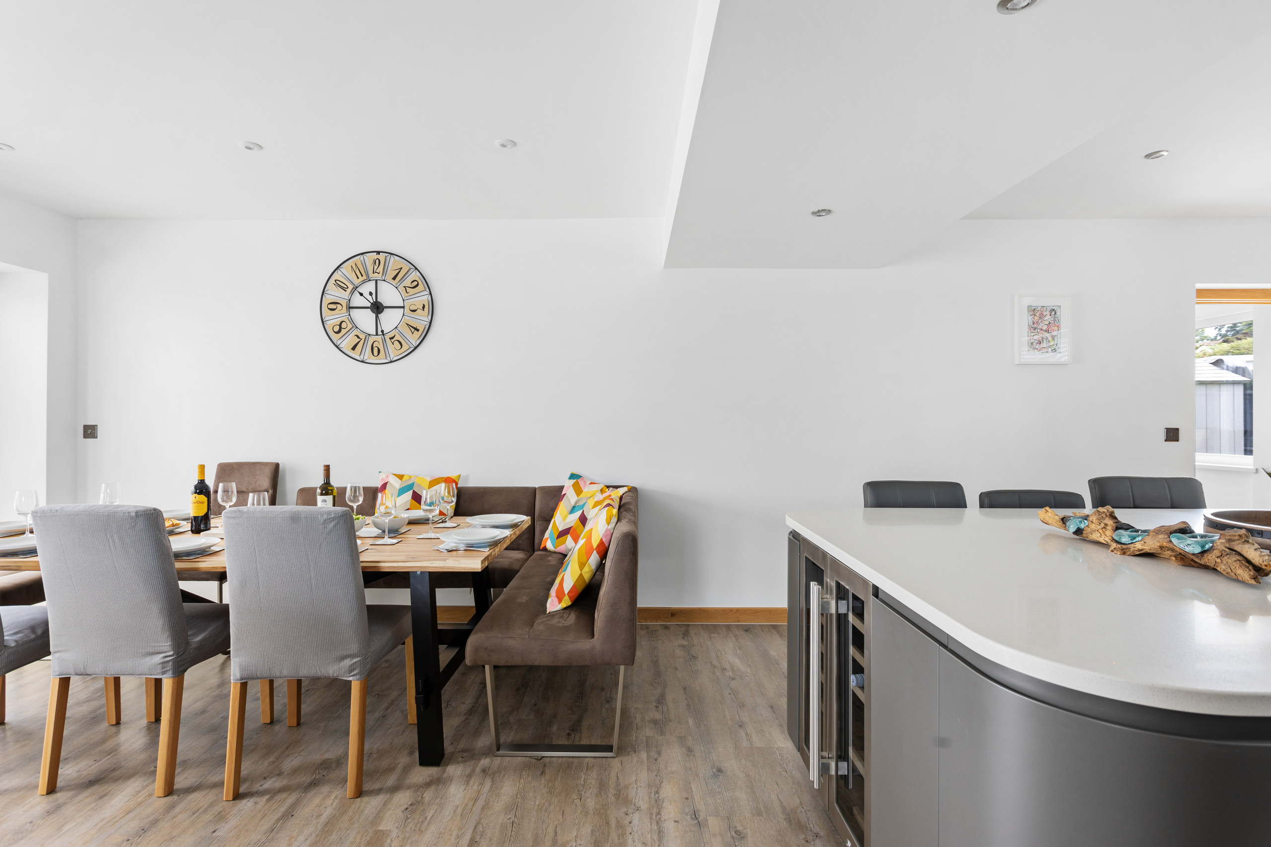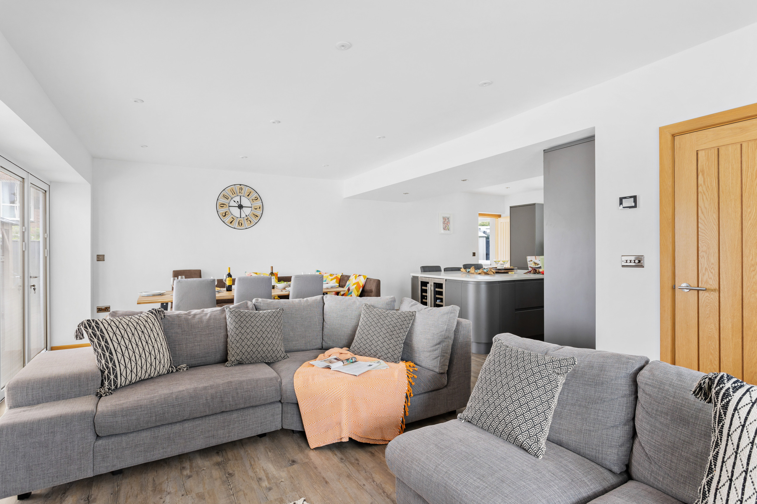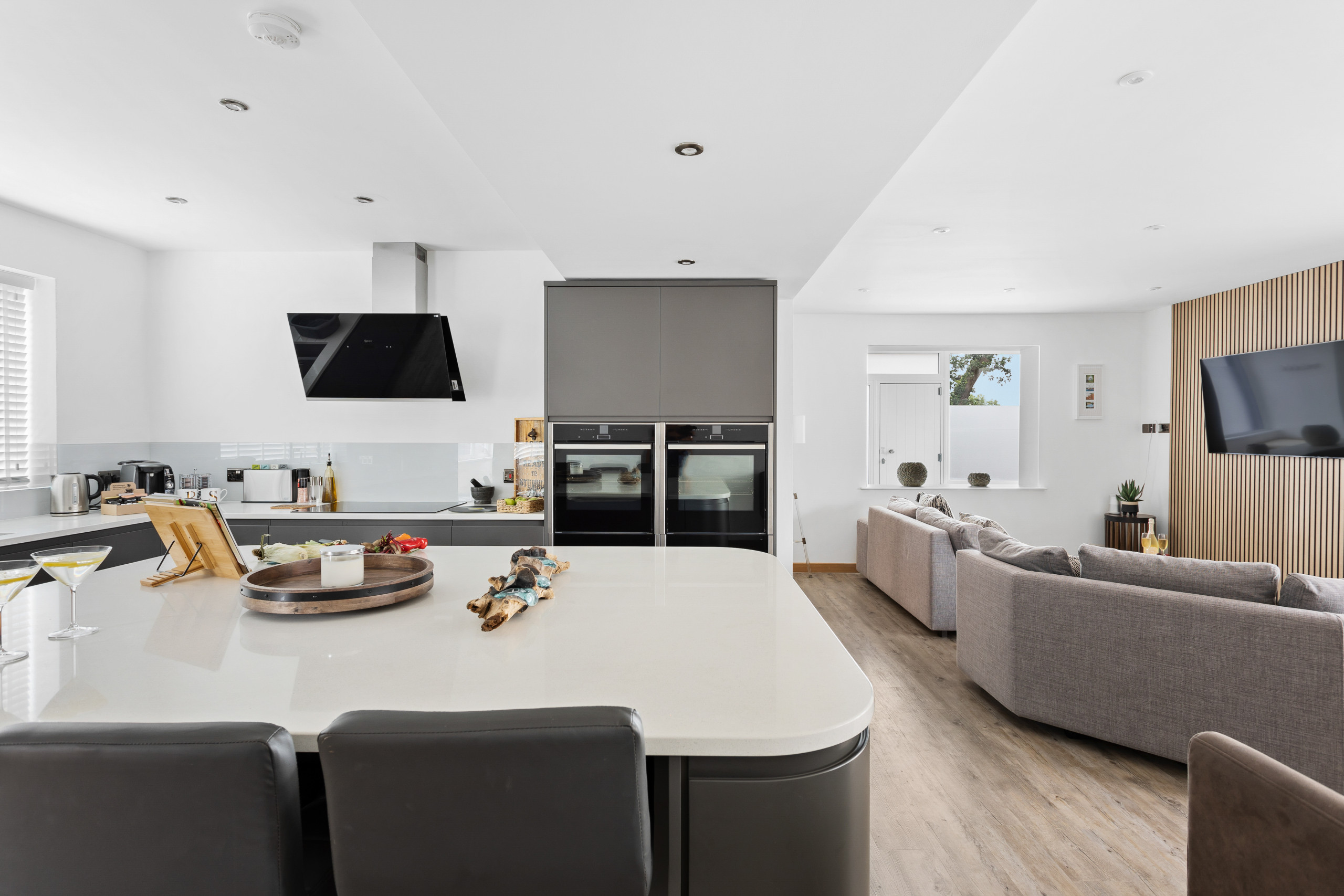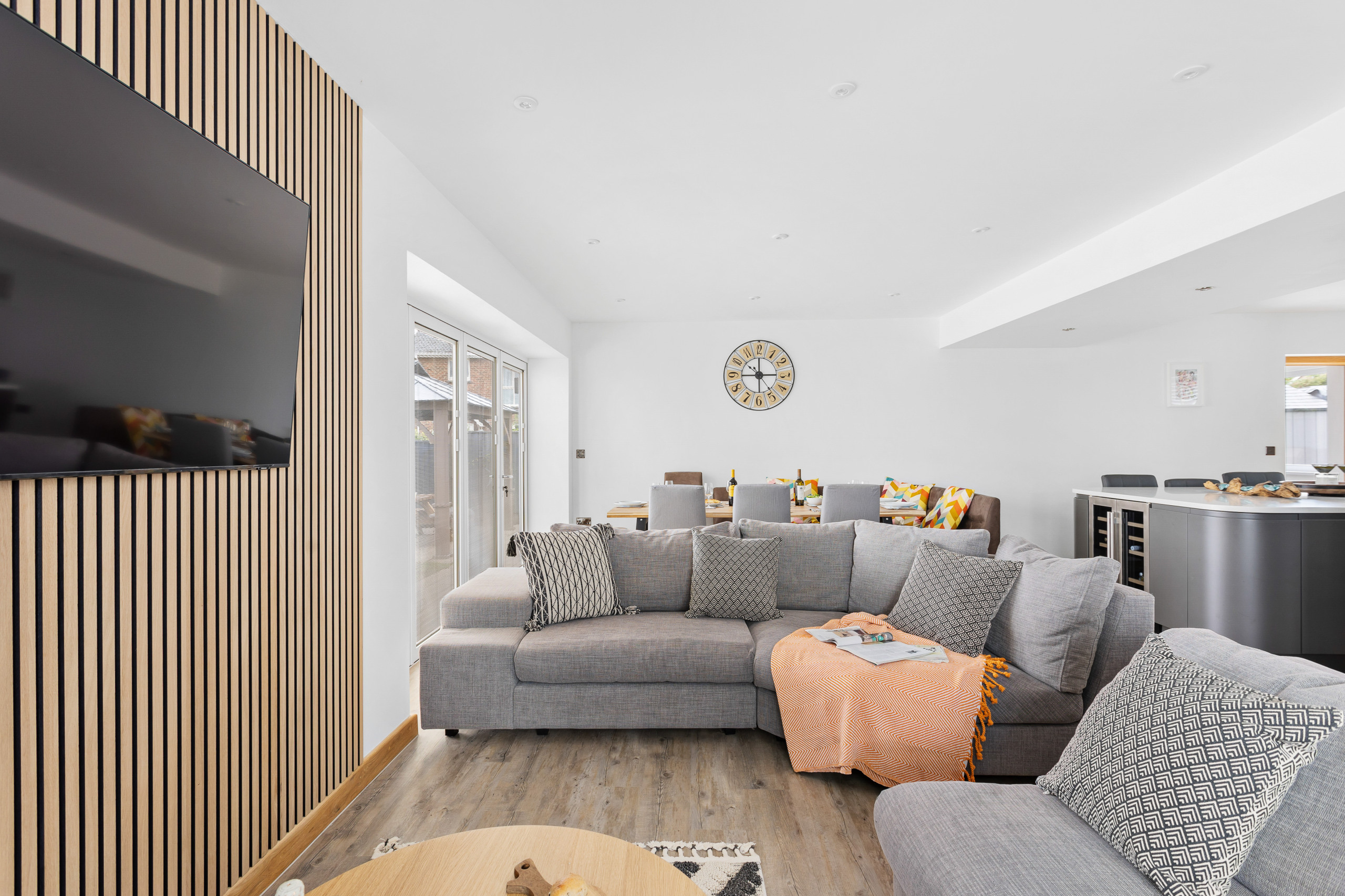 As you approach Greenacre from the sweeping driveway and private front lawn, the welcoming hallway reveals the thoughtfully-designed living and dining zones and kitchen, which seamlessly flow throughout the ground floor. Plush curved sofas invite you to sink in and unwind after a day of exploration. The adjacent dining area also features elegantly curved seating, providing a delightful space at mealtimes. Large bi-fold doors flood the space with natural light, creating a warm and inviting ambience, looking out onto the lawns; and a pleasant seating area protected by a pergola for shade on a hot day or to keep showers at bay. There’s also a snug room (or 5th bedroom), which includes a double sofa bed, large smart TV, electric fire, and comfy chairs.