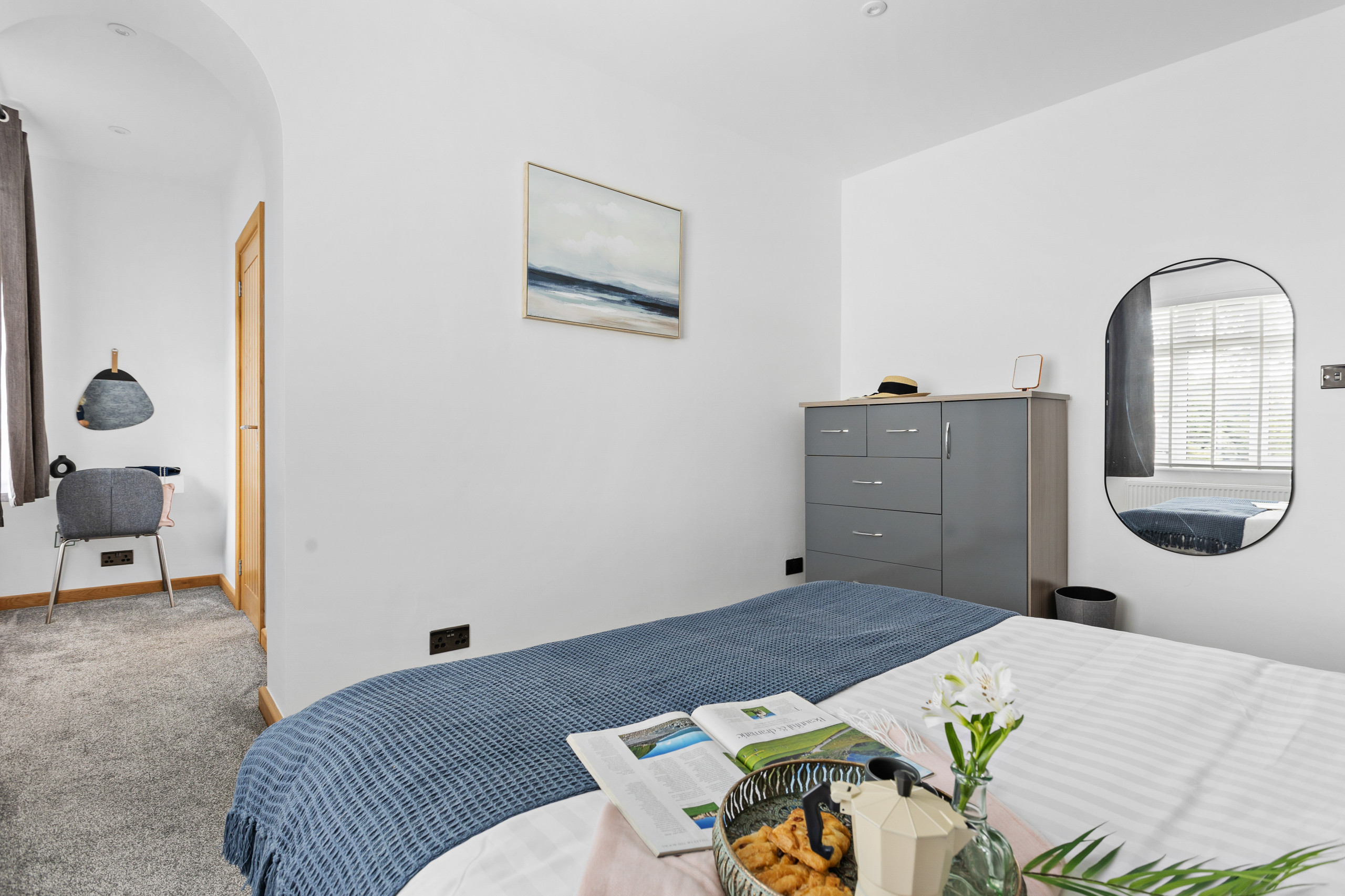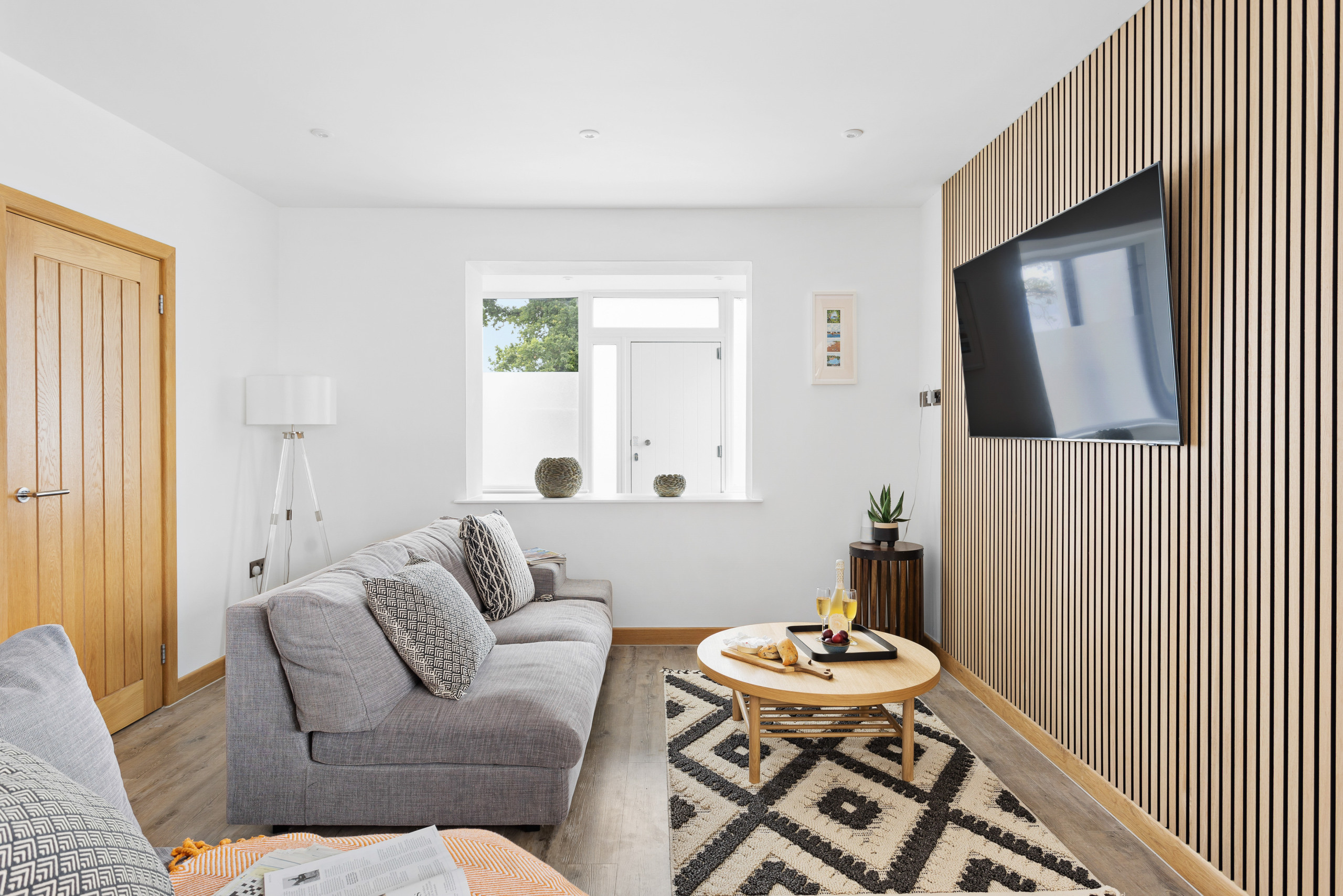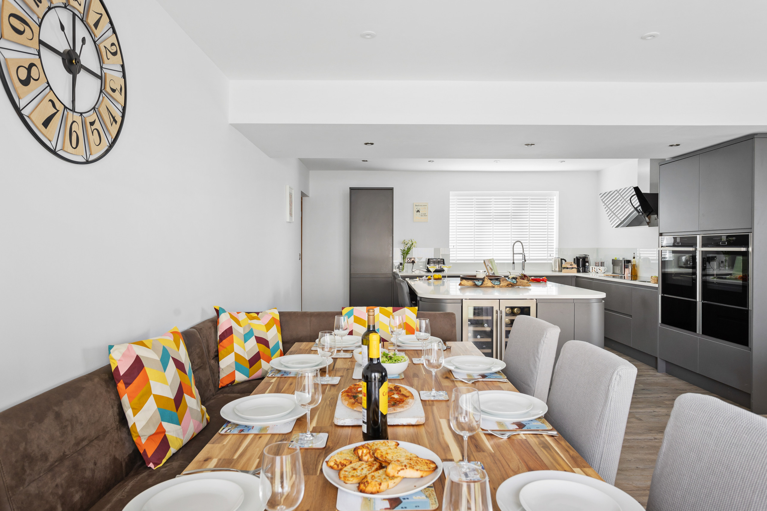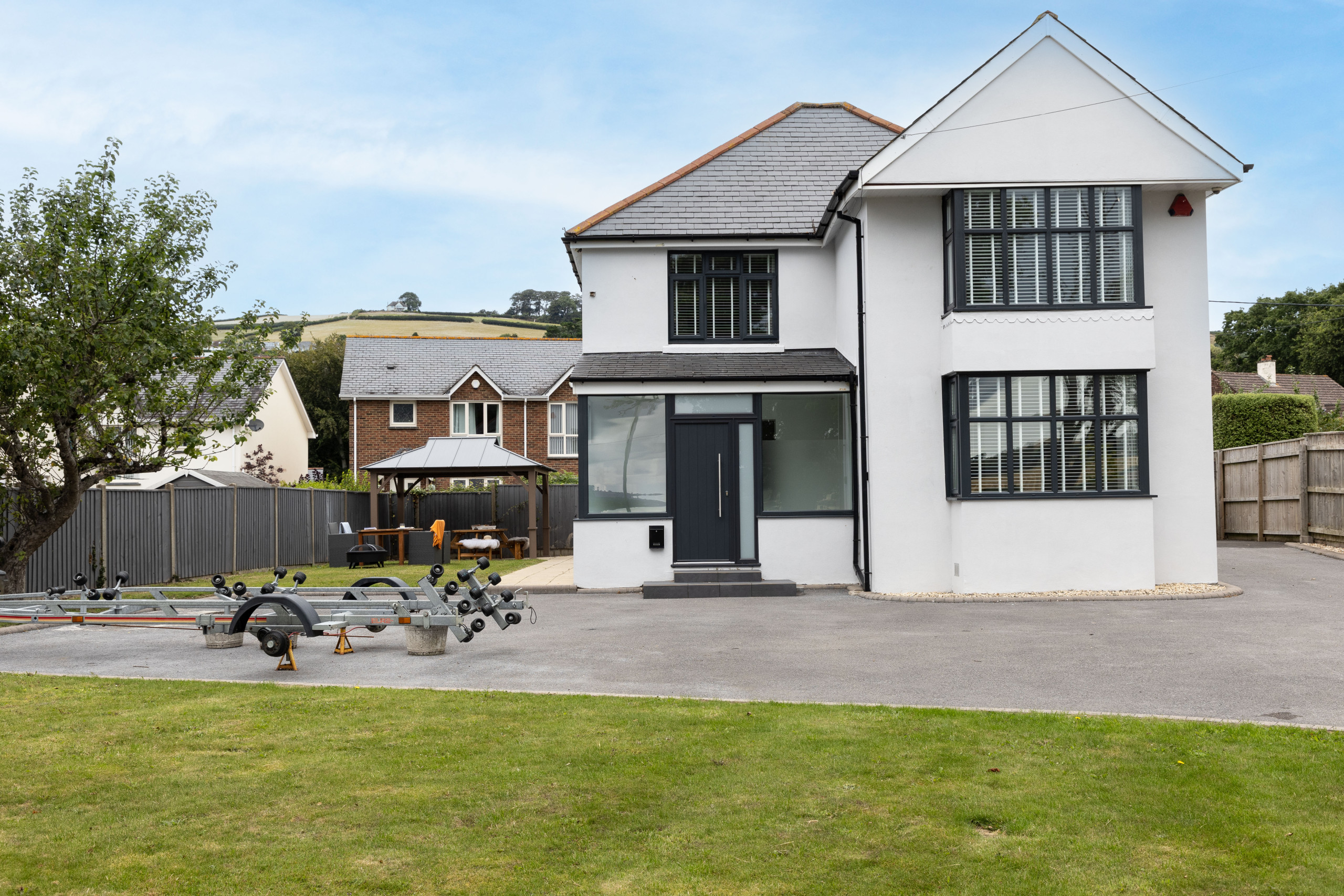 As you approach Greenacre from the sweeping driveway and private front lawn, the welcoming hallway reveals the thoughtfully-designed living and dining zones and kitchen, which seamlessly flow throughout the ground floor. Plush curved sofas invite you to sink in and unwind after a day of exploration. The adjacent dining area also features elegantly curved seating, providing a delightful space at mealtimes. Large bi-fold doors flood the space with natural light, creating a warm and inviting ambience, looking out onto the lawns; and a pleasant seating area protected by a pergola for shade on a hot day or to keep showers at bay. There’s also a snug room (or 5th bedroom), which includes a double sofa bed, large smart TV, electric fire, and comfy chairs.