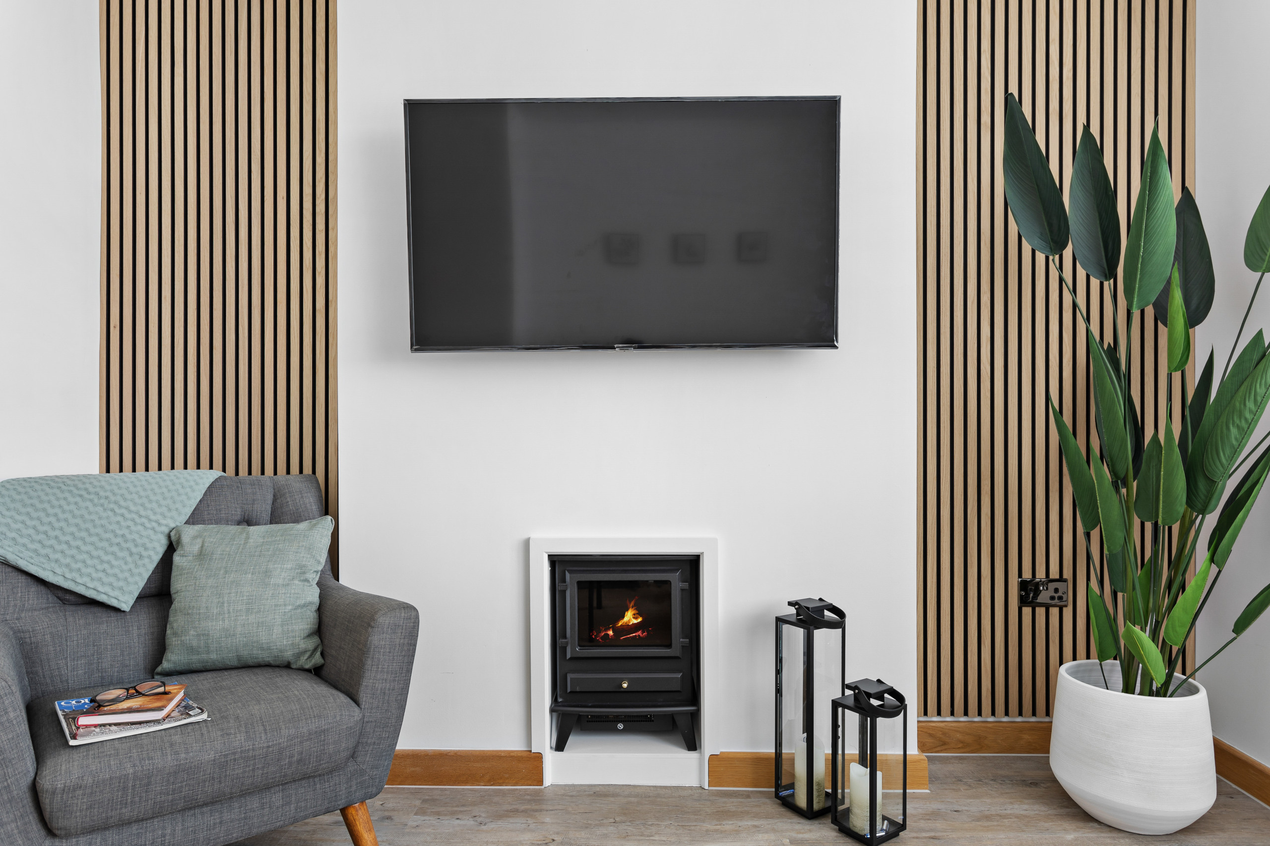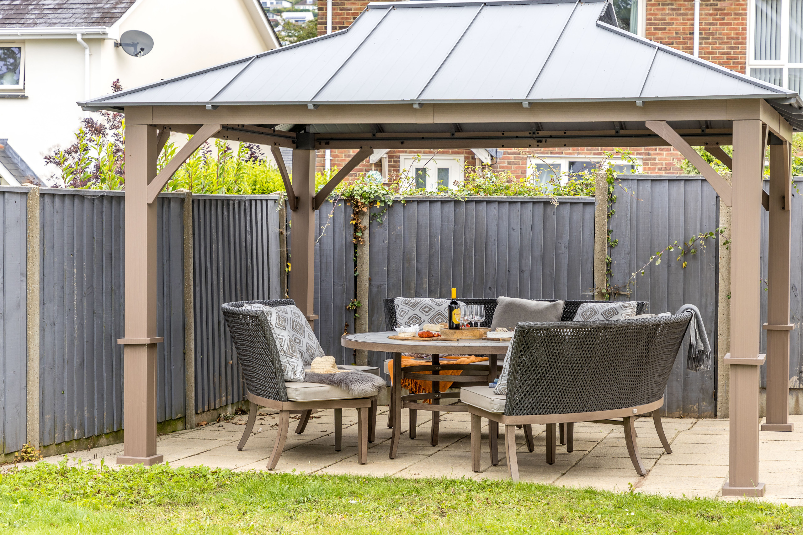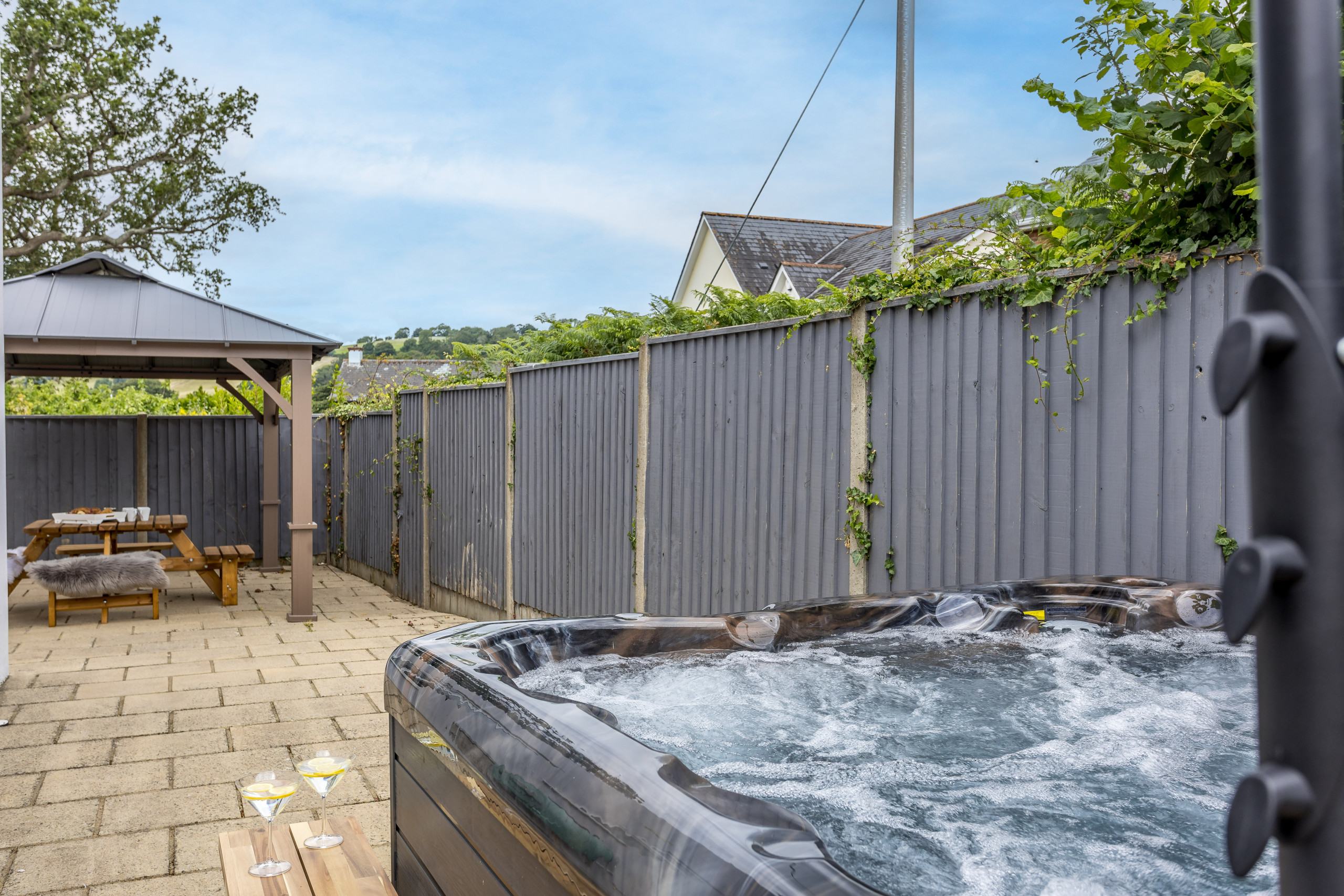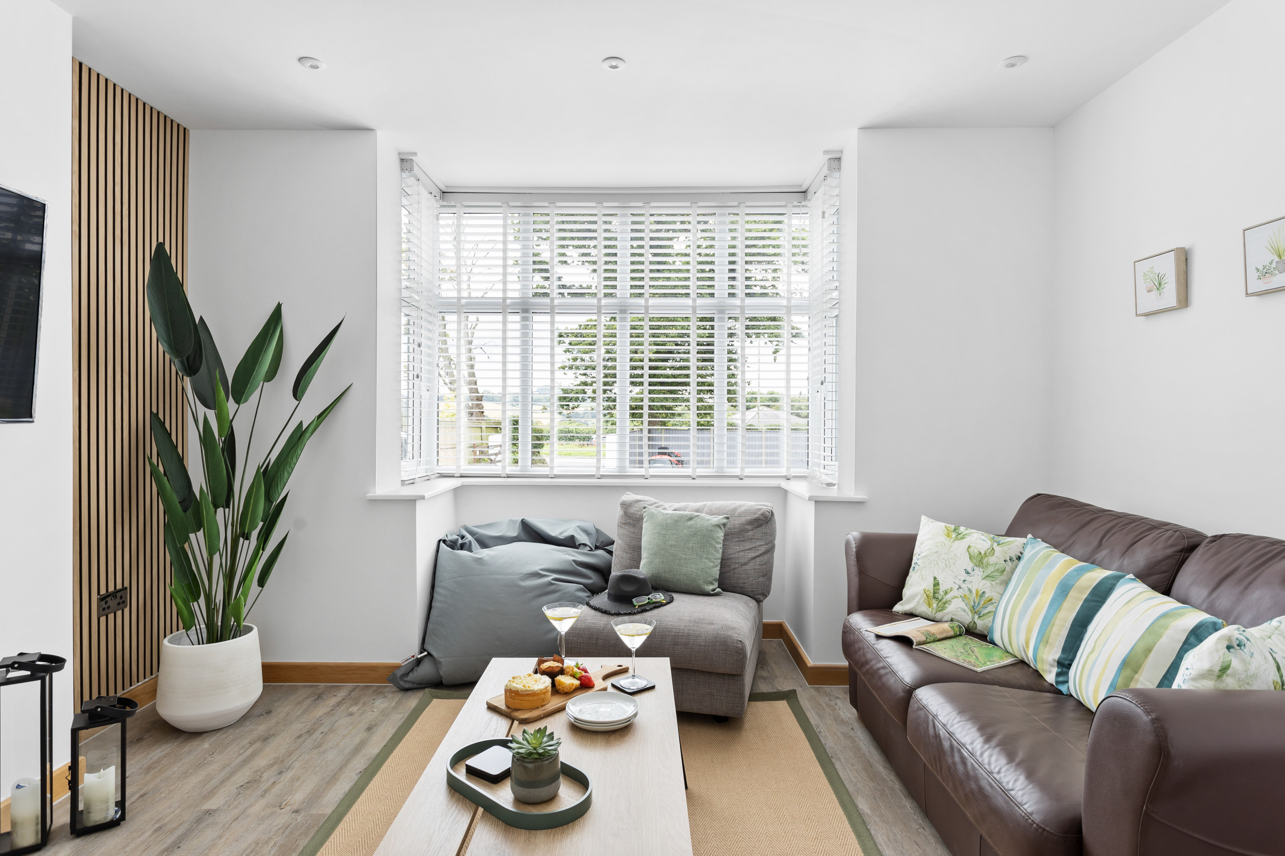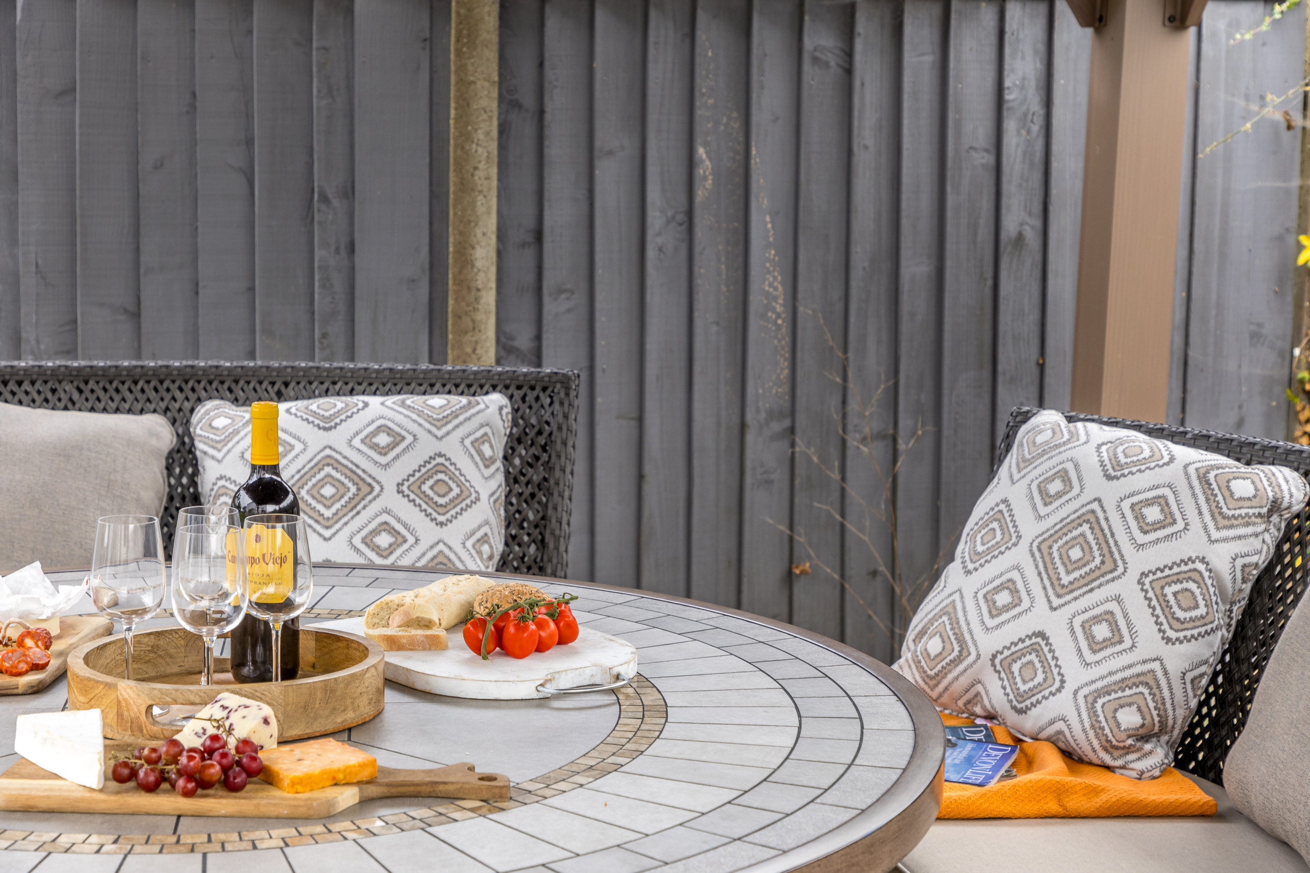 As you approach Greenacre from the sweeping driveway and private front lawn, the welcoming hallway reveals the thoughtfully-designed living and dining zones and kitchen, which seamlessly flow throughout the ground floor. Plush curved sofas invite you to sink in and unwind after a day of exploration. The adjacent dining area also features elegantly curved seating, providing a delightful space at mealtimes. Large bi-fold doors flood the space with natural light, creating a warm and inviting ambience, looking out onto the lawns; and a pleasant seating area protected by a pergola for shade on a hot day or to keep showers at bay. There’s also a snug room (or 5th bedroom), which includes a double sofa bed, large smart TV, electric fire, and comfy chairs.