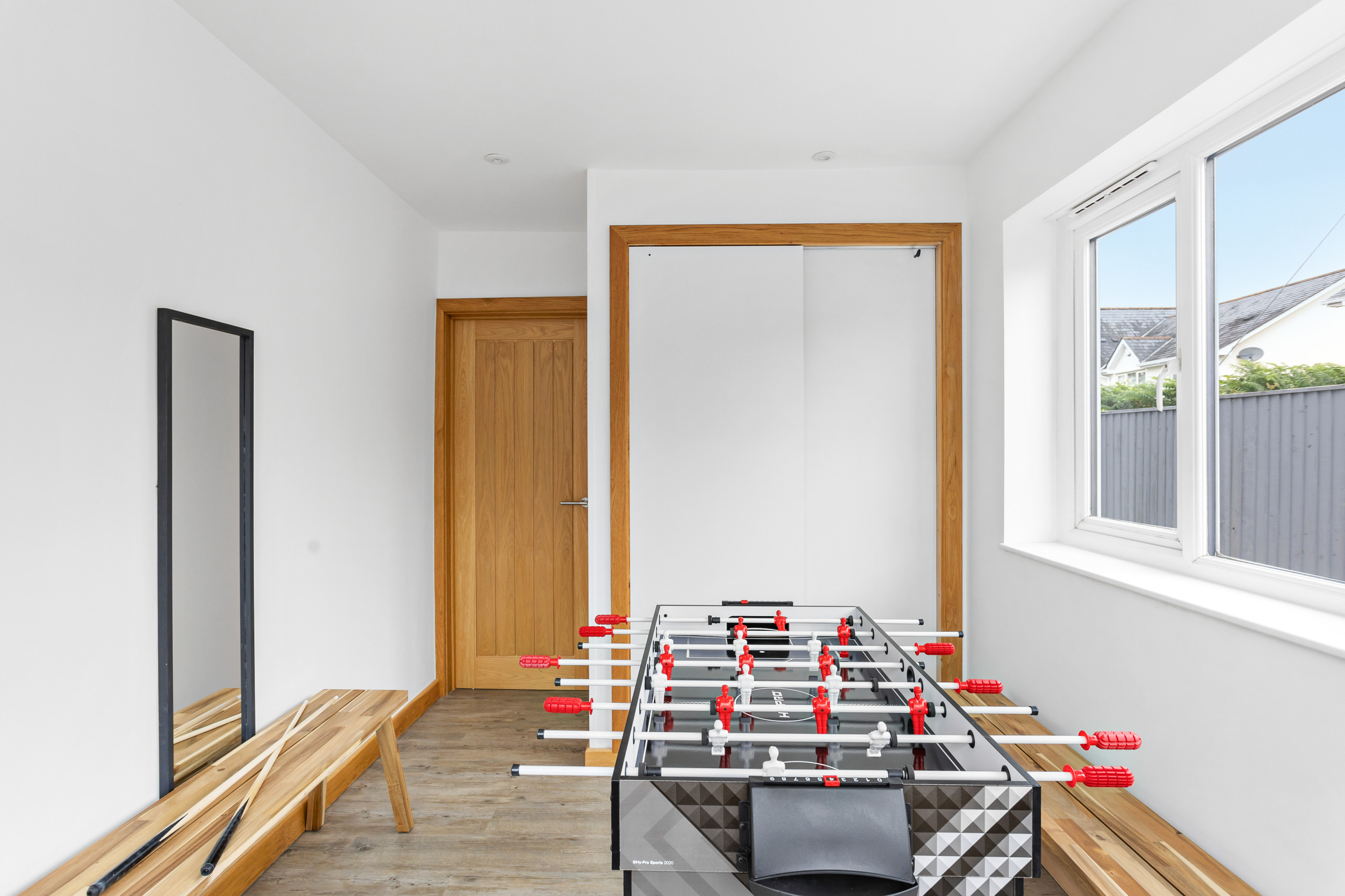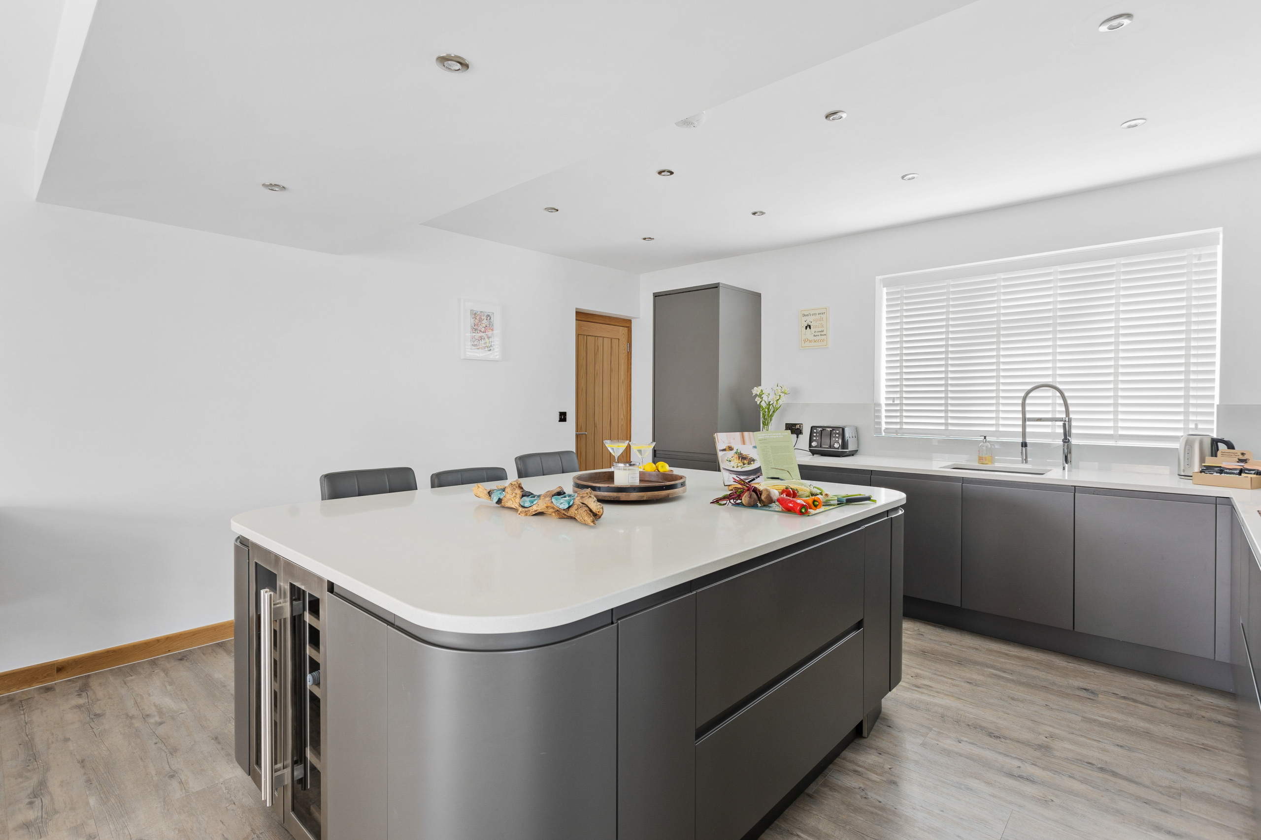 The expansive kitchen exudes elegant functionality. White quartz surfaces contrast the darkened fossil-grey cabinets, incorporating high-quality built-in appliances, plus a large island and wine refrigerator, making meal preparation an absolute joy for both amateur cooks and seasoned chefs. To the rear of the kitchen, there's an open utility area with shower room with wash basin and WC in addition to separate area with table-top football for the kids to play (without the noise).