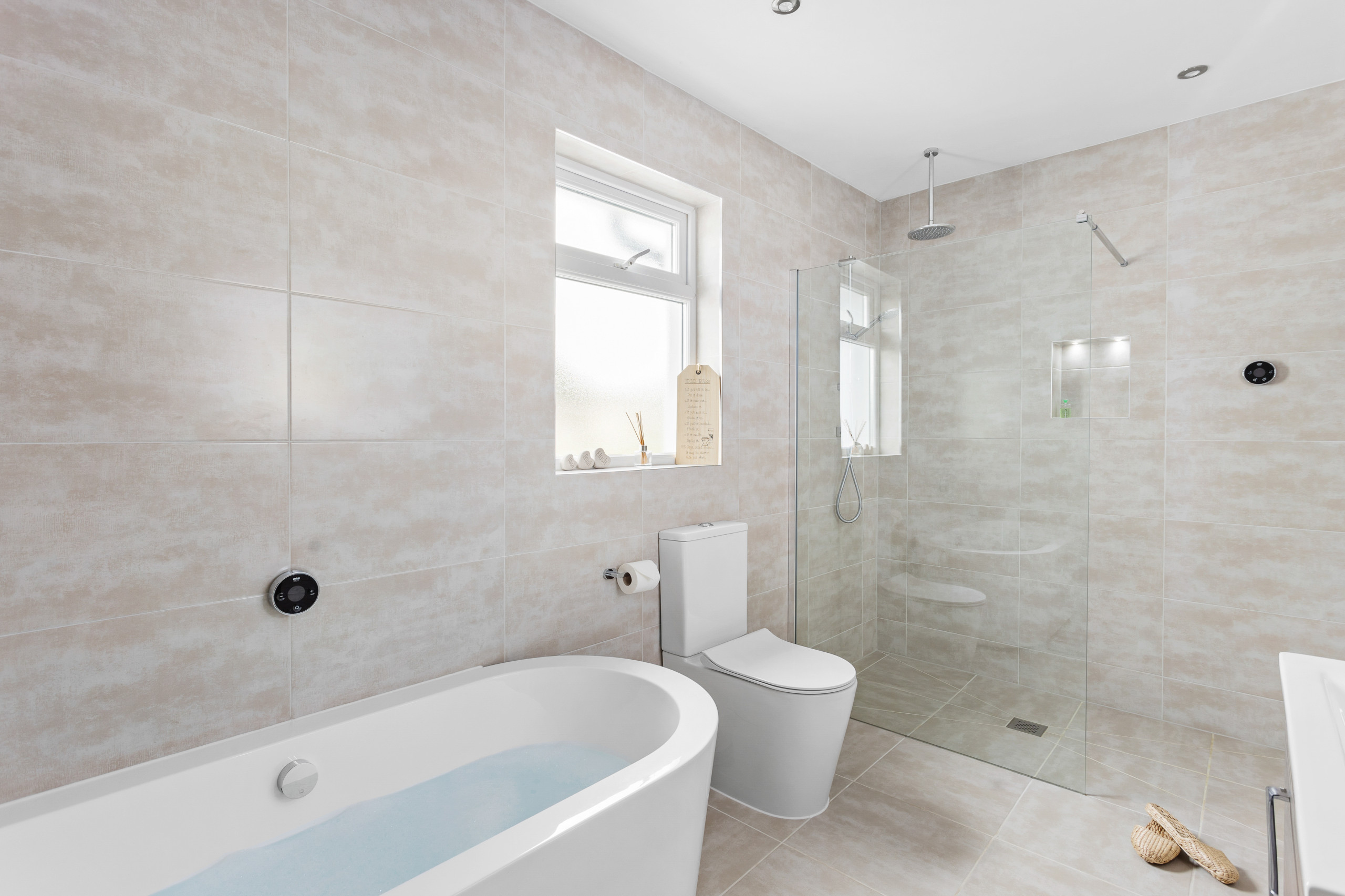 The family bathroom on this level features an extra-large bath with fountain taps and overhead shower, and a mandarin stone basin.