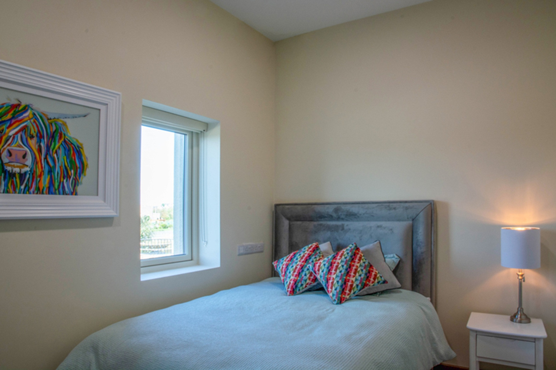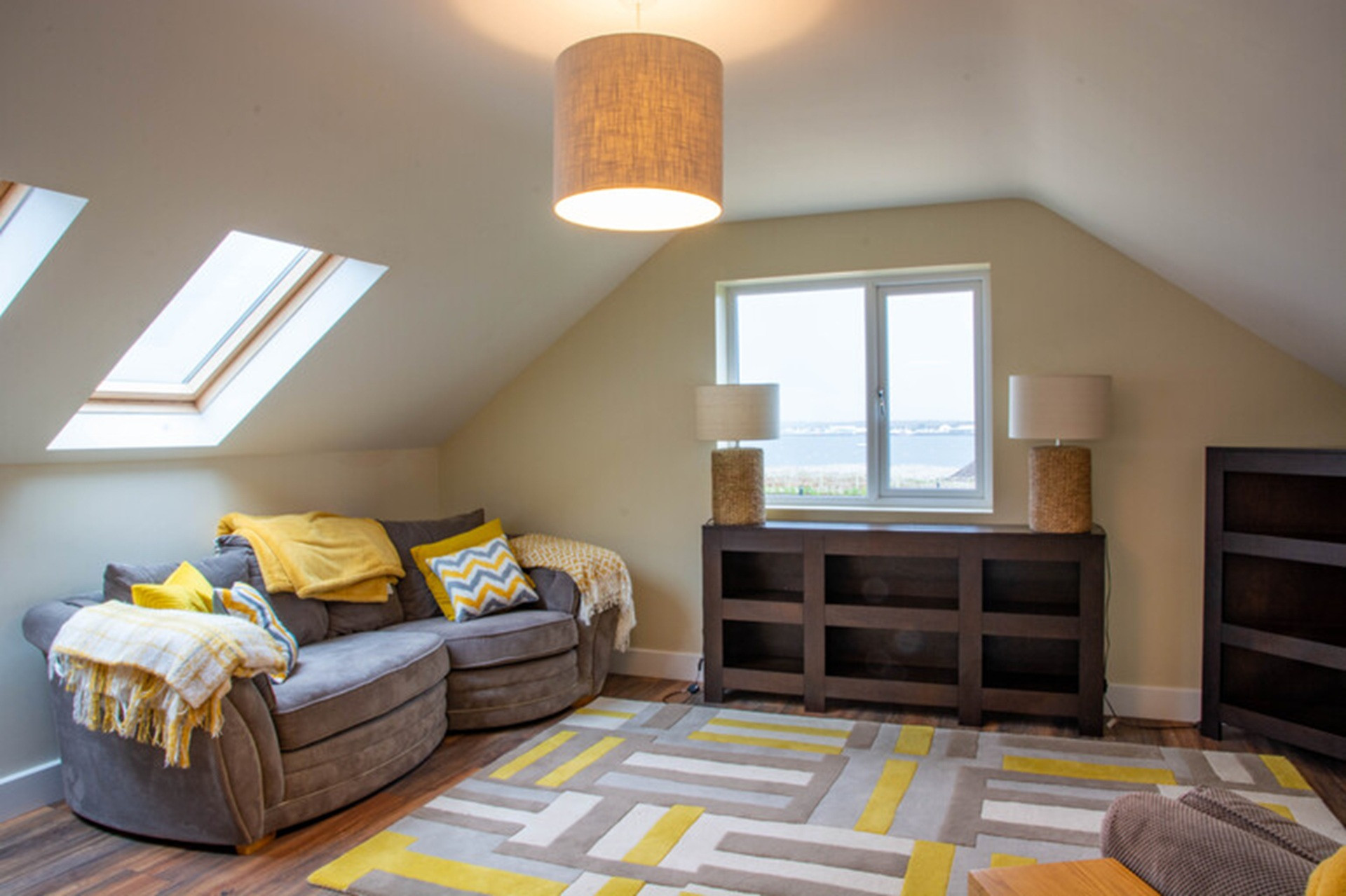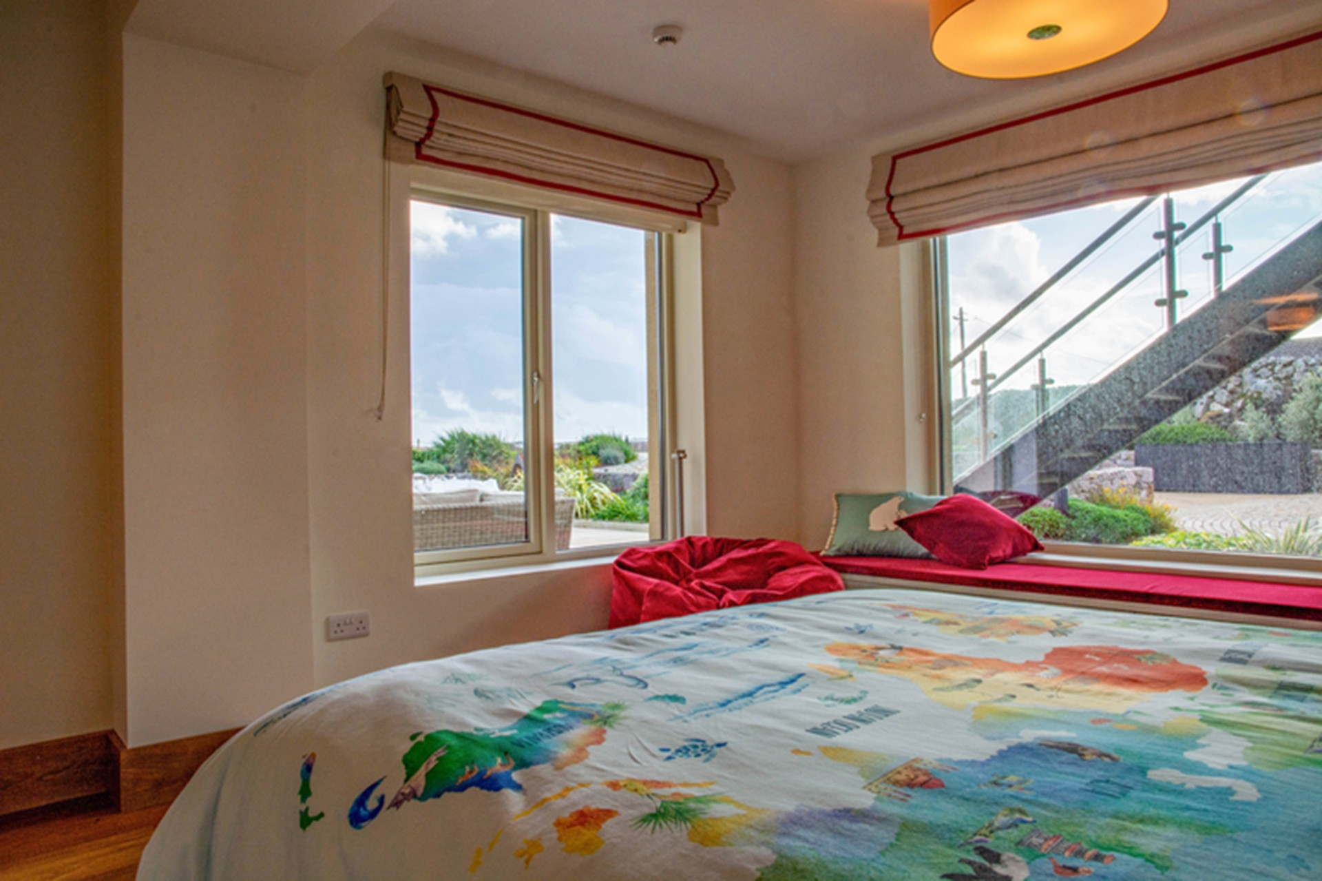 Beside it is a colourful twin bedroom, also with dual aspect views and an ensuite bathroom – kids will love it. Complete with Lego, Fuzzball table and family board games.