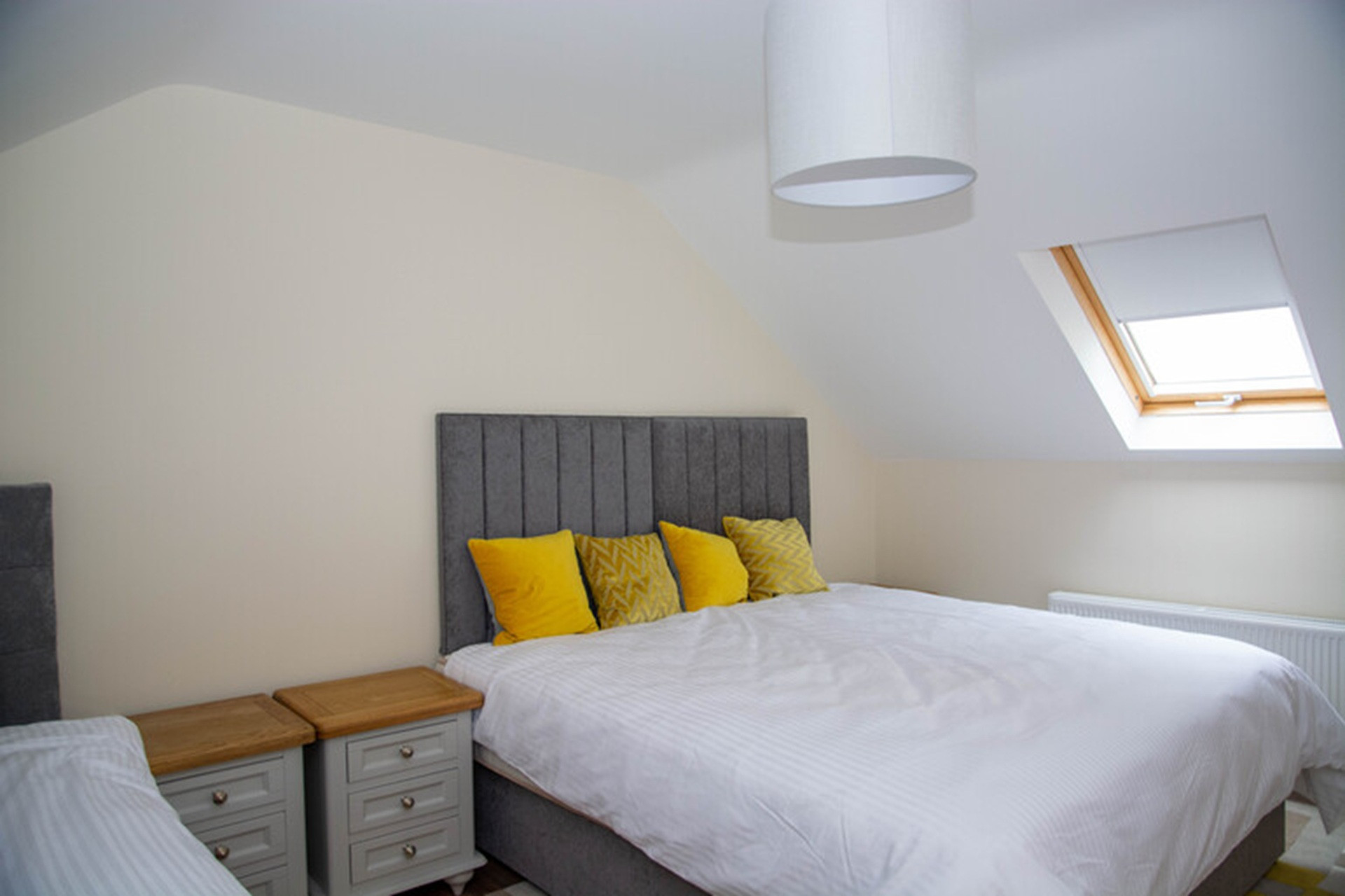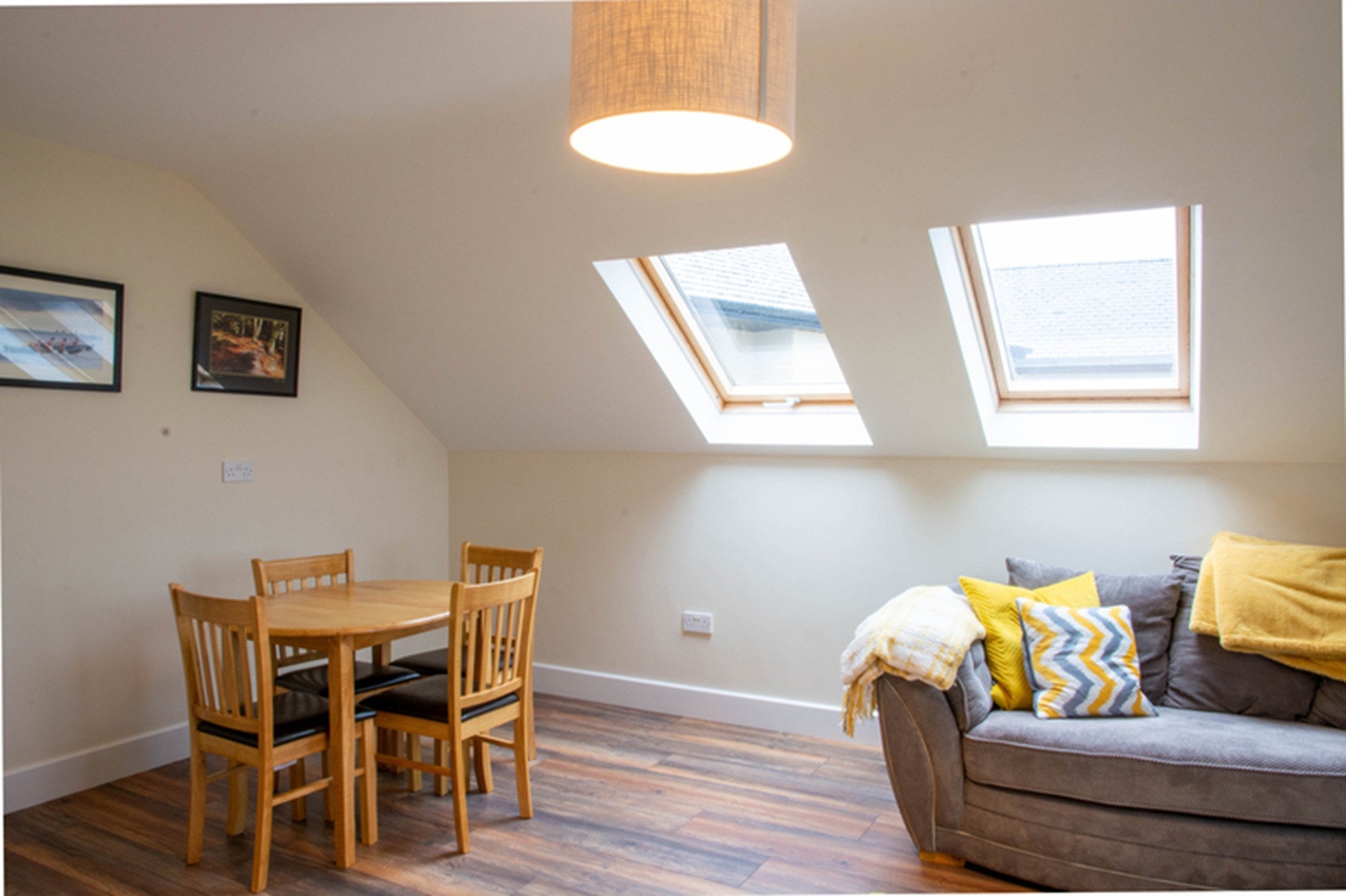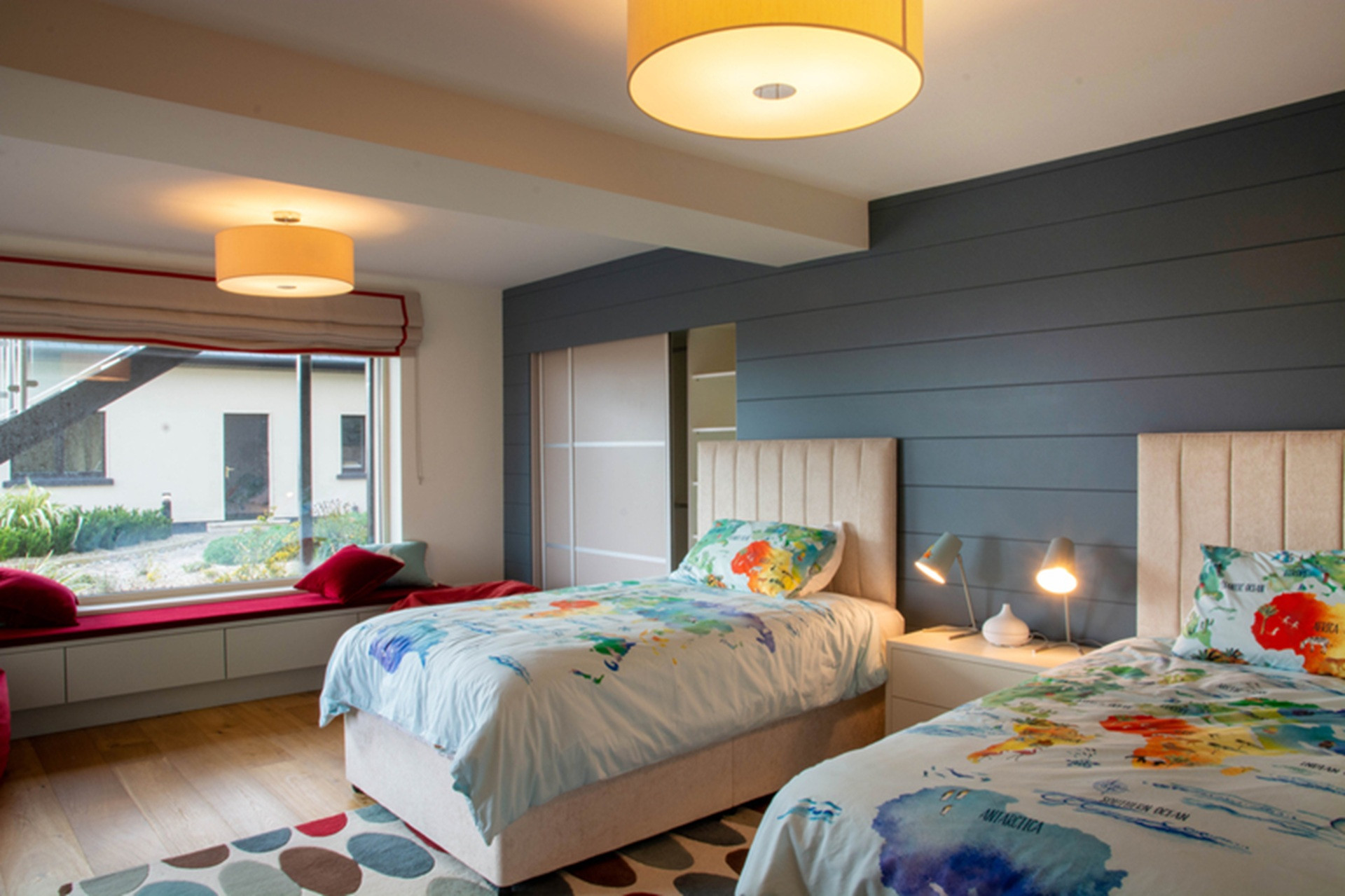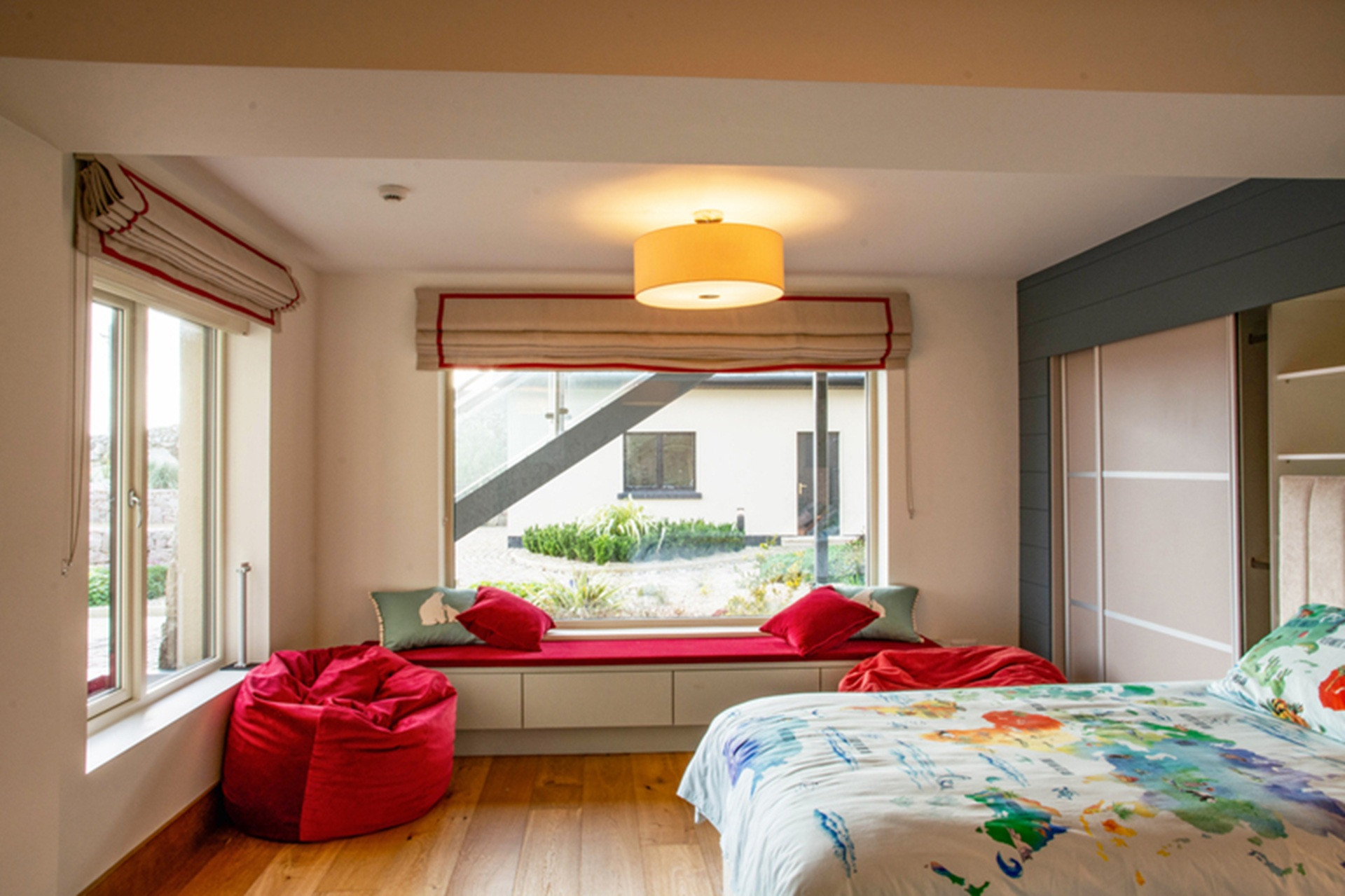 Beside it is a colourful twin bedroom, also with dual aspect views and an ensuite bathroom – kids will love it. Complete with Lego, Fuzzball table and family board games.