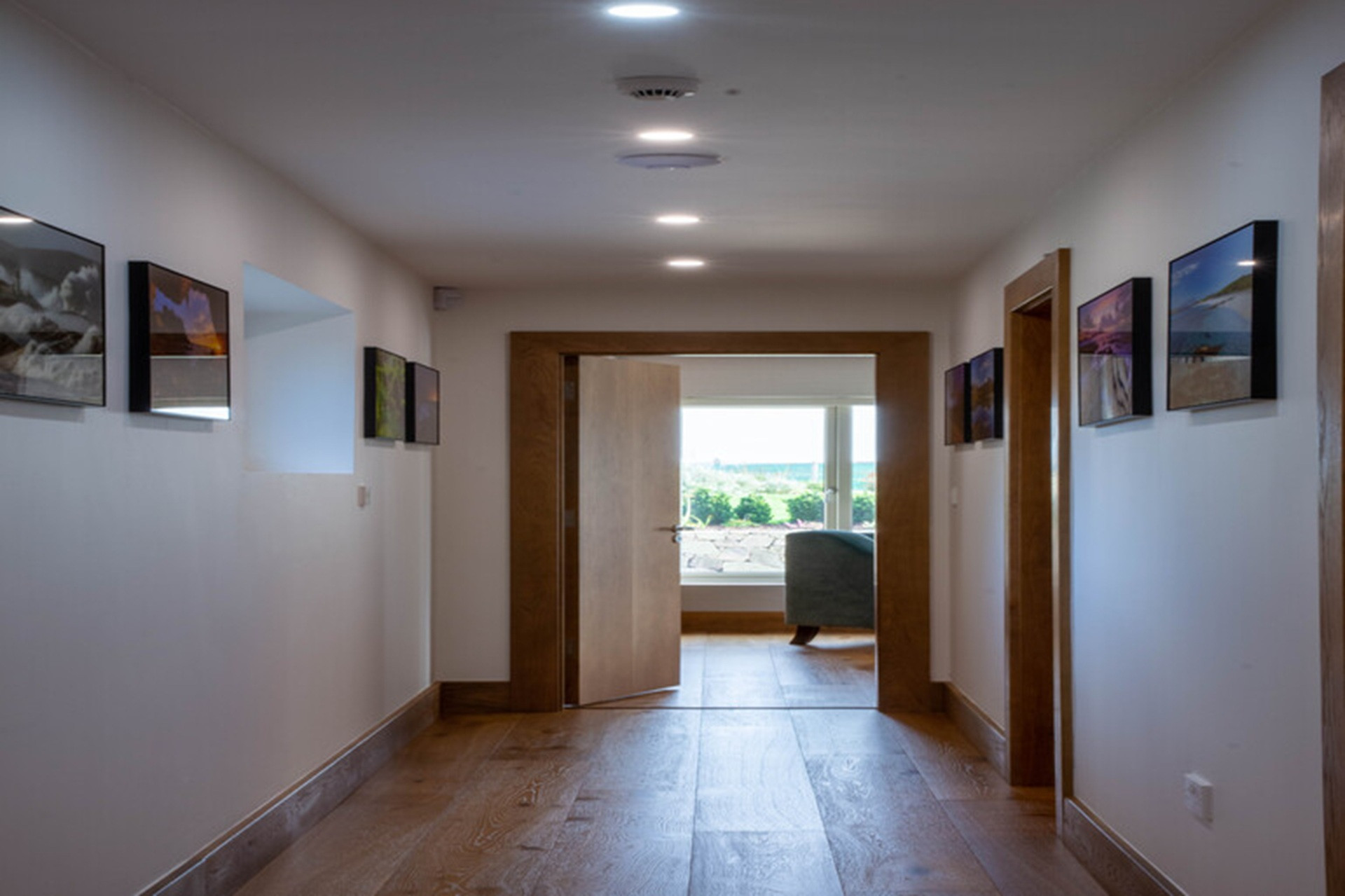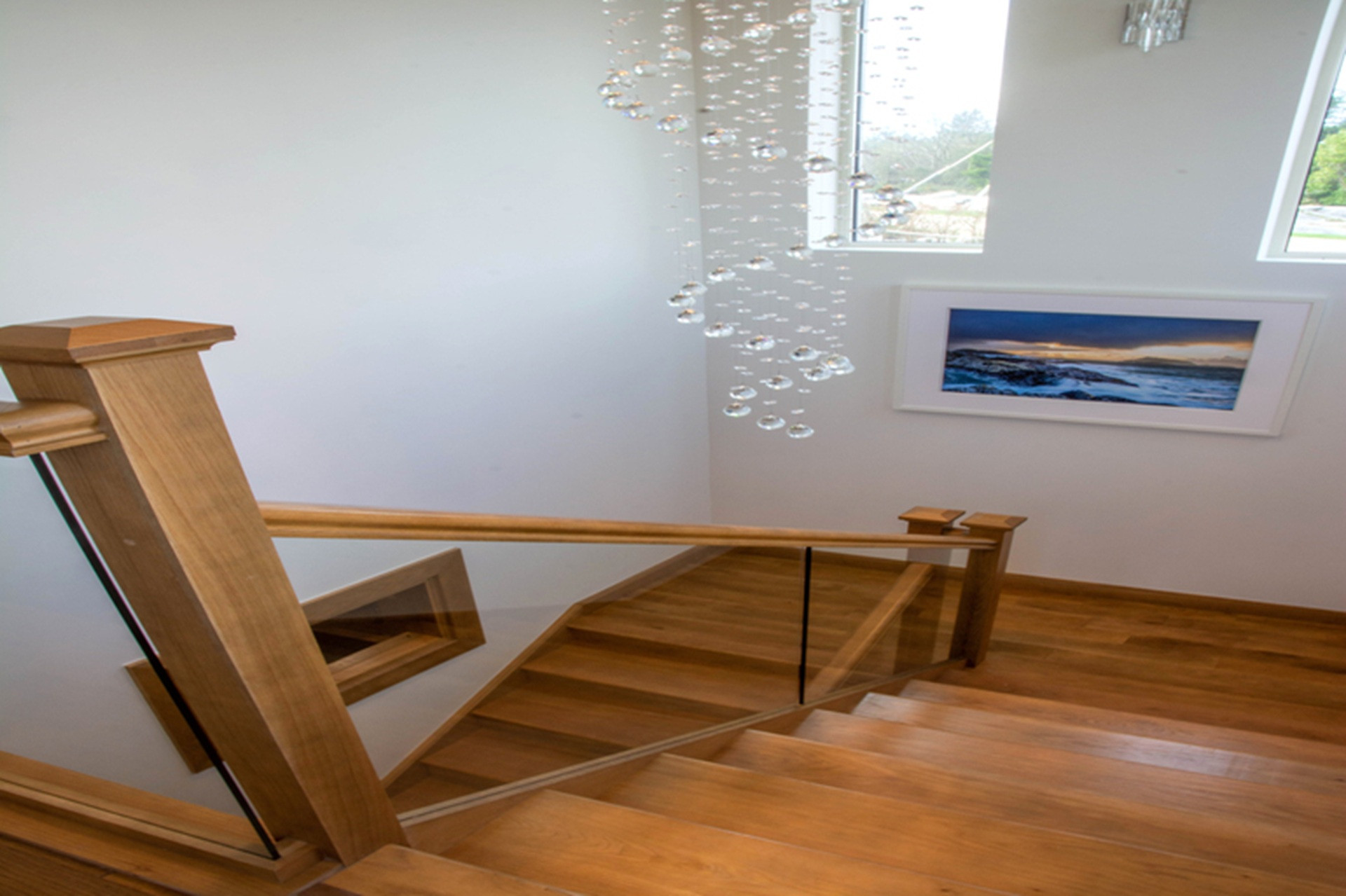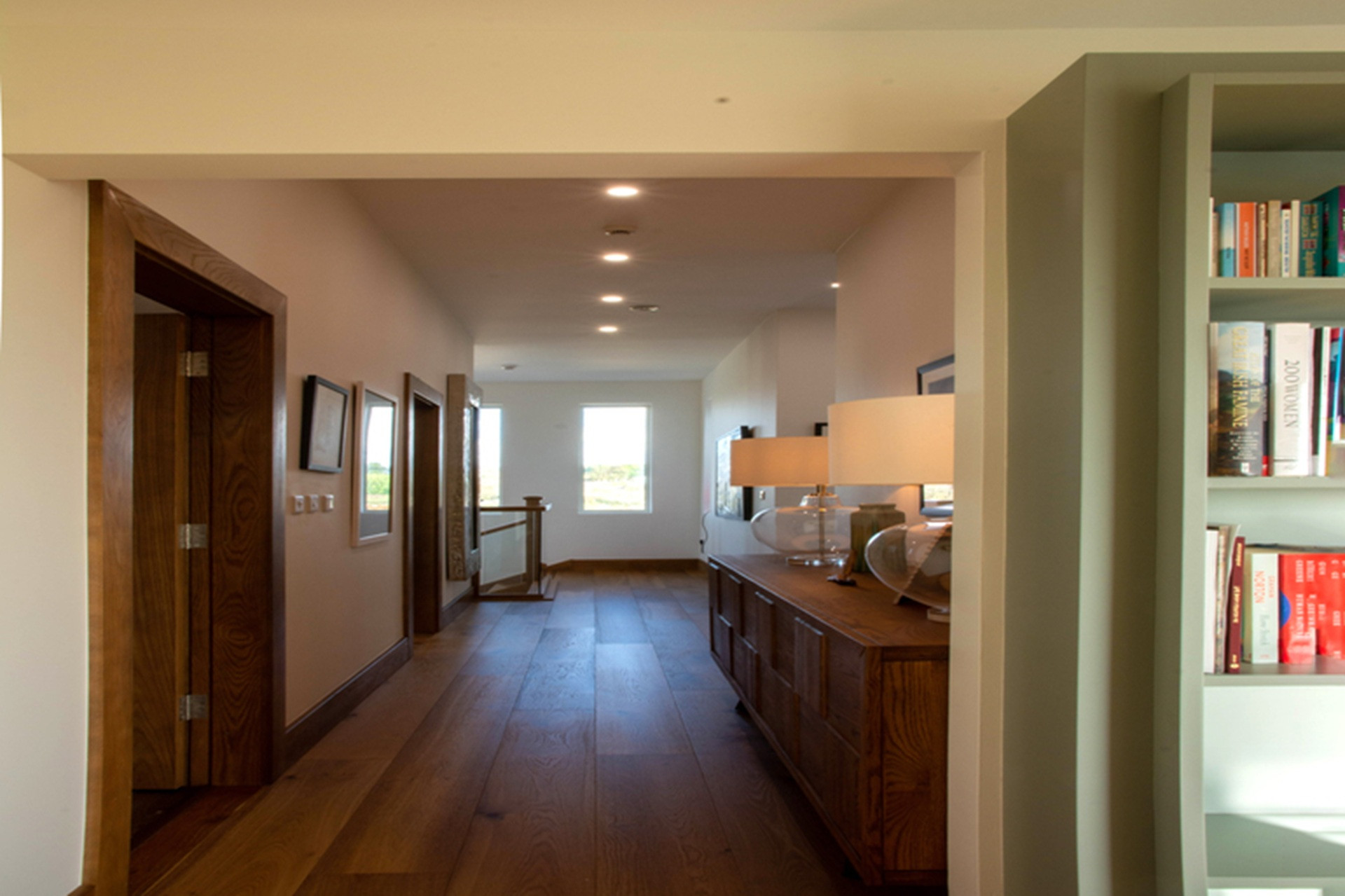 Oak return stairs at the corner of the house lead to bedroom accommodation on the lower ground floor, with hallways running in two directions.