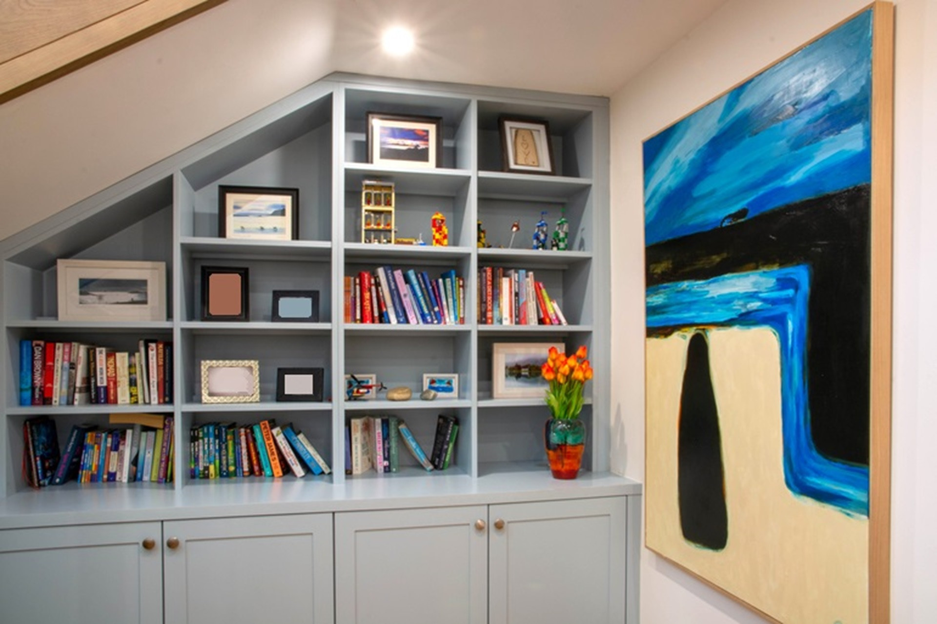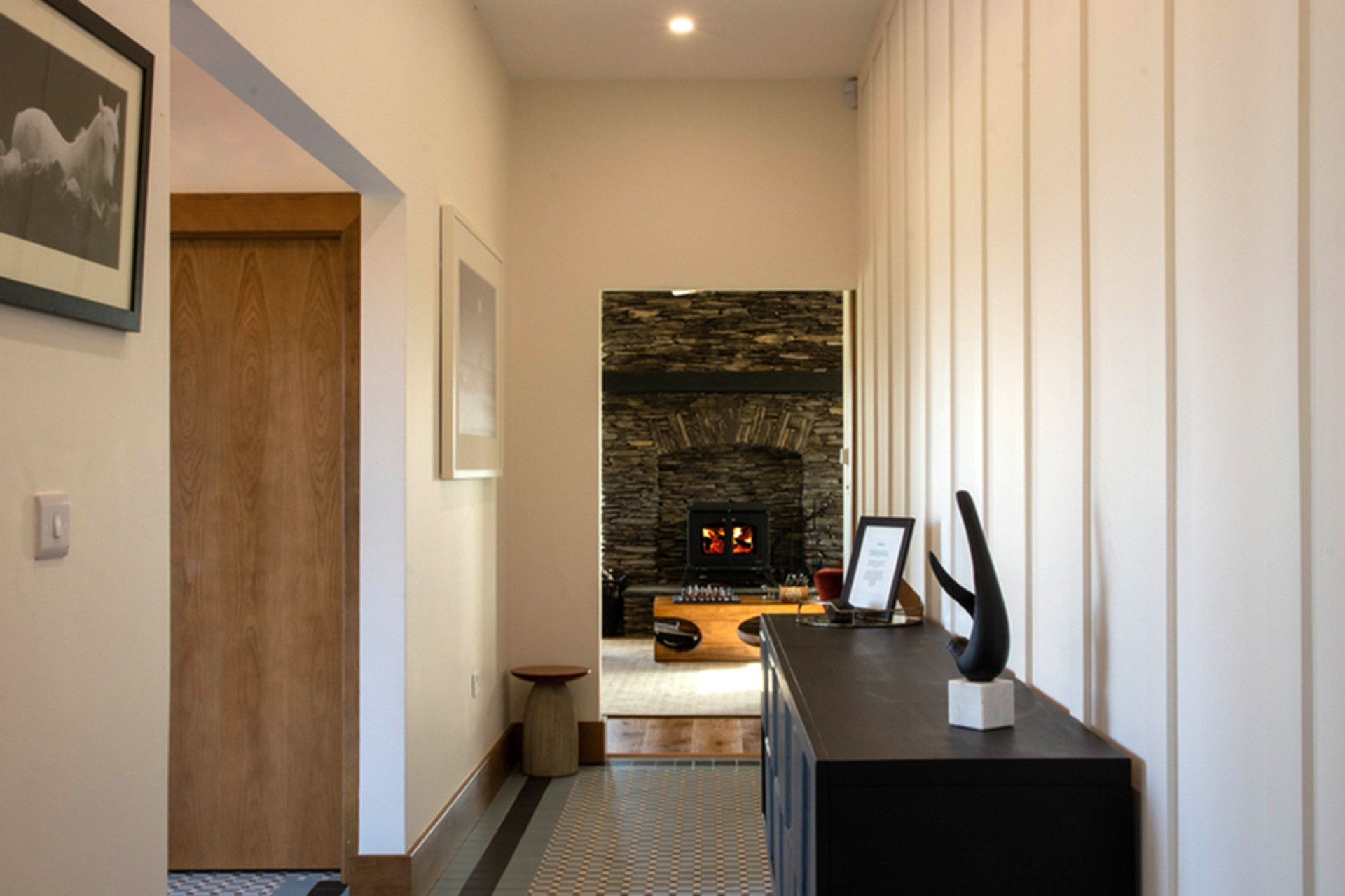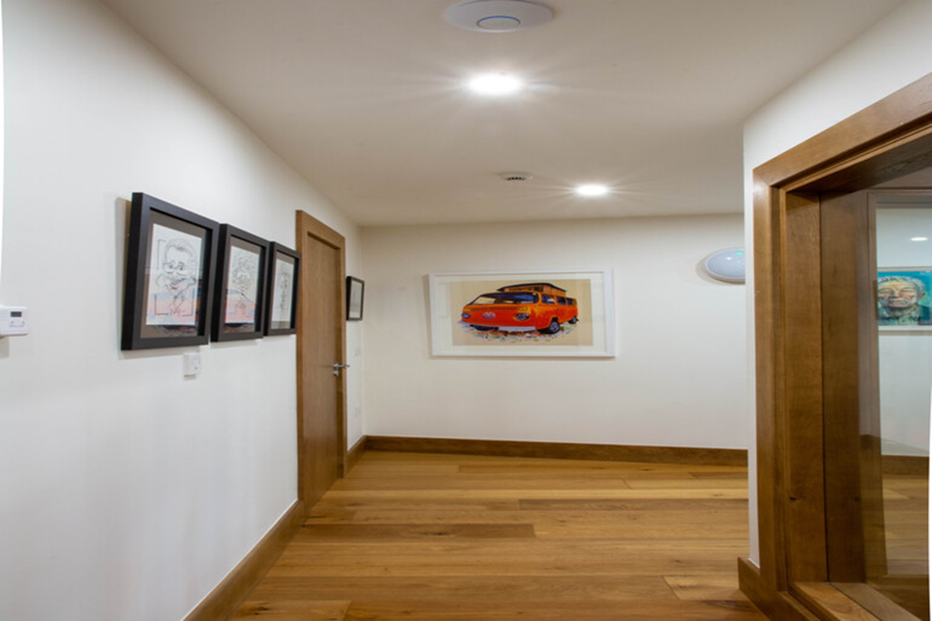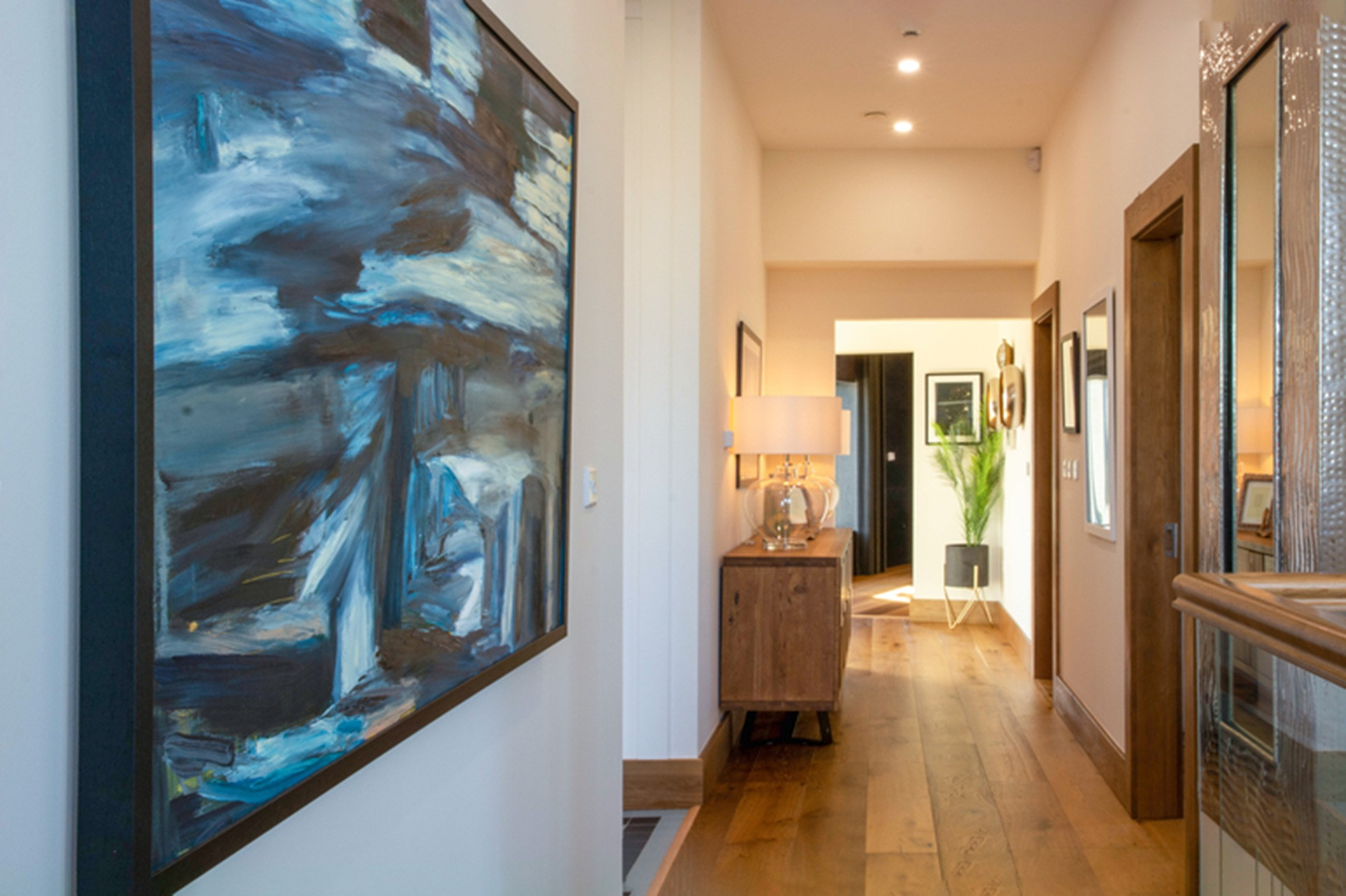 Oak return stairs at the corner of the house lead to bedroom accommodation on the lower ground floor, with hallways running in two directions.
