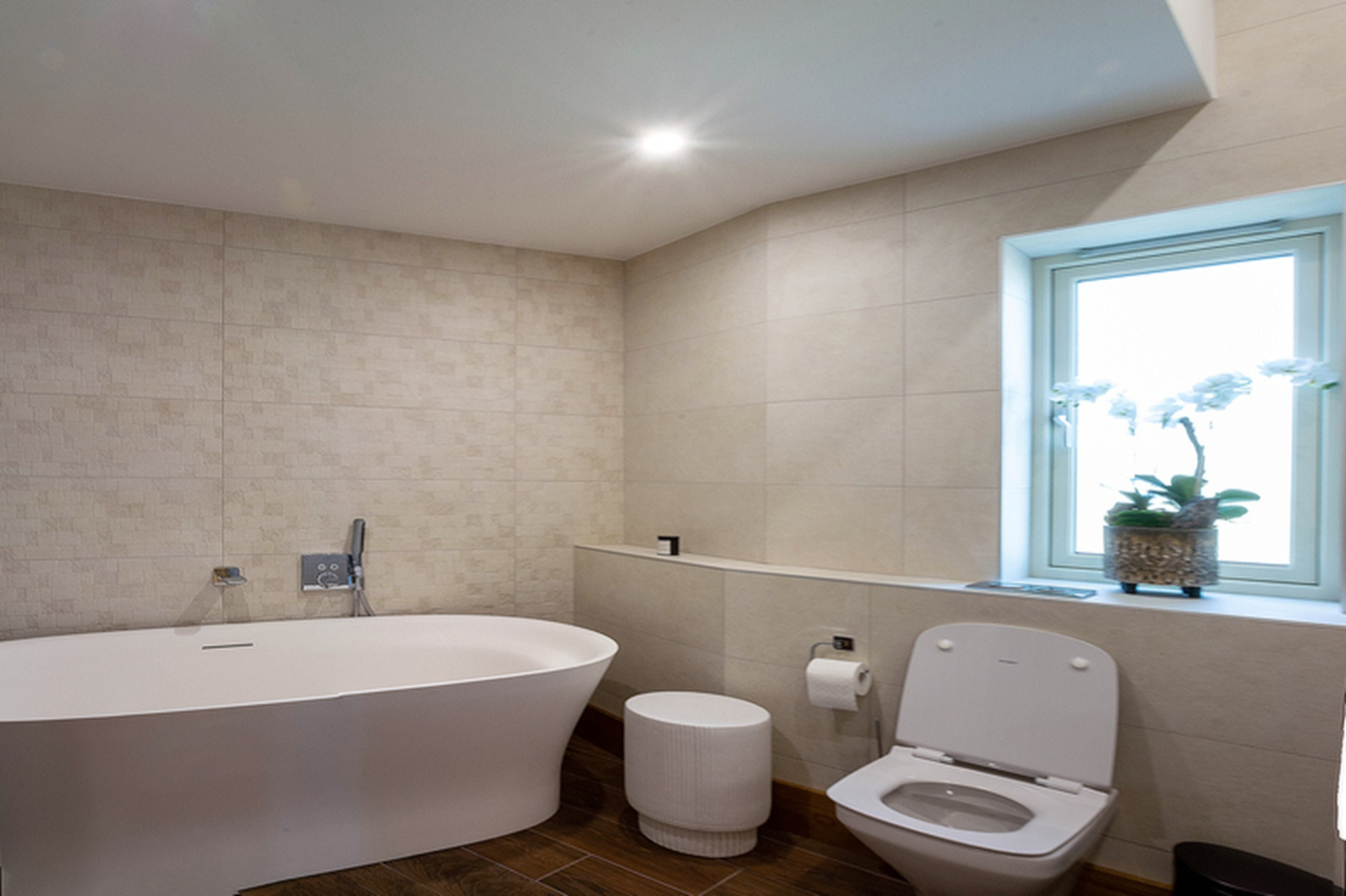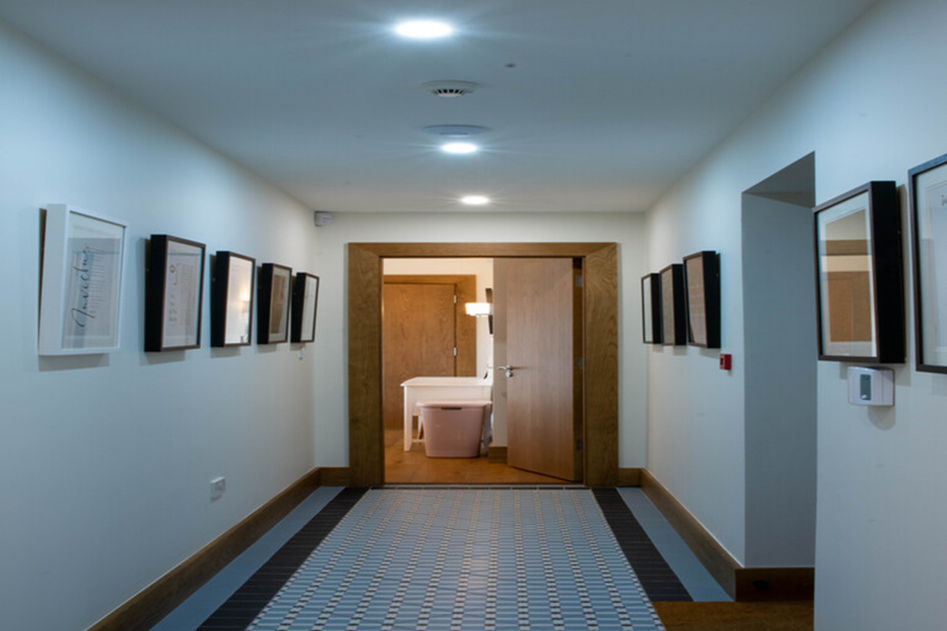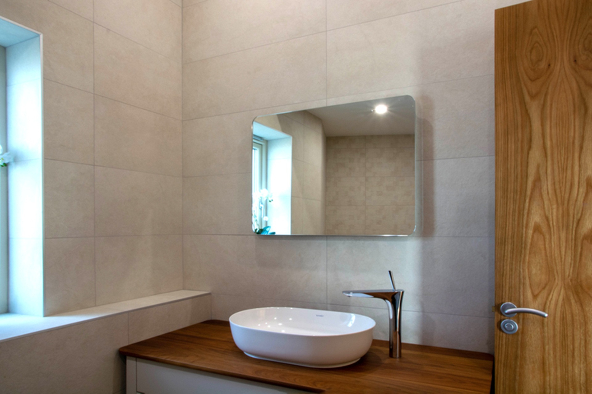 Off the main corridor back to the entrance hall, a family bathroom boasts a super double-ended, extra deep, Corian slipper bath.