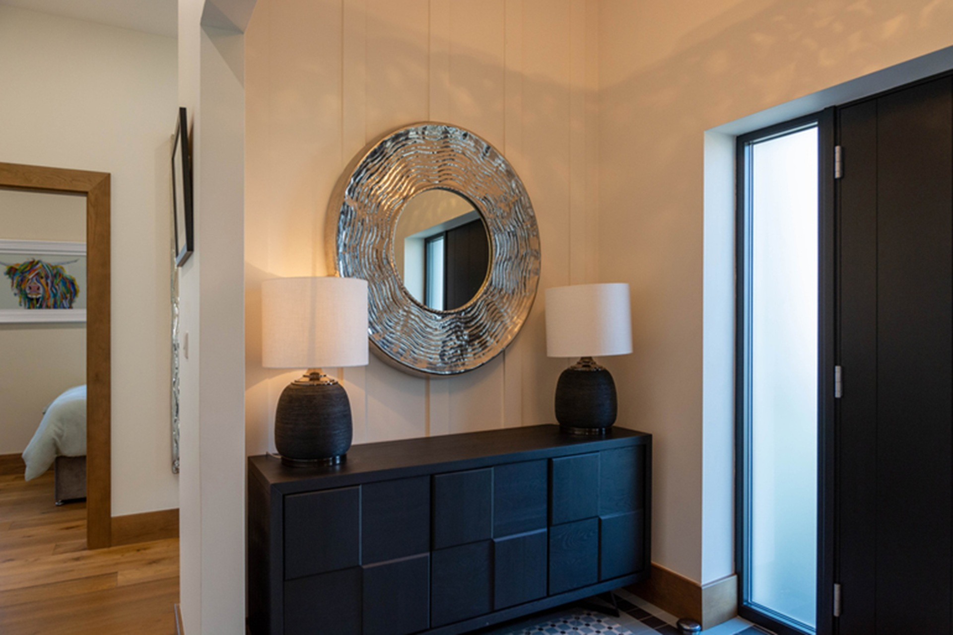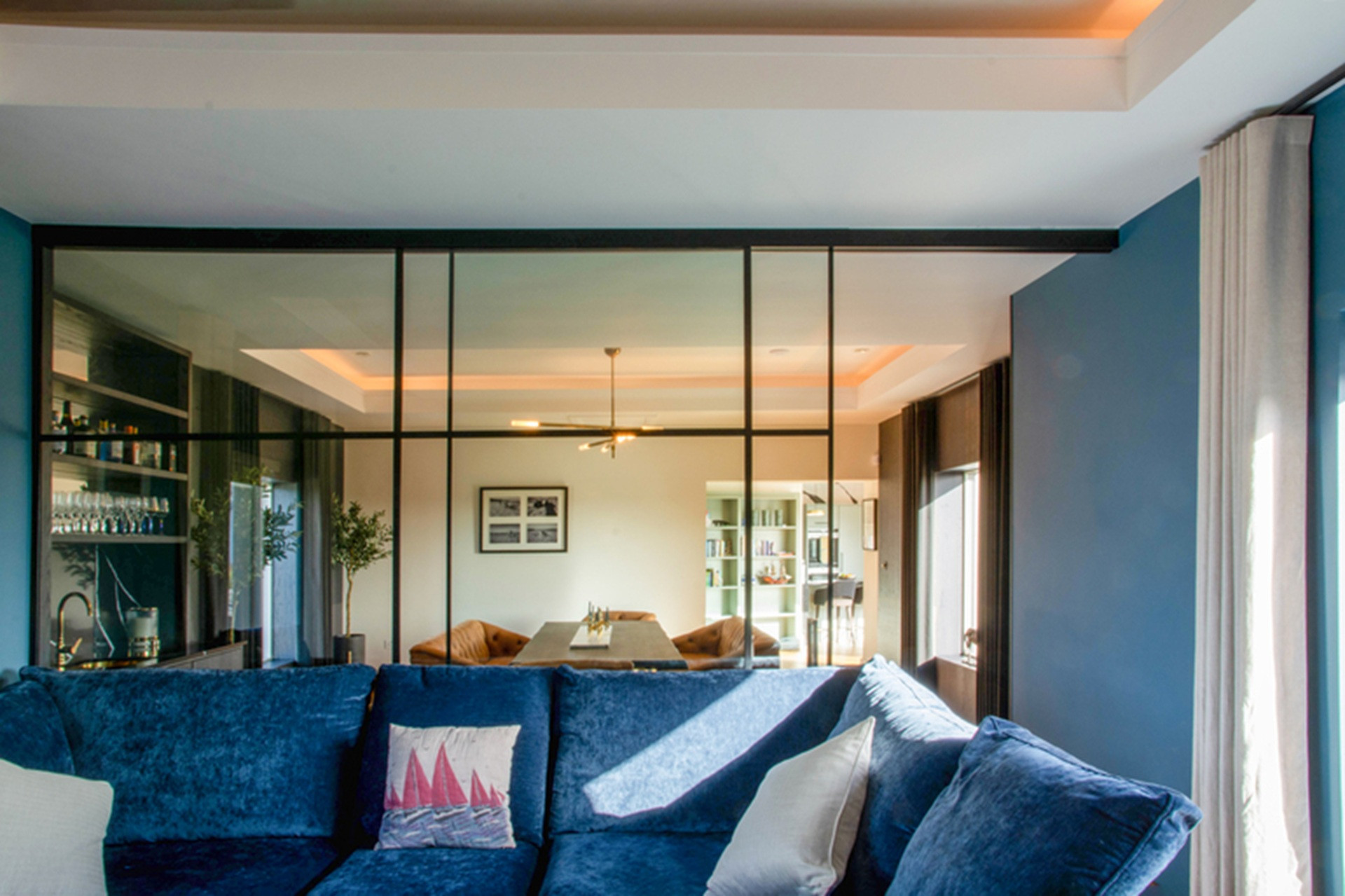 This living area is at an angled junction in the floor plan, with a main corridor back to the entrance, and an archway through to a generous and chic panelled dining room.