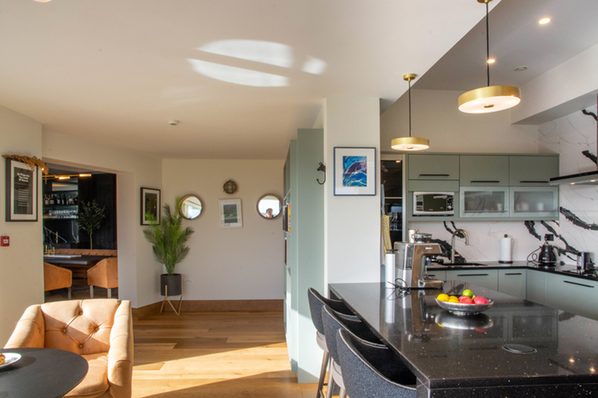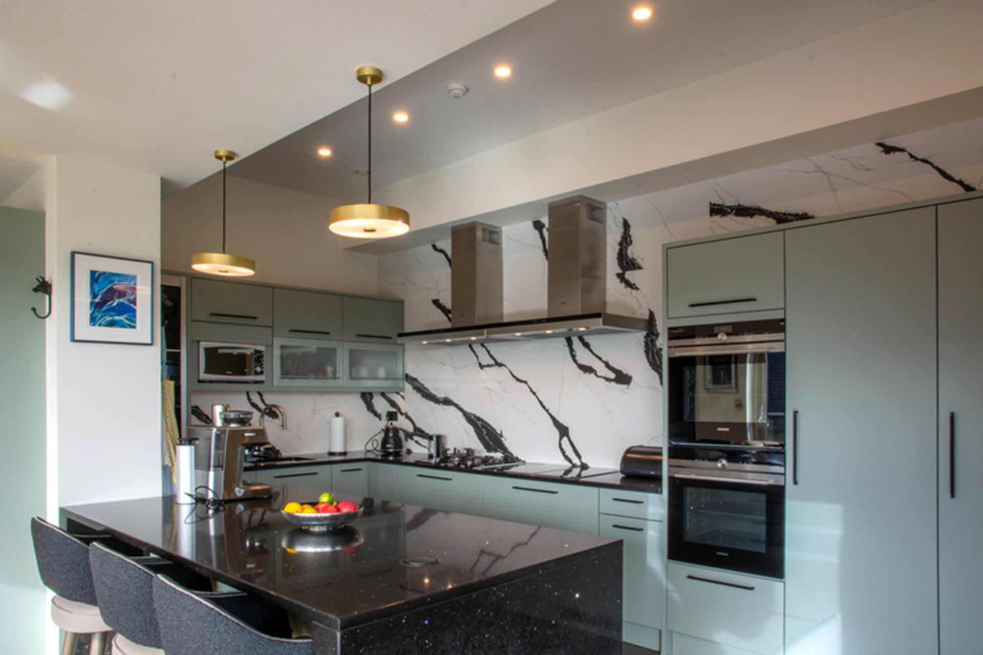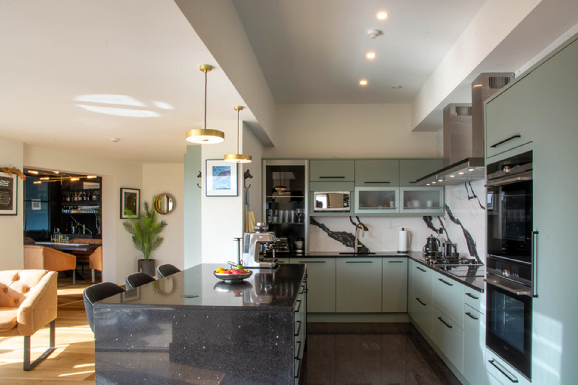 Heavy sliding barn doors open through to a cool sea-green kitchen, with bold walls of white and black quartz. A cook's dream, this kitchen is fully equipped with everything from a coffee machine and Nutri bullet, to an air fryer.