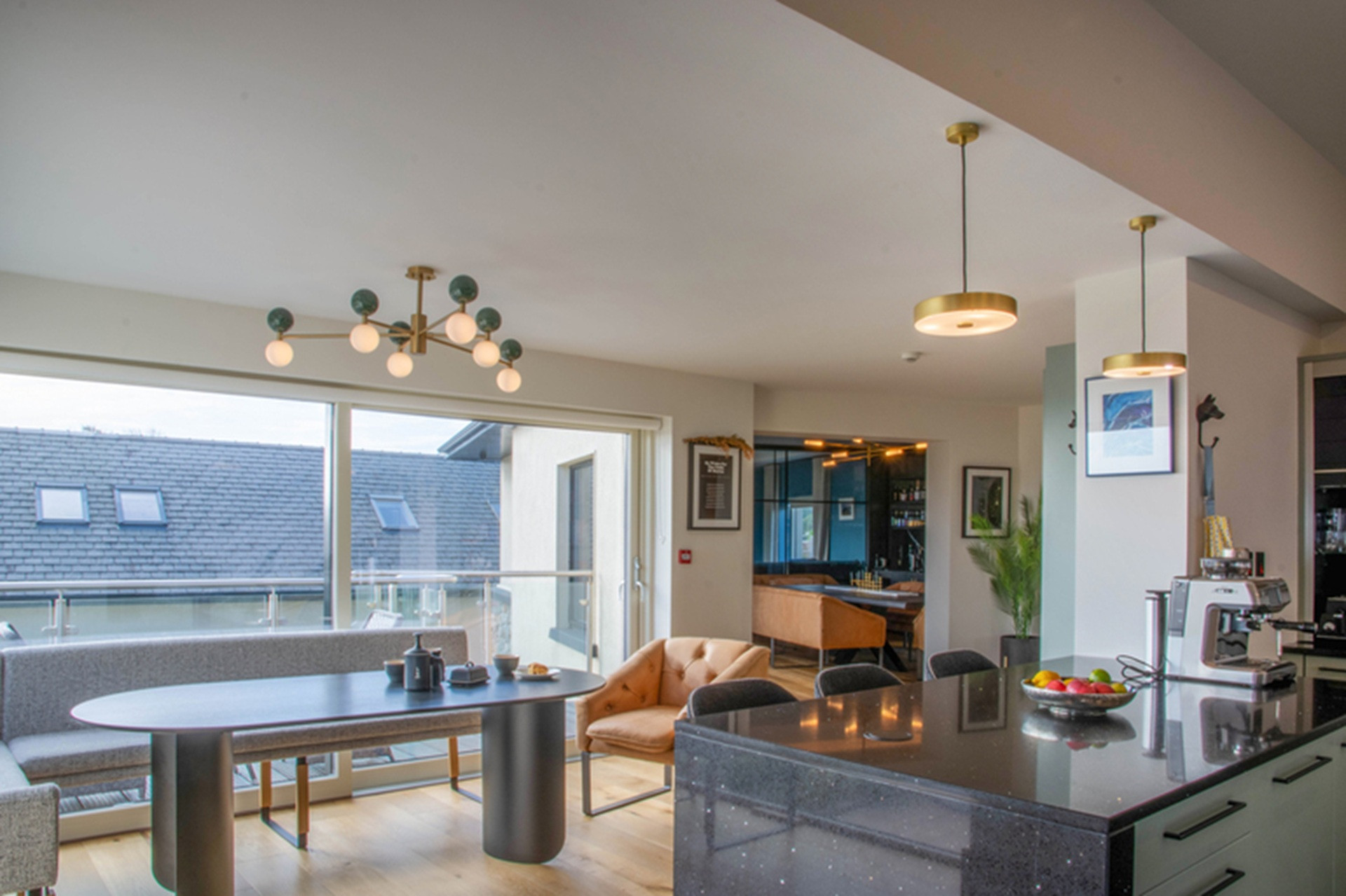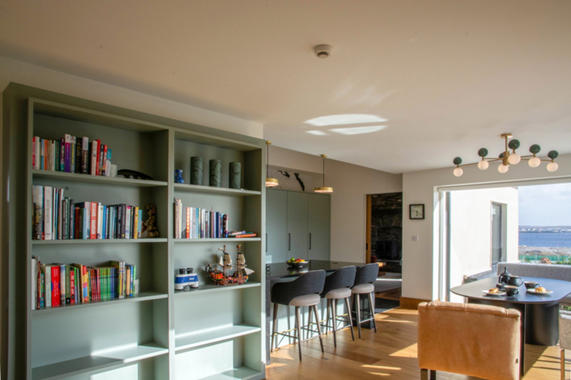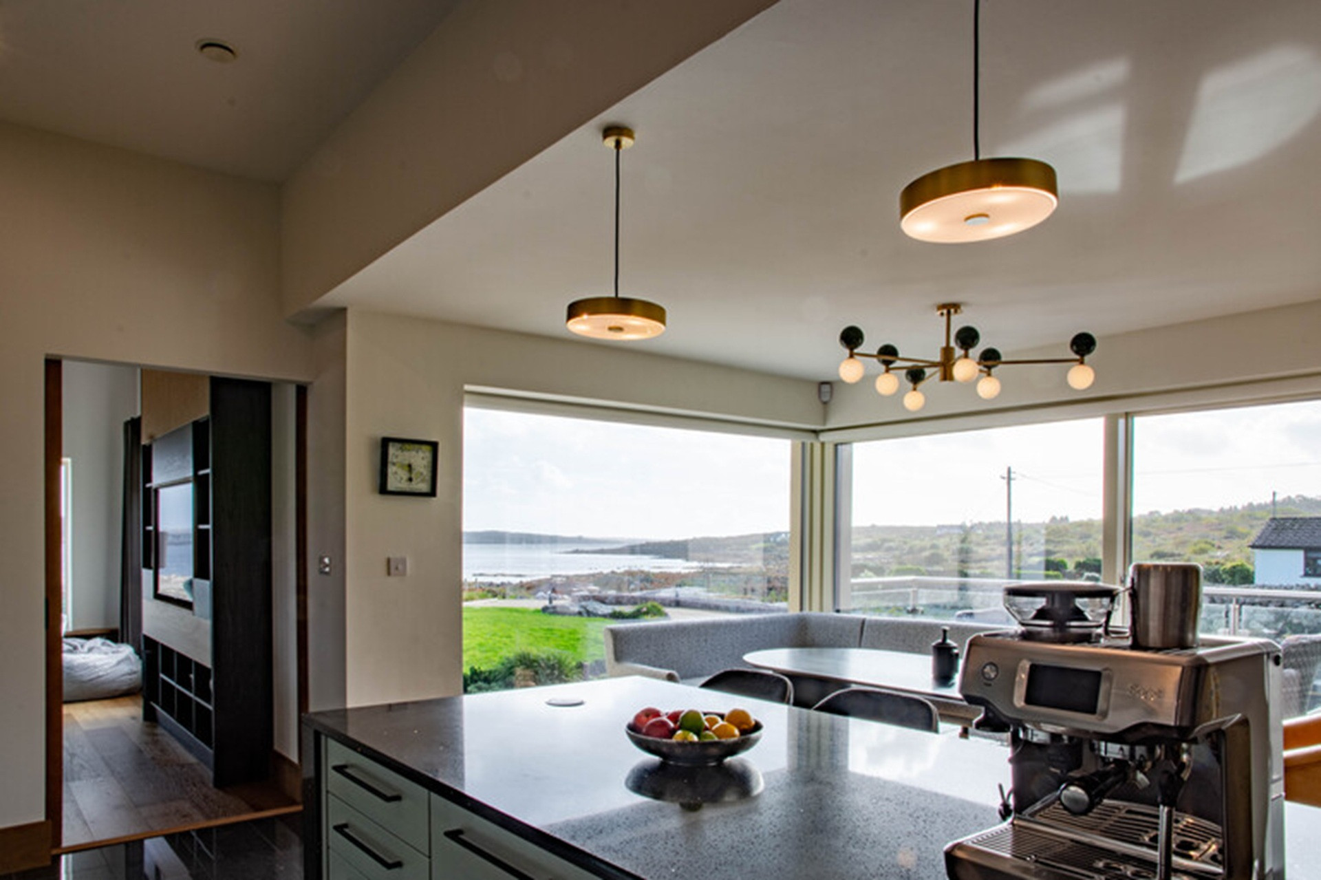 Heavy sliding barn doors open through to a cool sea-green kitchen, with bold walls of white and black quartz. A cook's dream, this kitchen is fully equipped with everything from a coffee machine and Nutri bullet, to an air fryer.