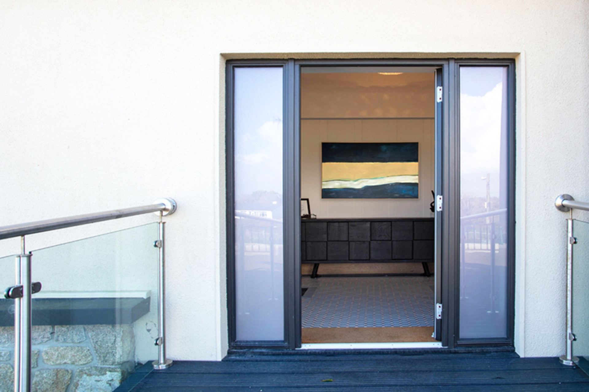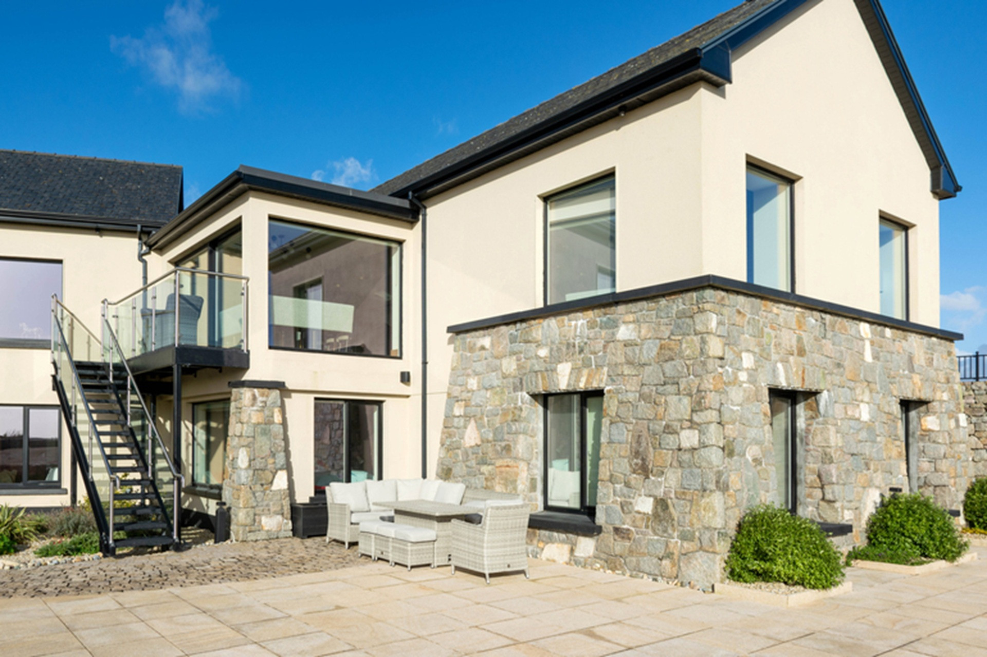 Panoramic full-height glazing maximises the omnipresent ocean views, with a broad, glazed sliding door onto a balcony. From here, external stairs connect to the paved patio below.