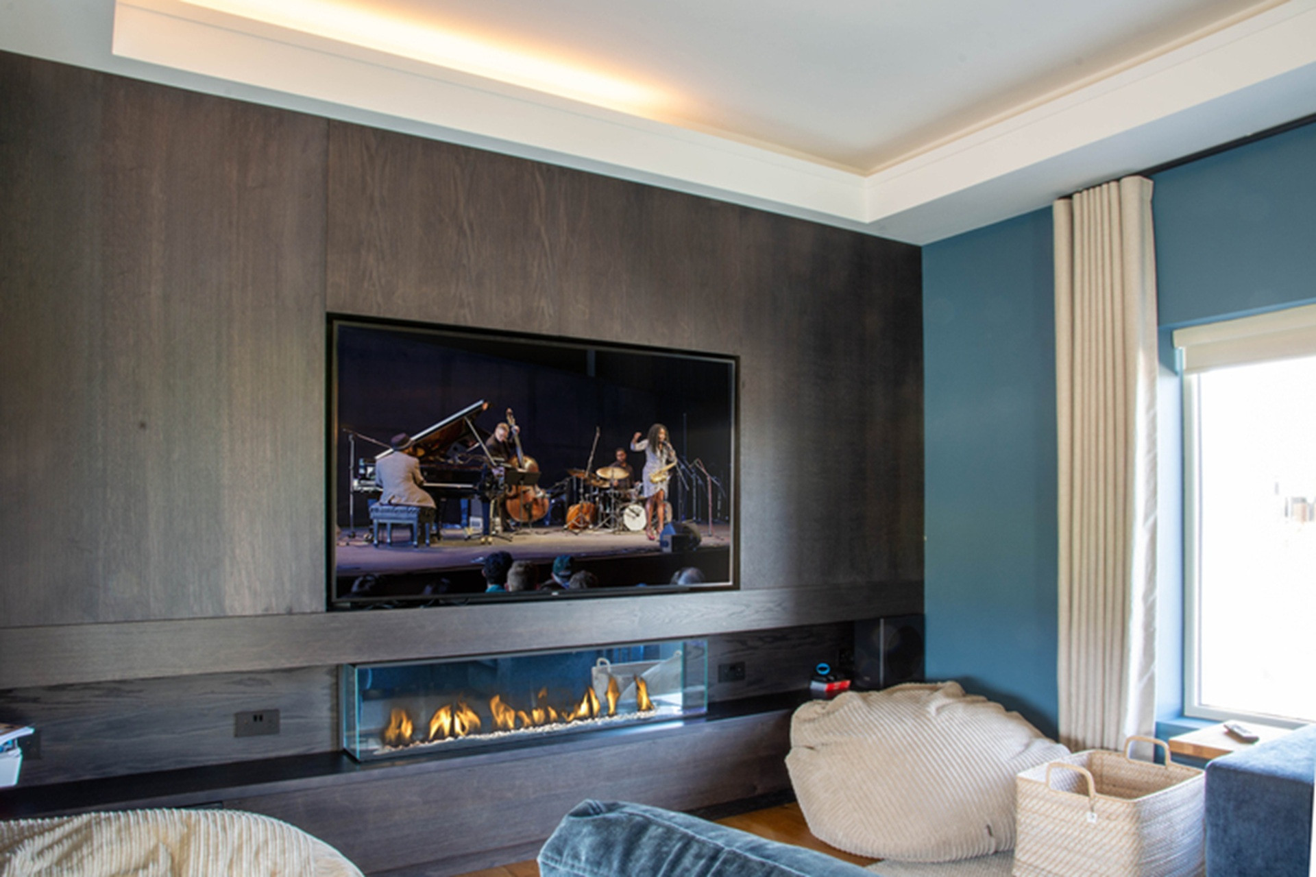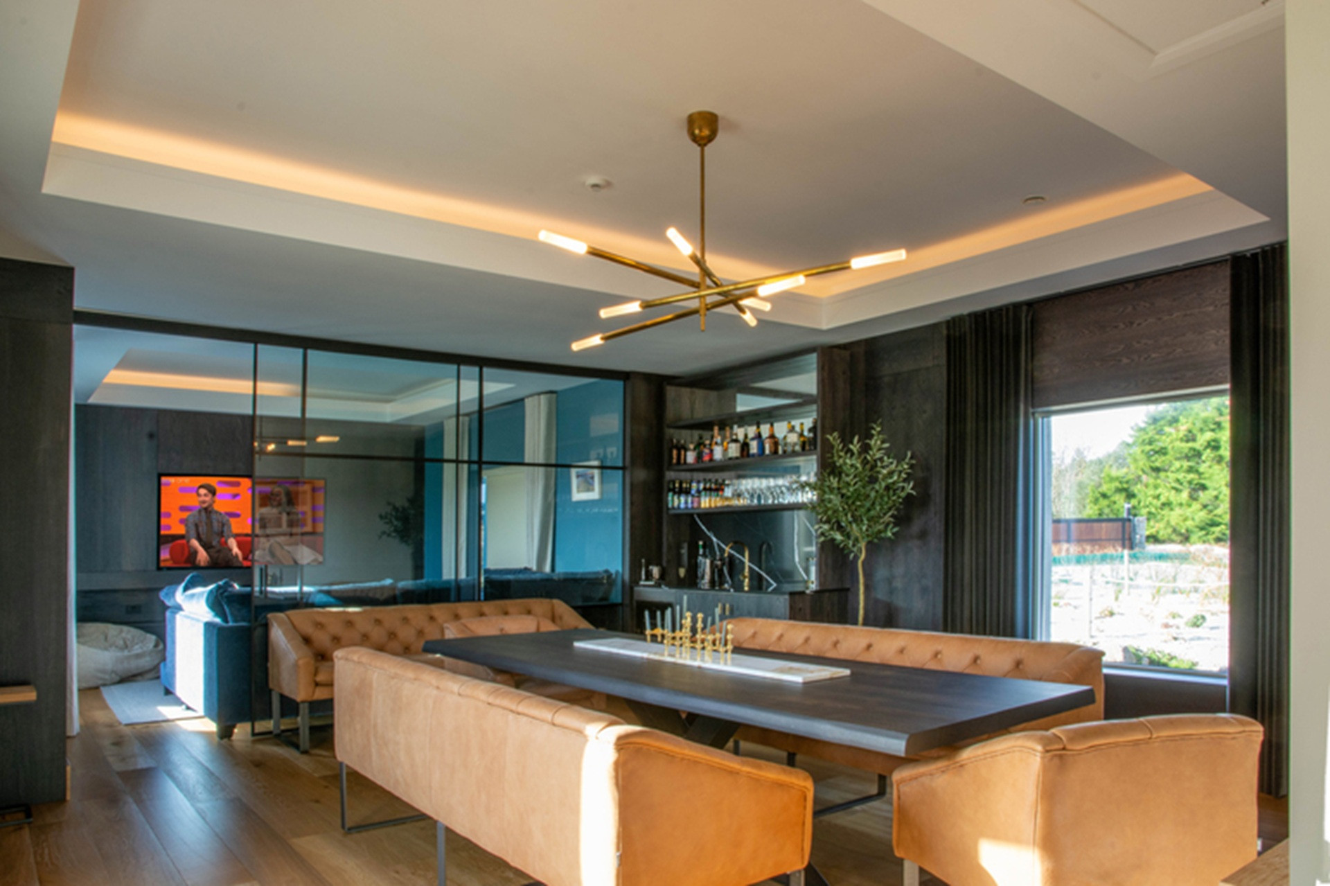 Beyond and behind a sliding glass wall, a monumental flat-screen TV monopolises the adjoining television lounge.