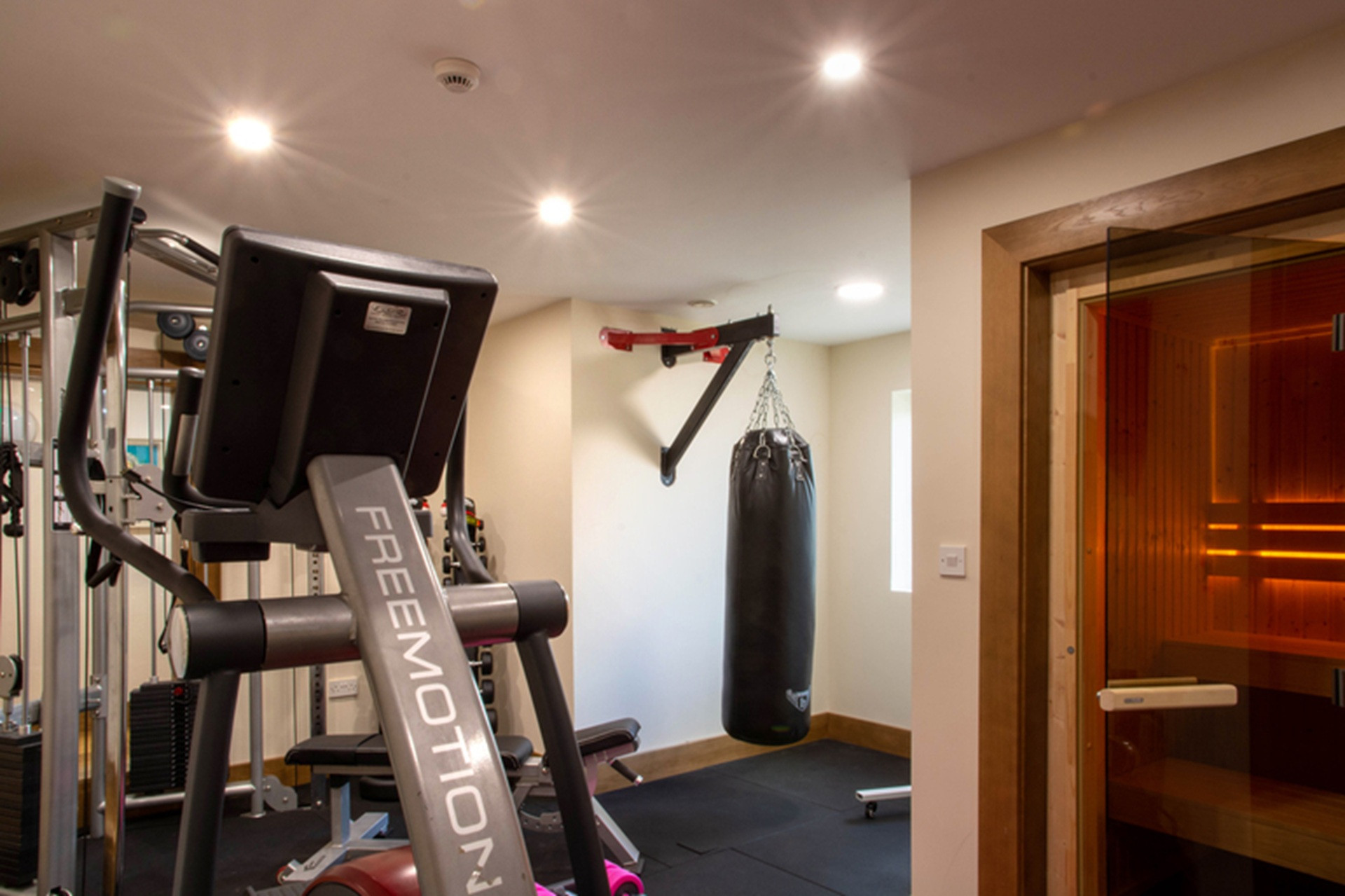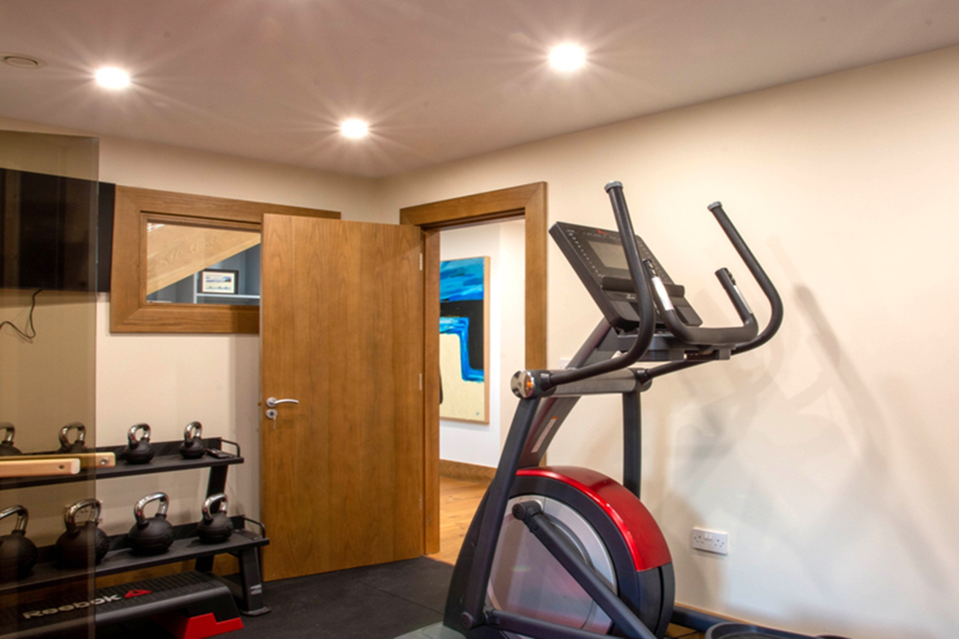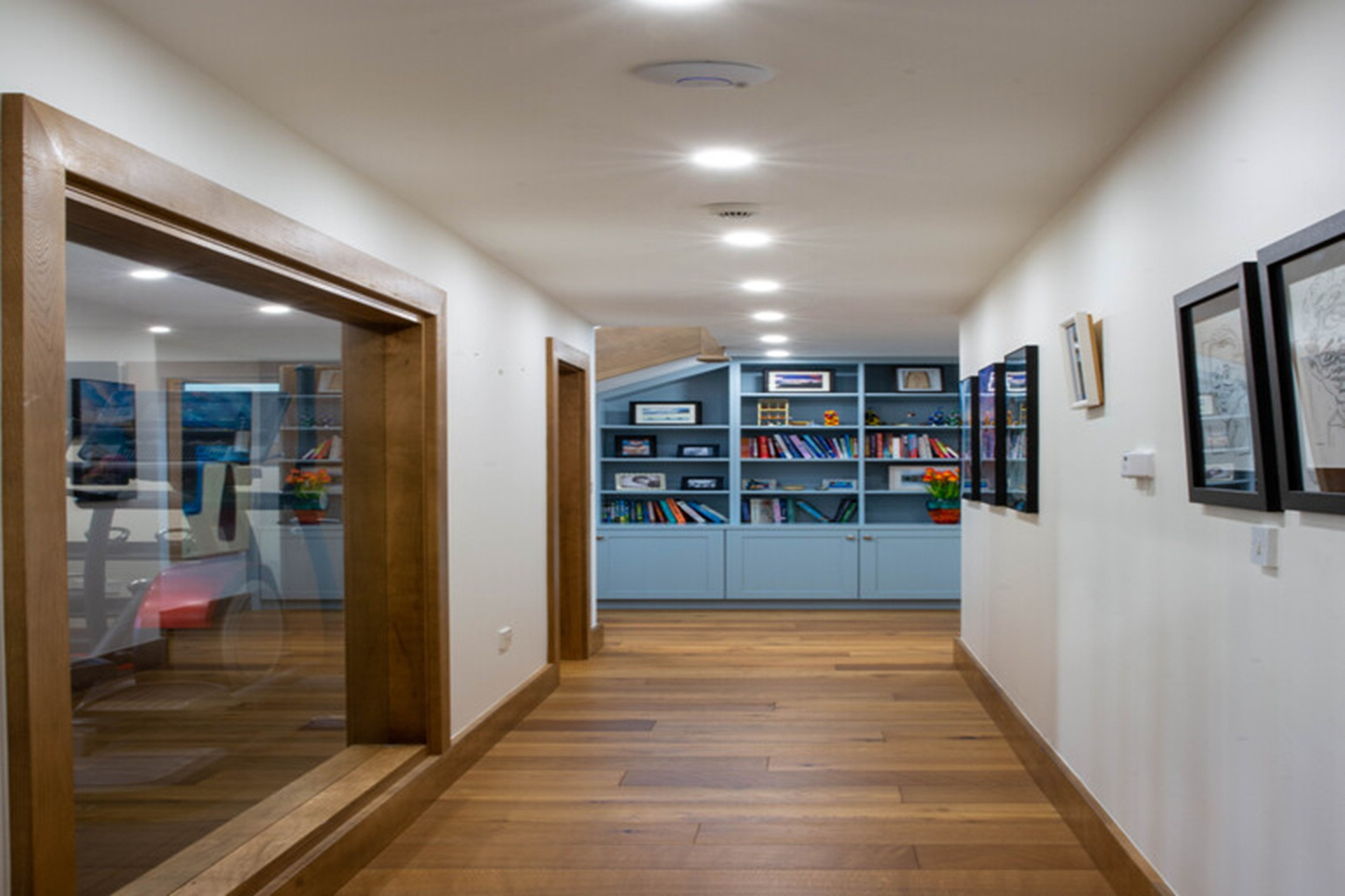 A picture window along the opposing corridor exposes the workout room with its multiple fitness machines.