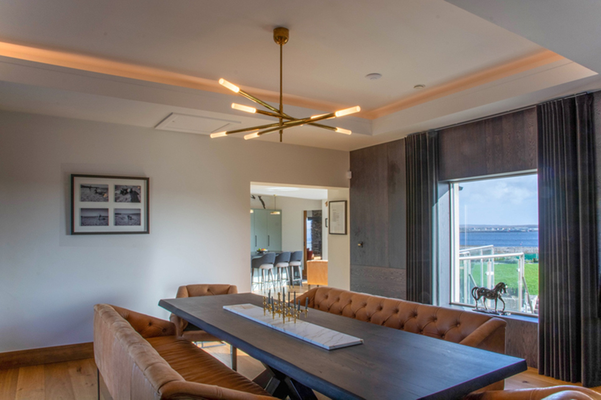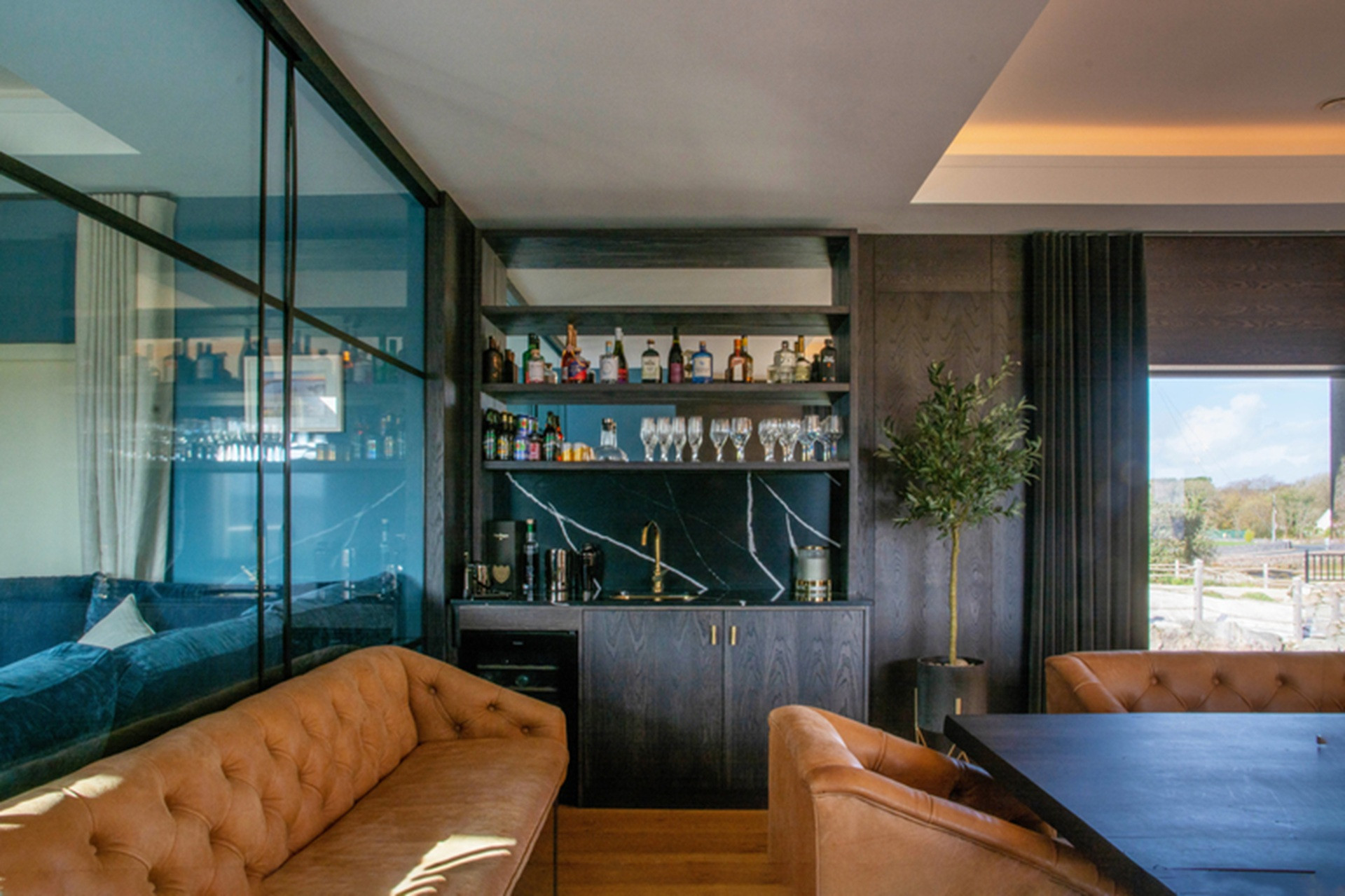 A more formal affair with a table that can seat the entire complement of visitors on convivial suede buttoned benches, and with a cocktail bar, wine cooler and ice machine in the corner, surrounded by sable stained panelling and stunning views.