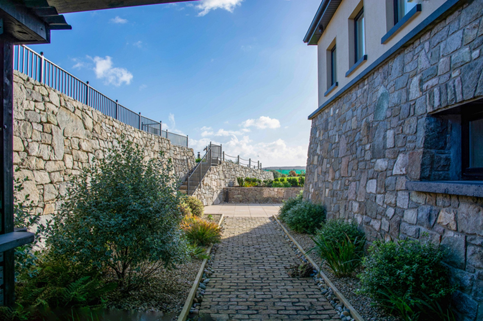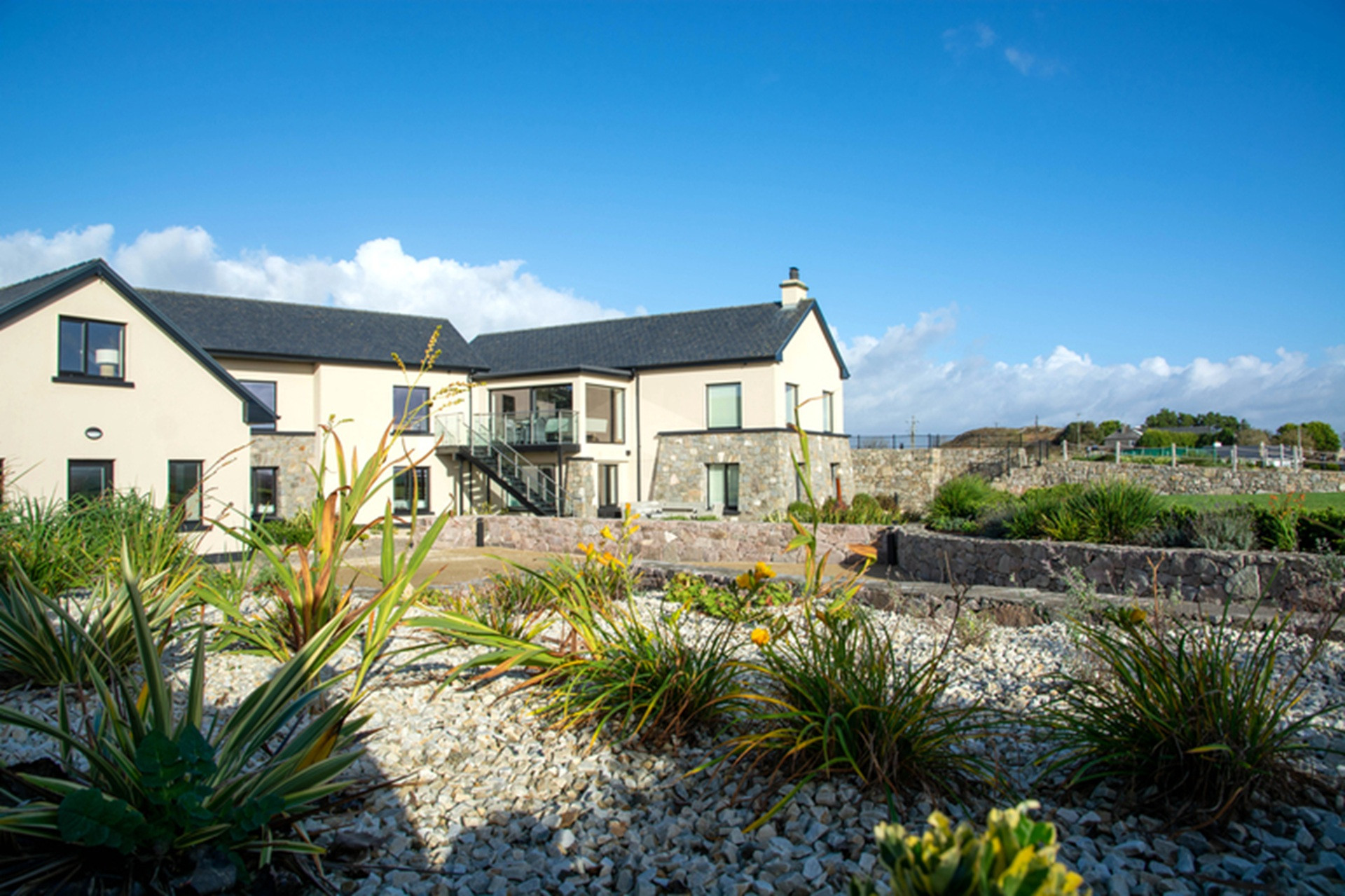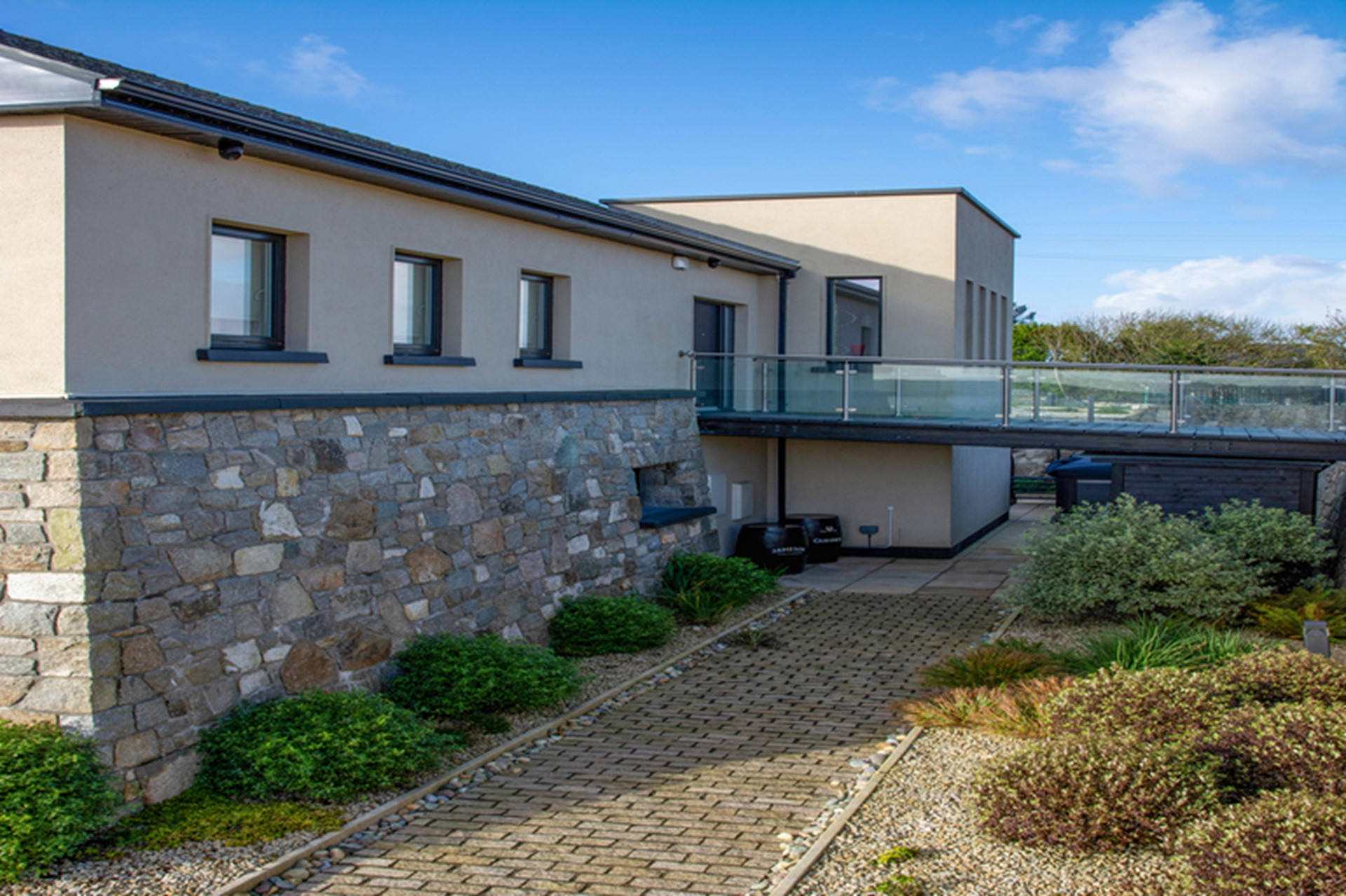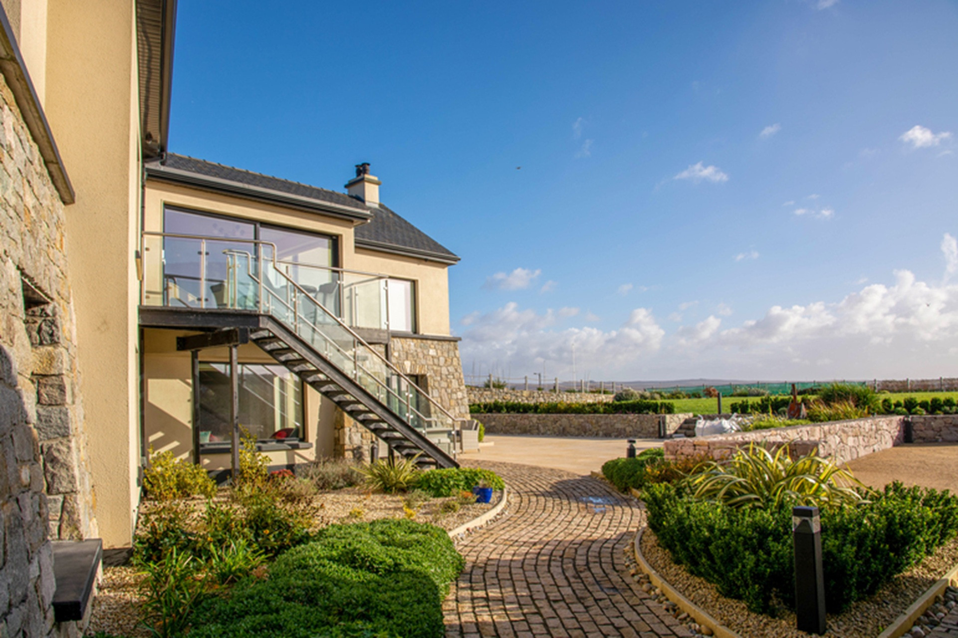 The gardens have been beautifully landscaped with wonderful traditional masonry work in local stone to accommodate its unique site and location above Sruthán Pier – just a stone’s throw from the sea. A brick path surrounds the house, and under the escarpment in the shady back stretch, there is a large dual temperature Spa swim pool, with a separate hot tub and an outdoor shower. There are two entrance gates to the property, a stunning curved driveway, and ample parking.