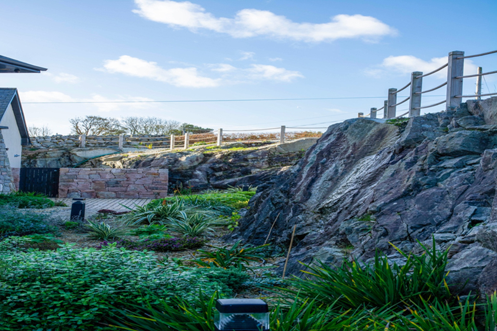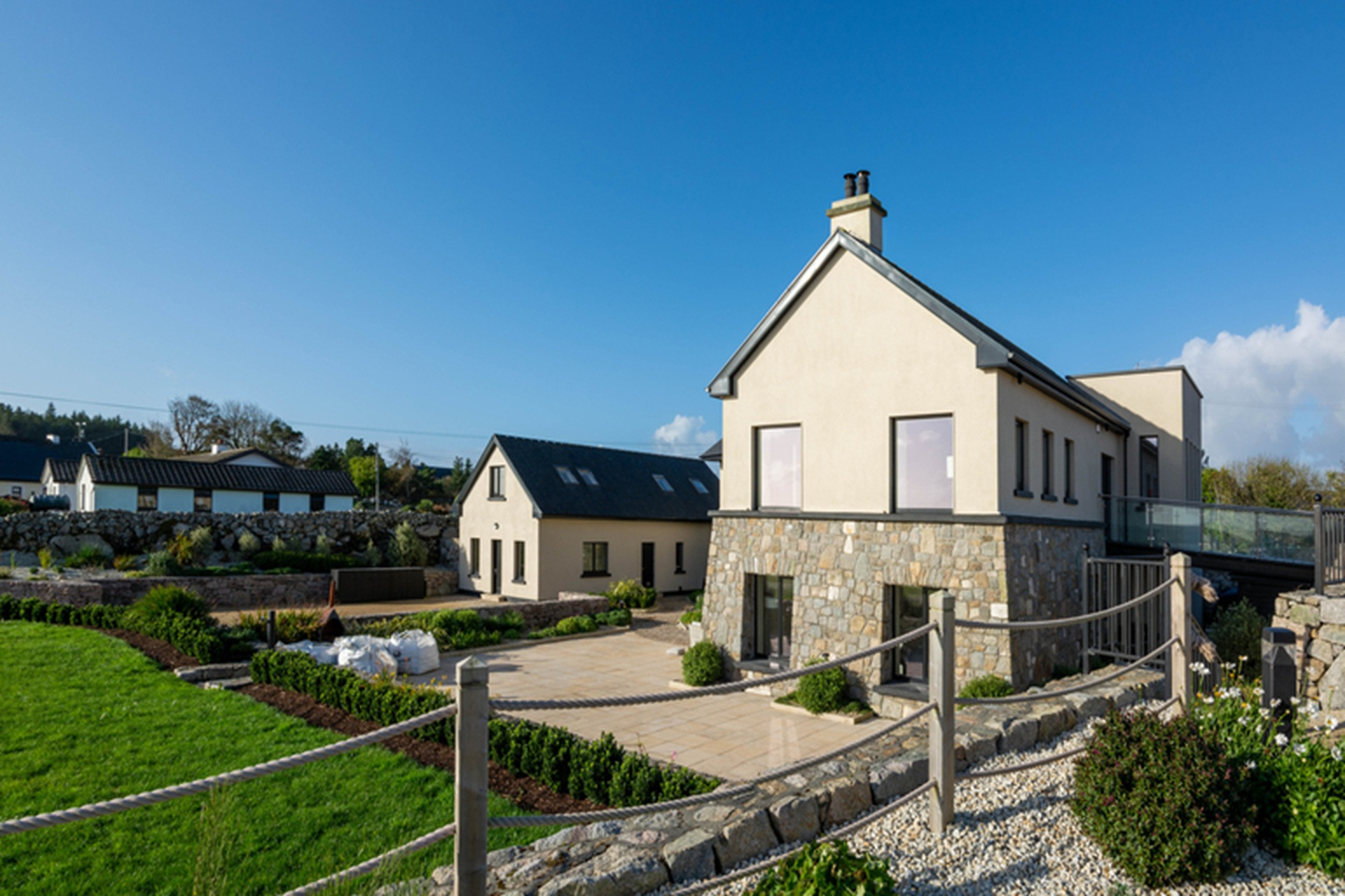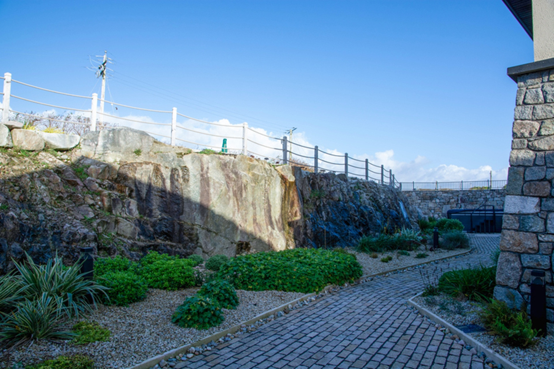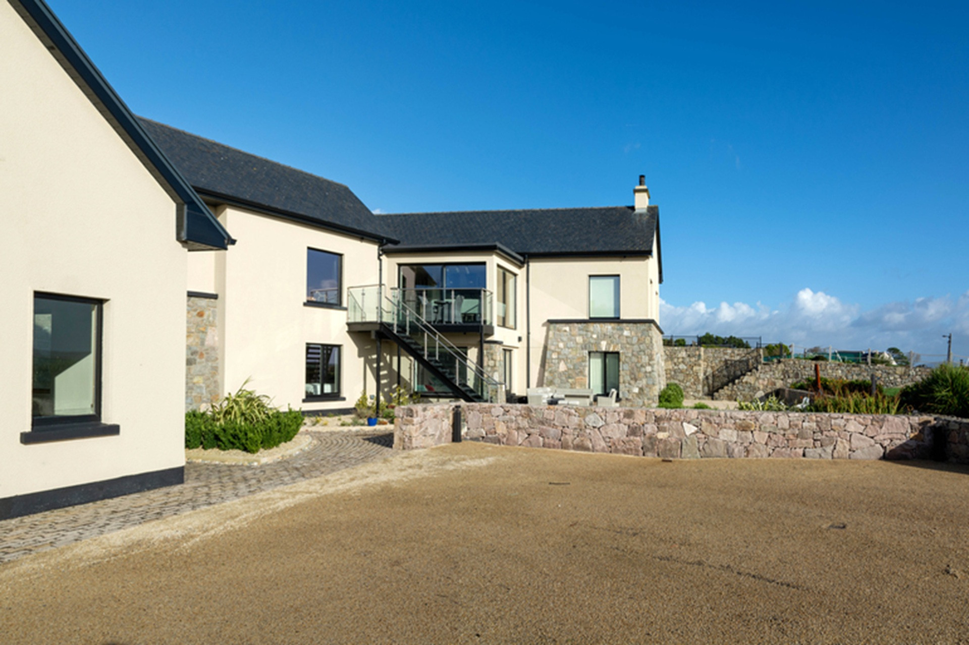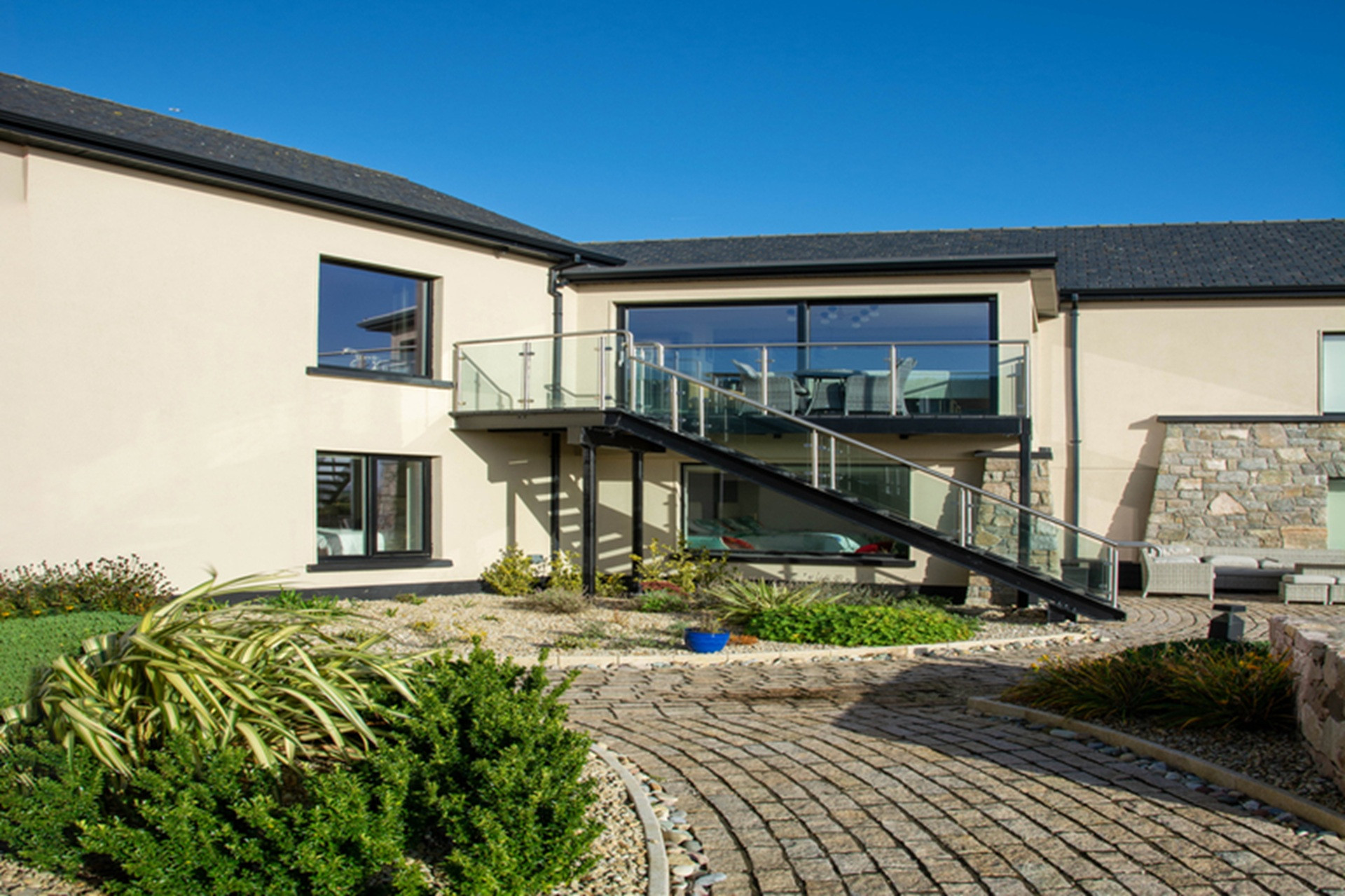 The gardens have been beautifully landscaped with wonderful traditional masonry work in local stone to accommodate its unique site and location above Sruthán Pier – just a stone’s throw from the sea. A brick path surrounds the house, and under the escarpment in the shady back stretch, there is a large dual temperature Spa swim pool, with a separate hot tub and an outdoor shower. There are two entrance gates to the property, a stunning curved driveway, and ample parking.