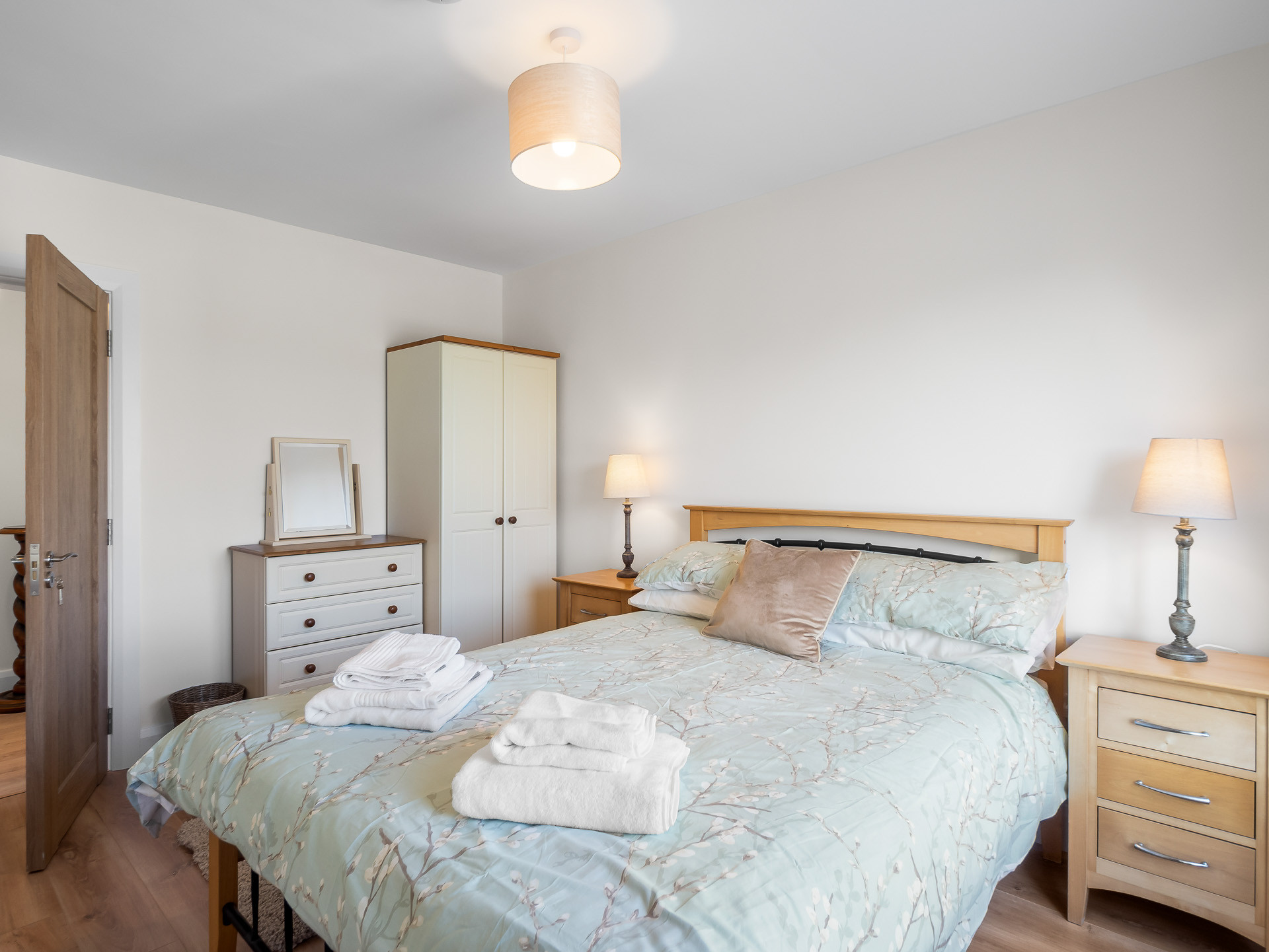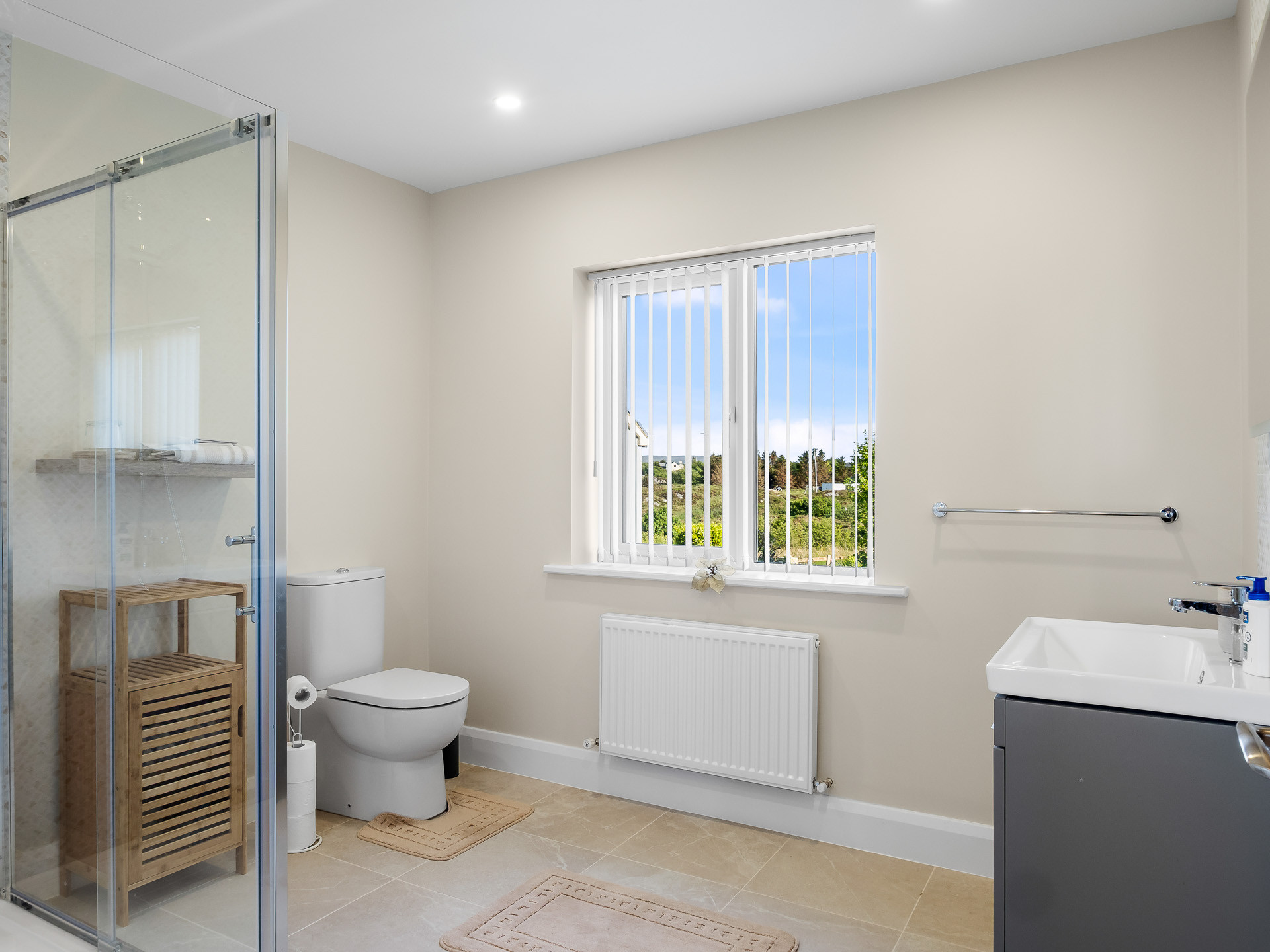 This kitchen has everything one would require in terms of kitchen utensils, modern appliances and recipe books for cooking enthusiasts. A large dishwasher, four ring electric hob, extractor fan, a coffee plunger, and ample sized fridge freezer are contained behind white and sage green kitchen units. There is also a wall mounted smart TV. To top it all off, Connemara’s charm is on show in the most perfect way through the windows on every side. Enjoy the view, whether it be a golden sunset or a misty morning, while you cook and while you eat!