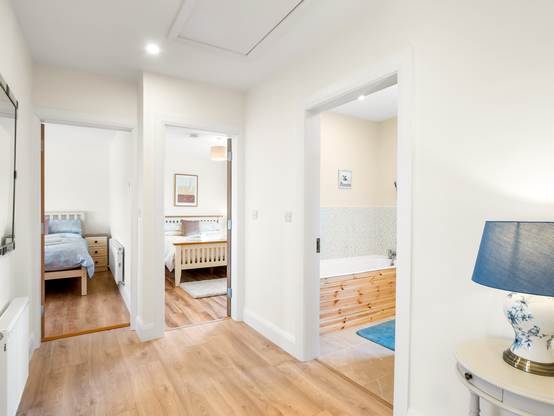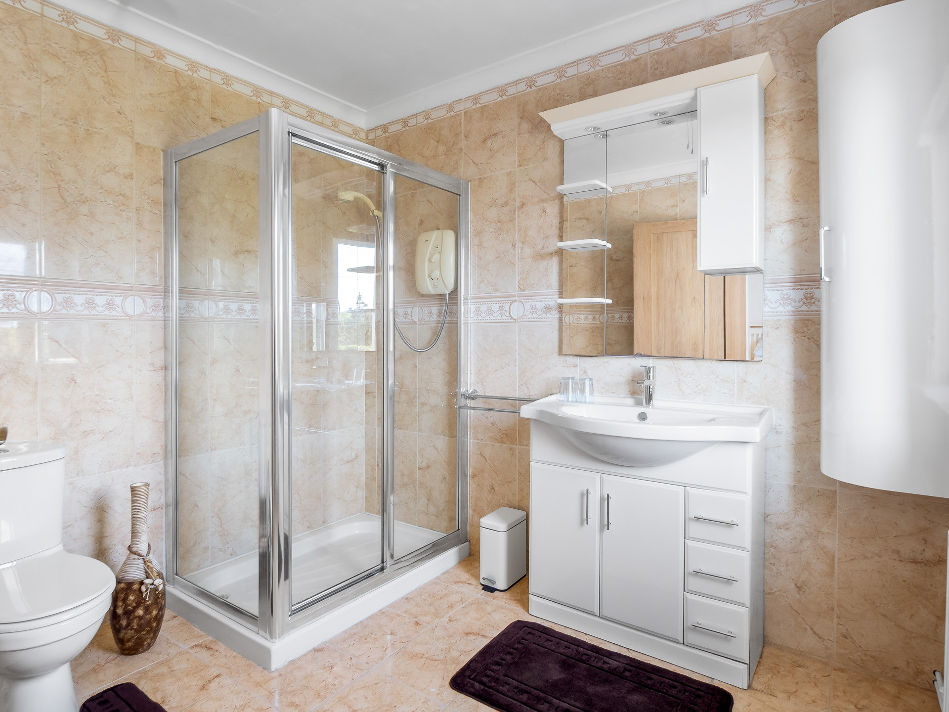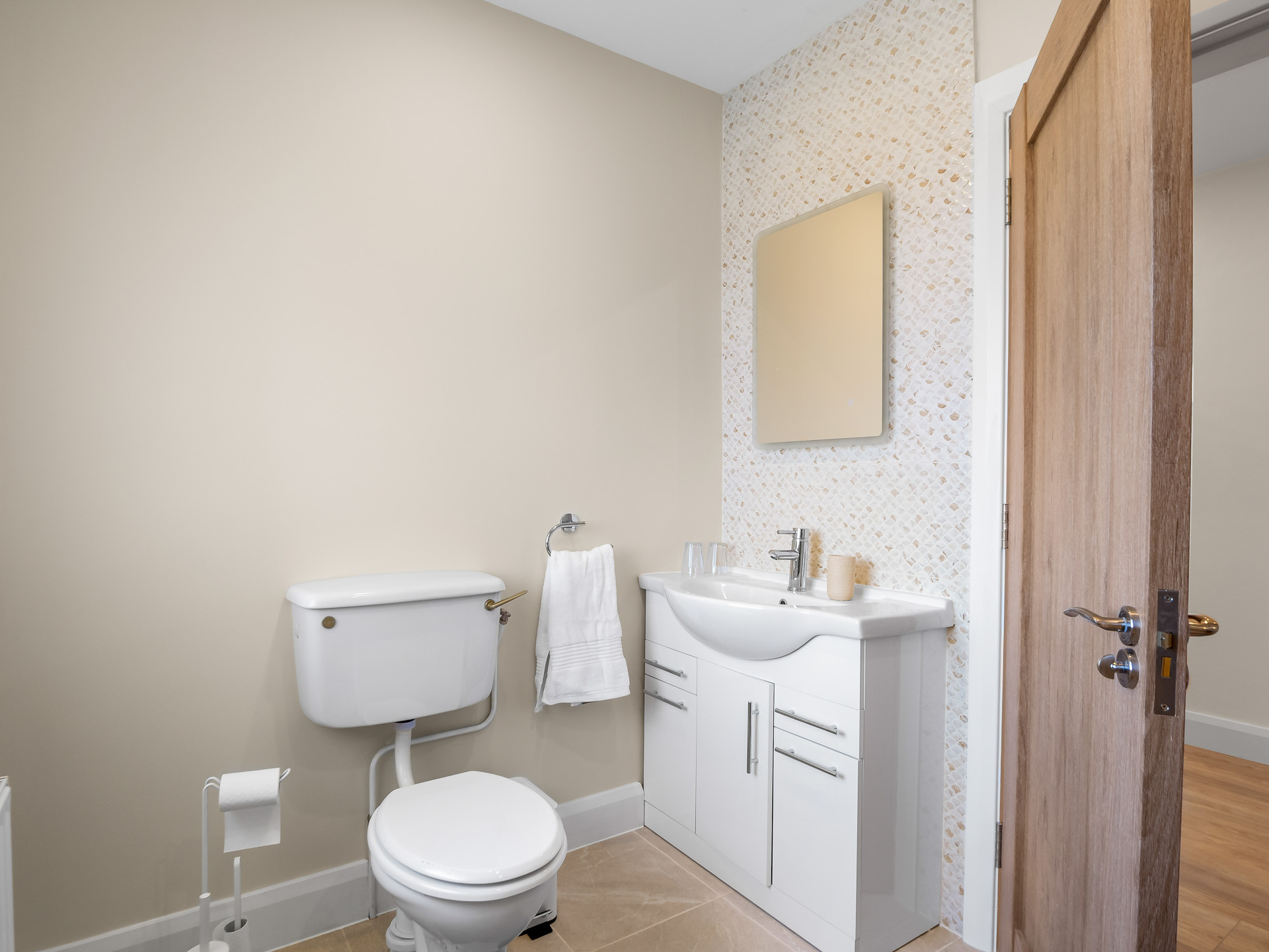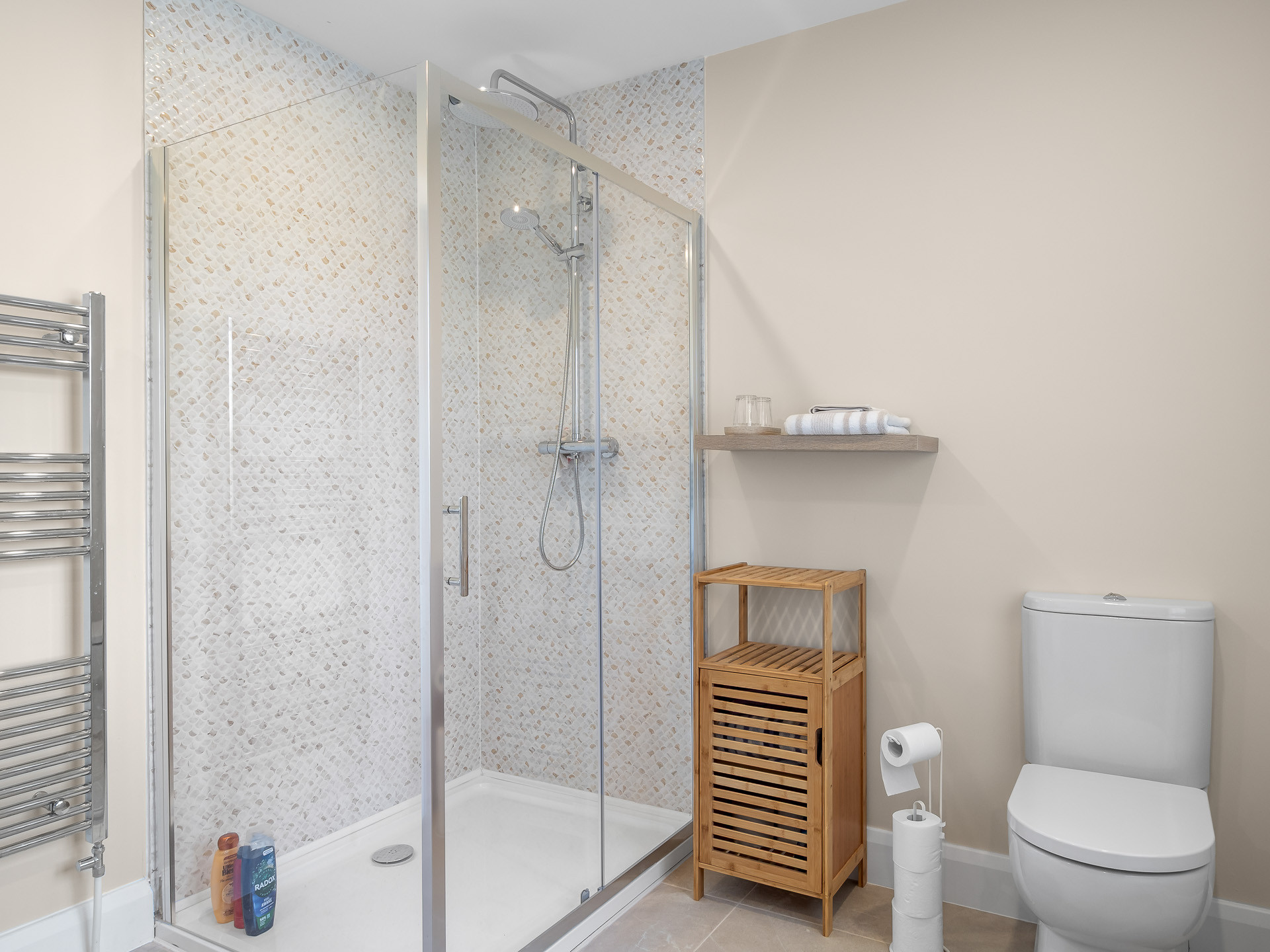Inclusive of w/c, walk in tropical rain shower, heated towel rail, sink and vanity unit with an anti-mist LED mirror. Additional shelving and storage space.