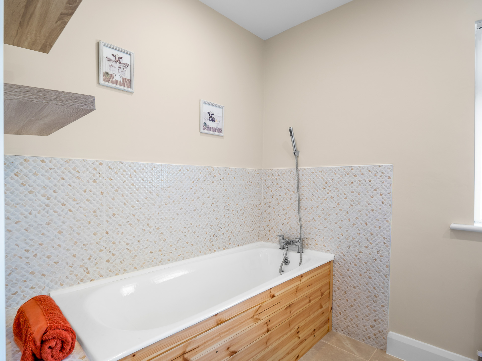 Inclusive of w/c sink and vanity unit, anti-mist LED mirror, shelving and a free-standing bath.