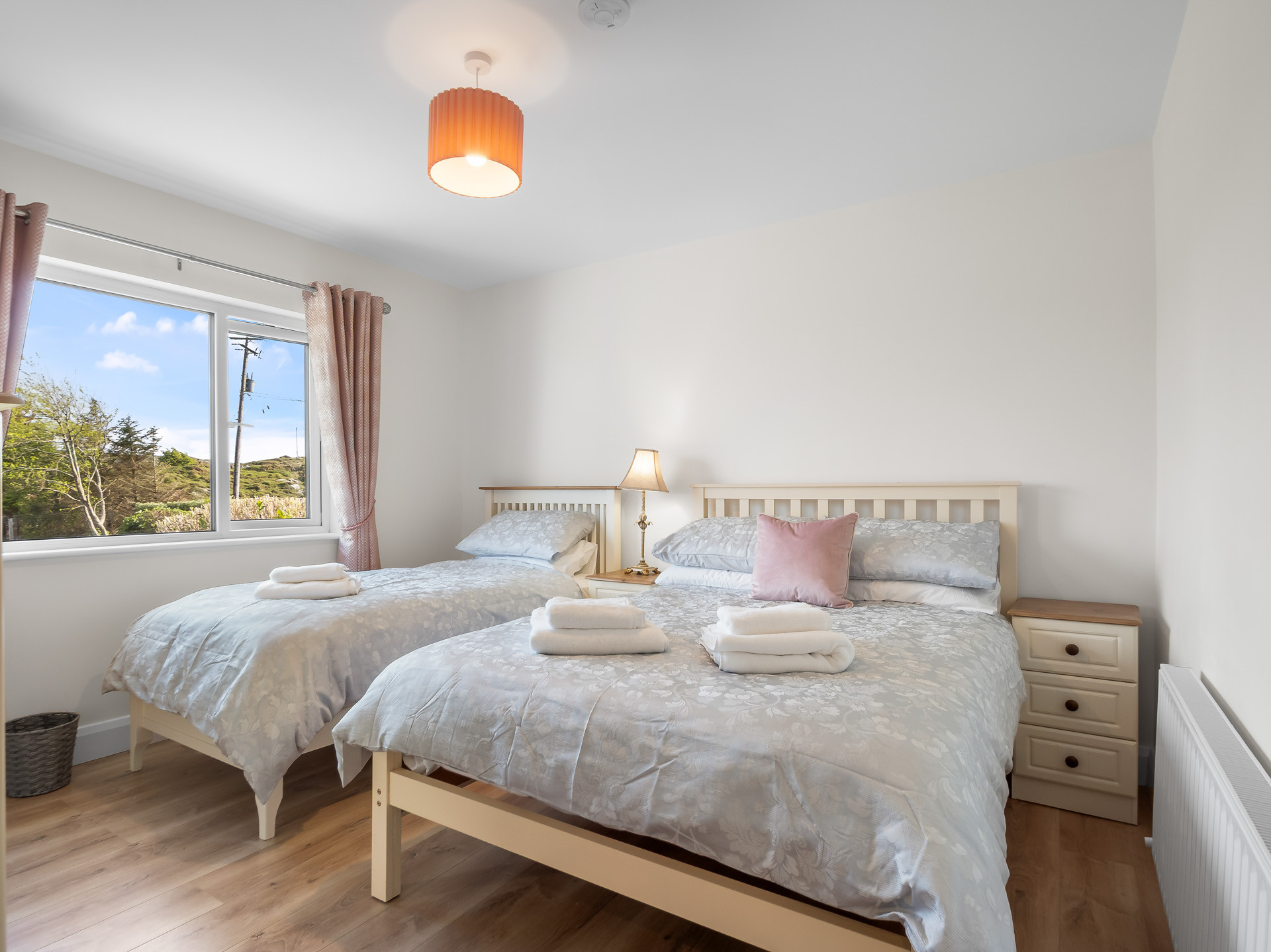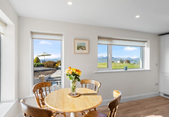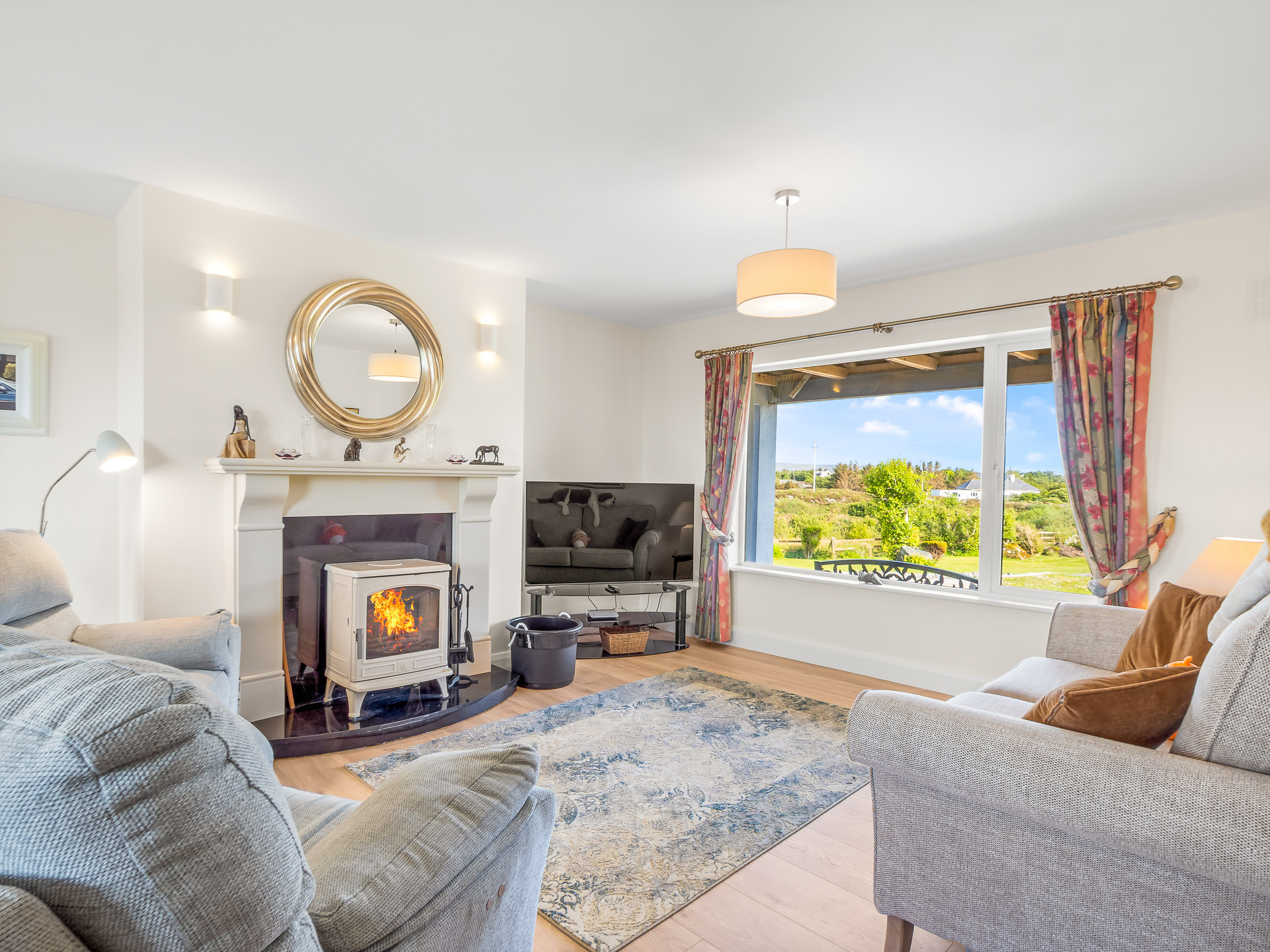 Upon entering Suantraí Cottage, the warmth of a double-sided stove welcomes you, anchoring the open-plan kitchen and dining area where culinary creativity comes to life. The kitchen is fully equipped with modern amenities, making meal preparation a pleasure. Adjacent to the kitchen, the dining area opens into a sun-soaked sunroom, providing a perfect spot for morning coffee or evening relaxation while overlooking the sea.