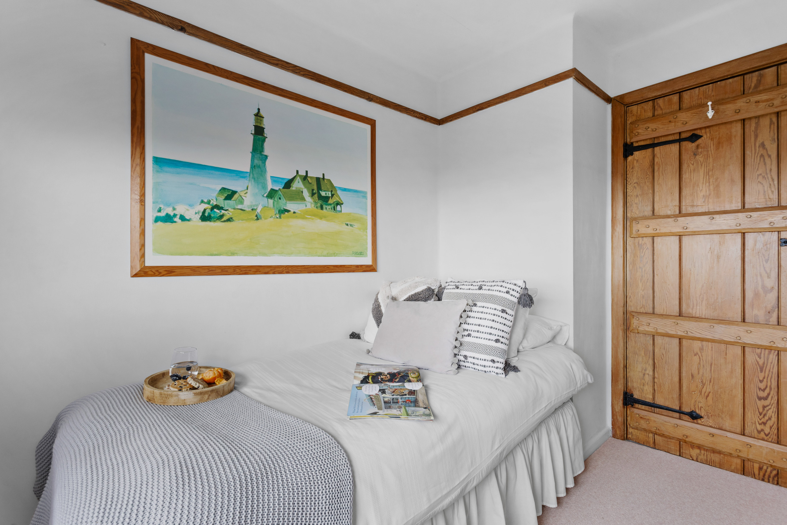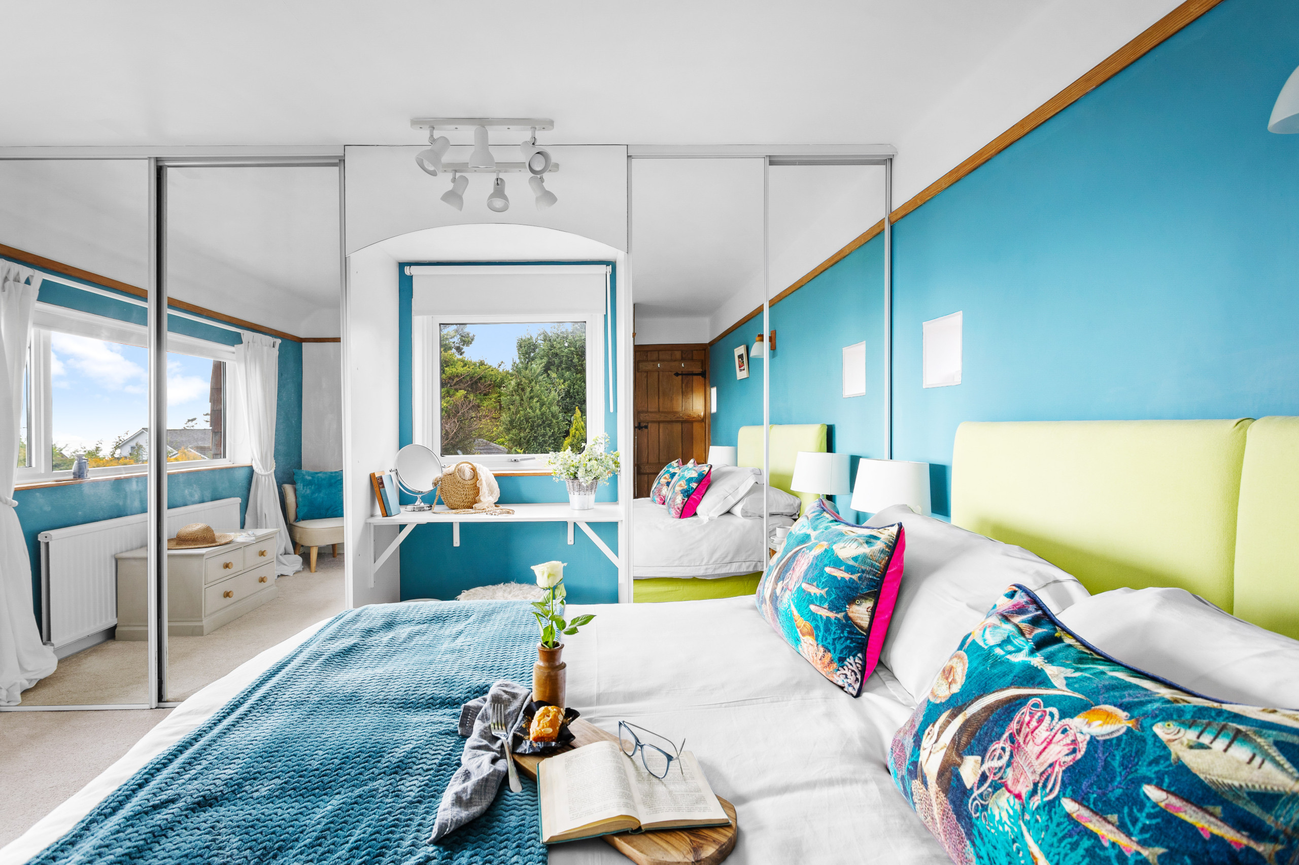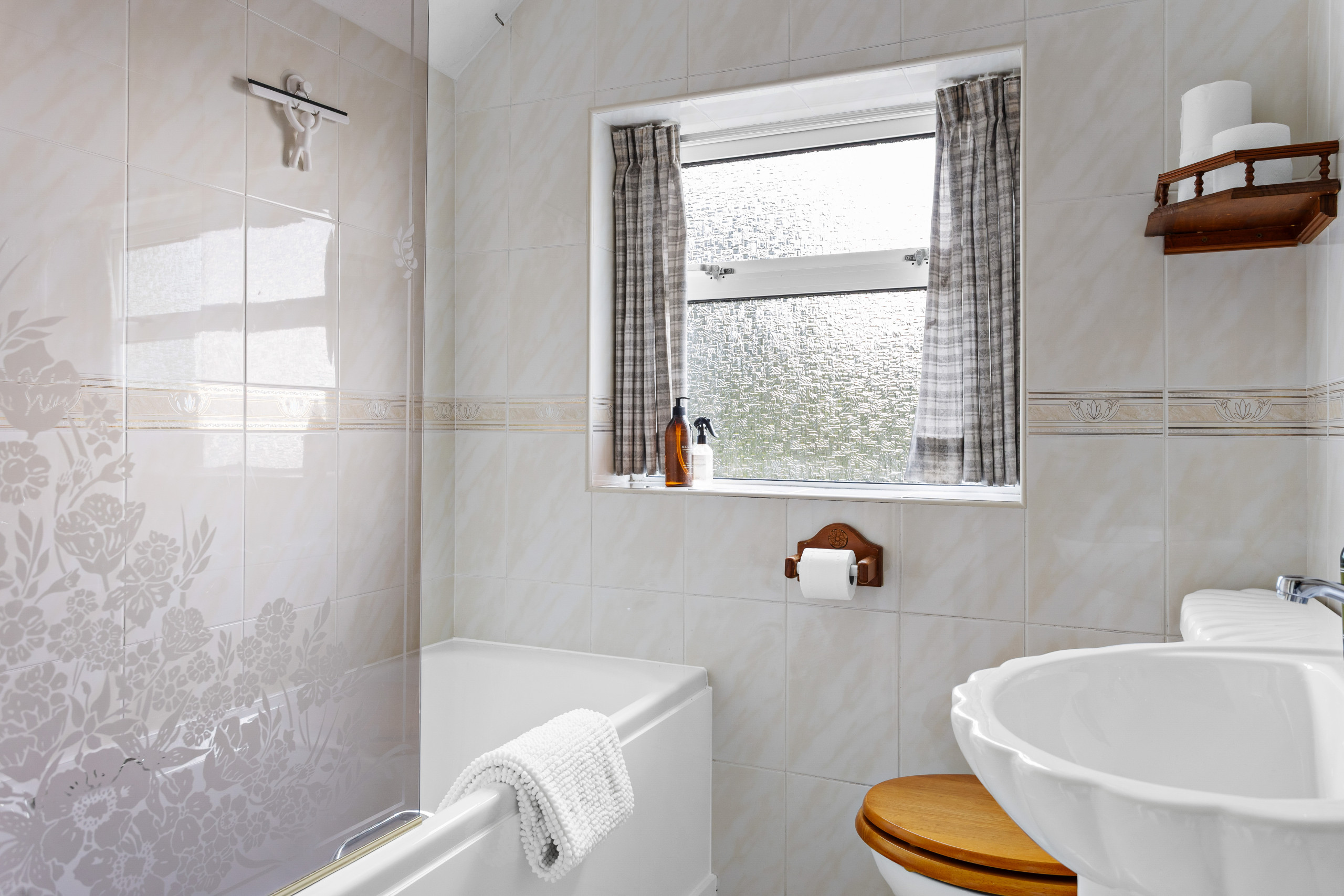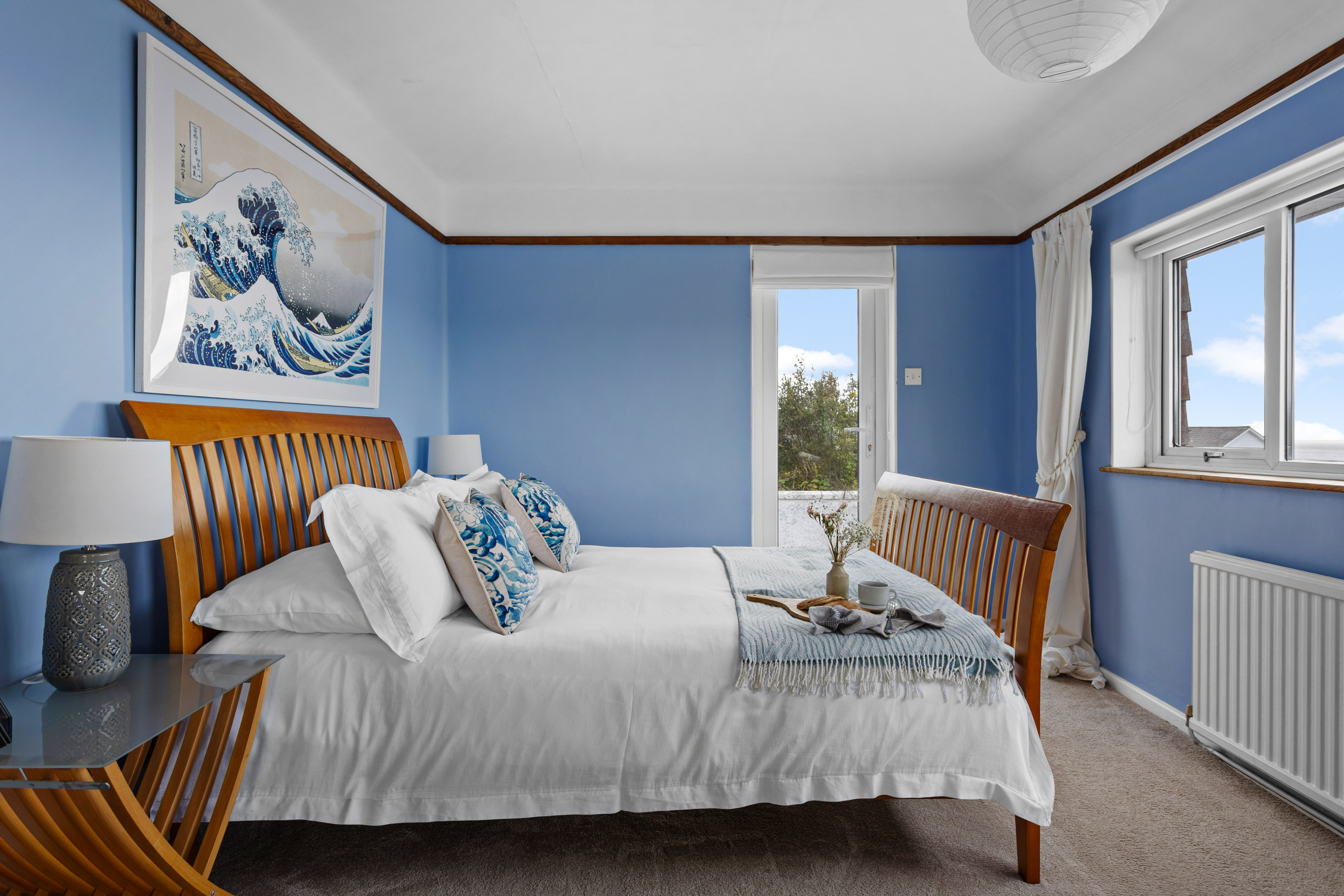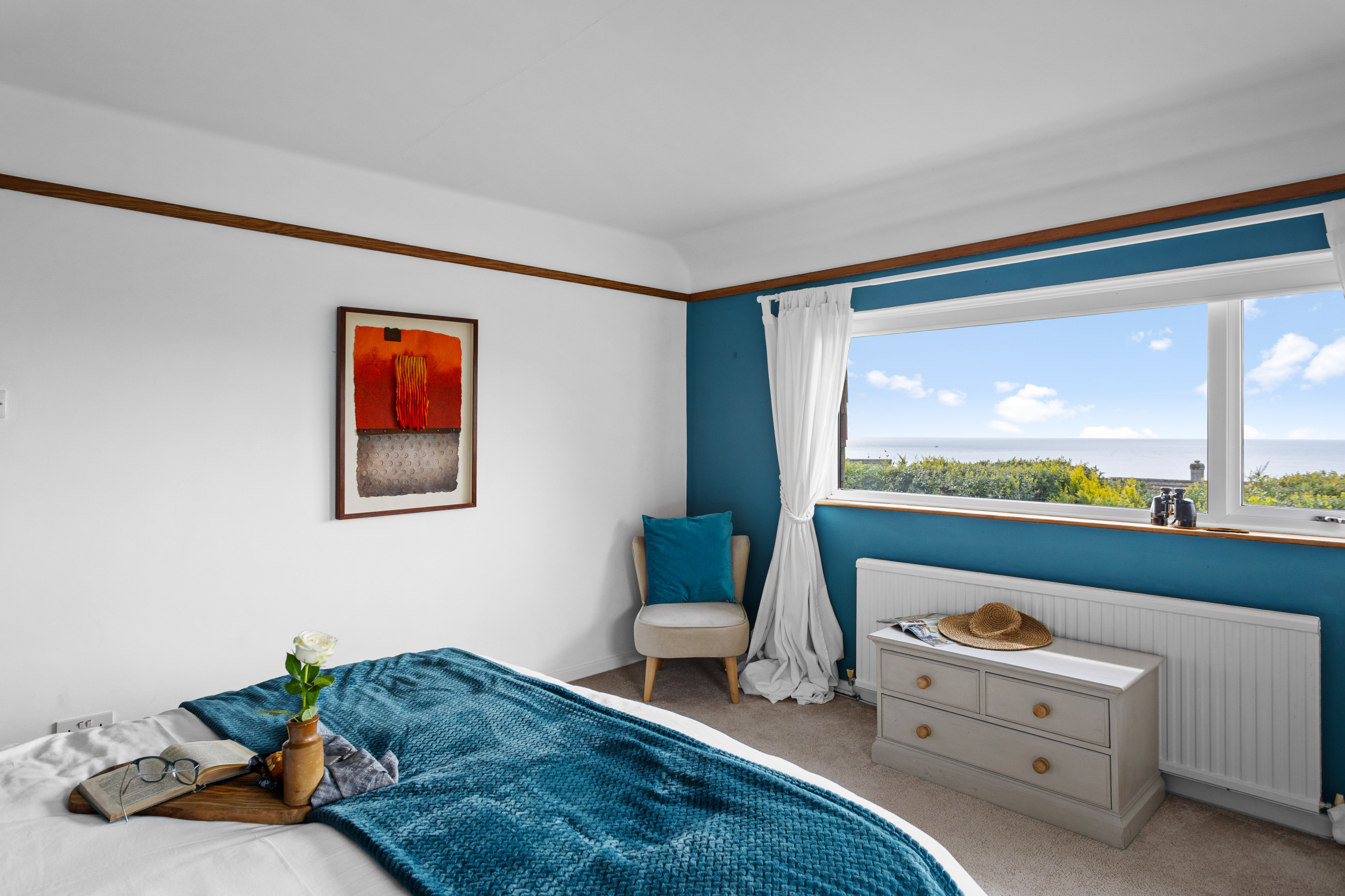 Upstairs, all three bedrooms are south-facing and boast sweeping sea views. The main bedroom features a king-size bed and built-in sliding wardrobes. The second bedroom offers a super king-size bed that can be converted into twin beds upon request, while the third is a cosy single room. The family bathroom includes a panelled bath with shower overhead, pedestal basin, and WC.