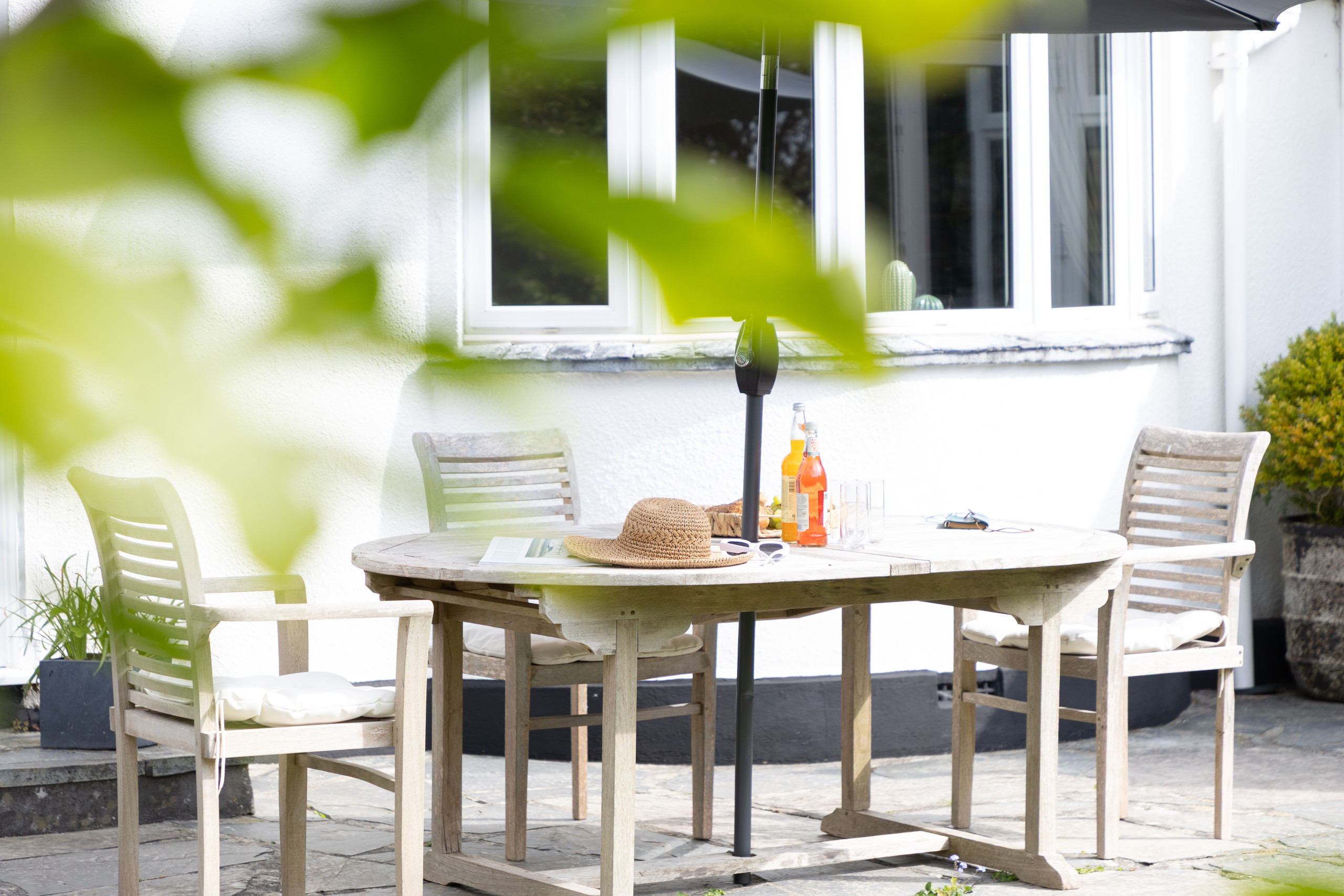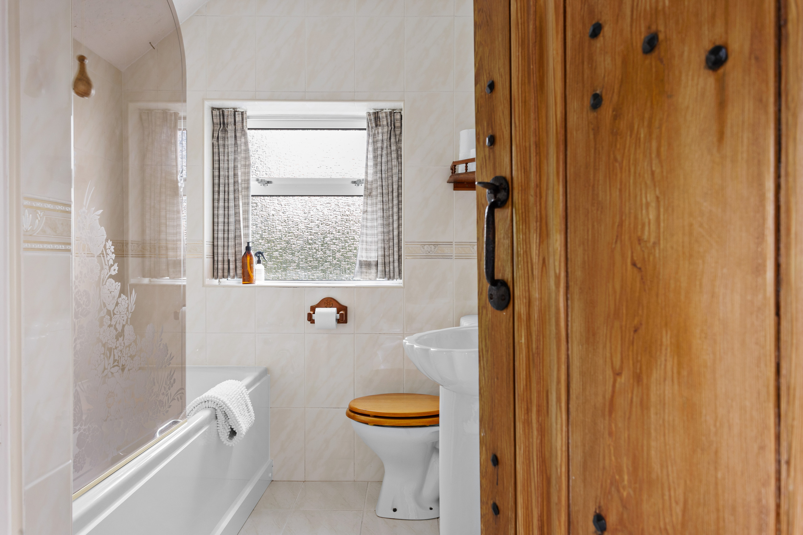 The well-equipped kitchen provides everything you need to whip up a delicious meal after a day by the sea. Enjoy your creations in the sunny conservatory dining area or step out into the garden and dine al fresco and where you’ll also find a fire basket BBQ — perfect for gathering around on cooler evenings. A utility room with washing machine, microwave, and fridge freezer, along with a downstairs cloakroom, complete the ground floor.