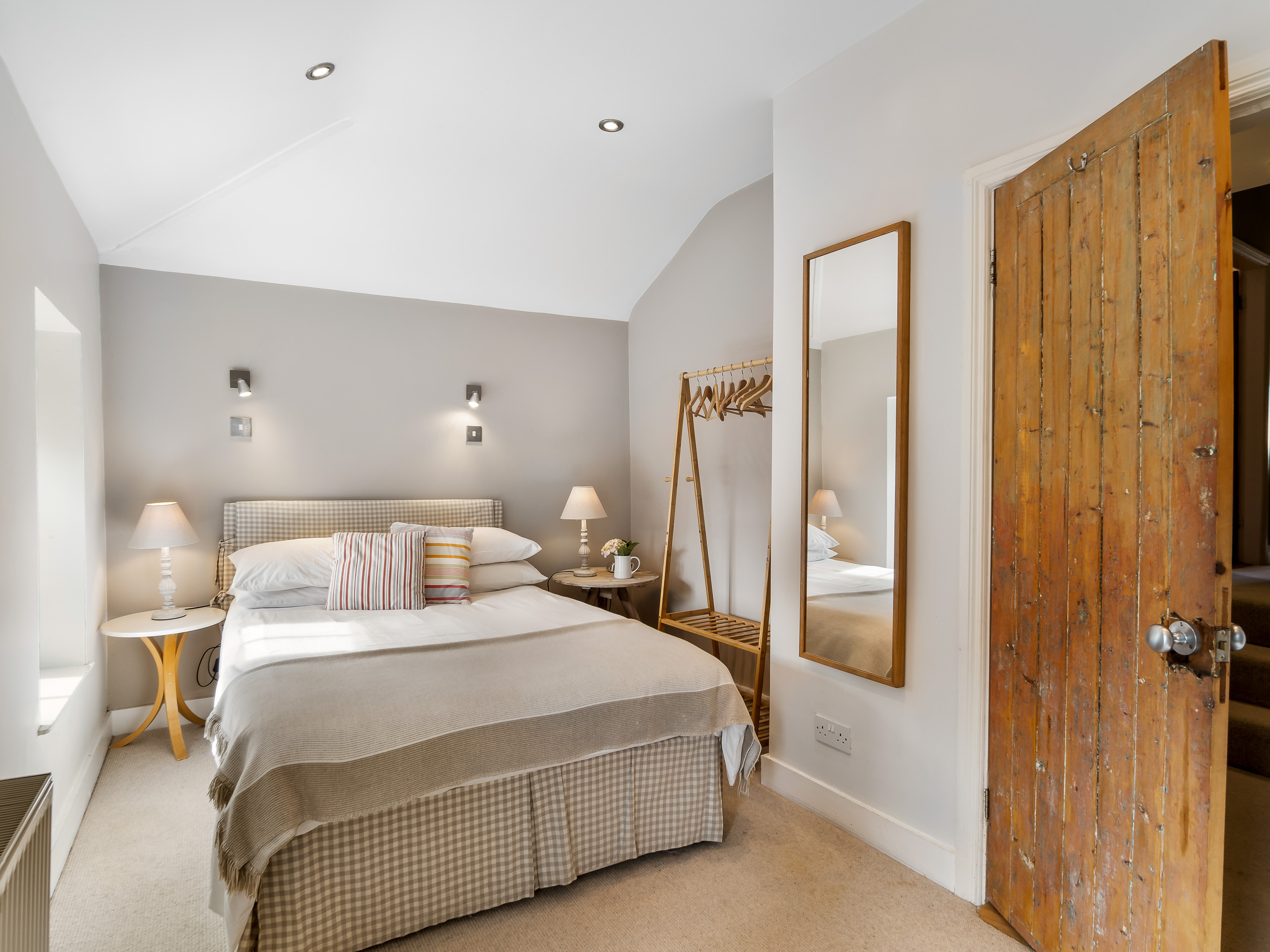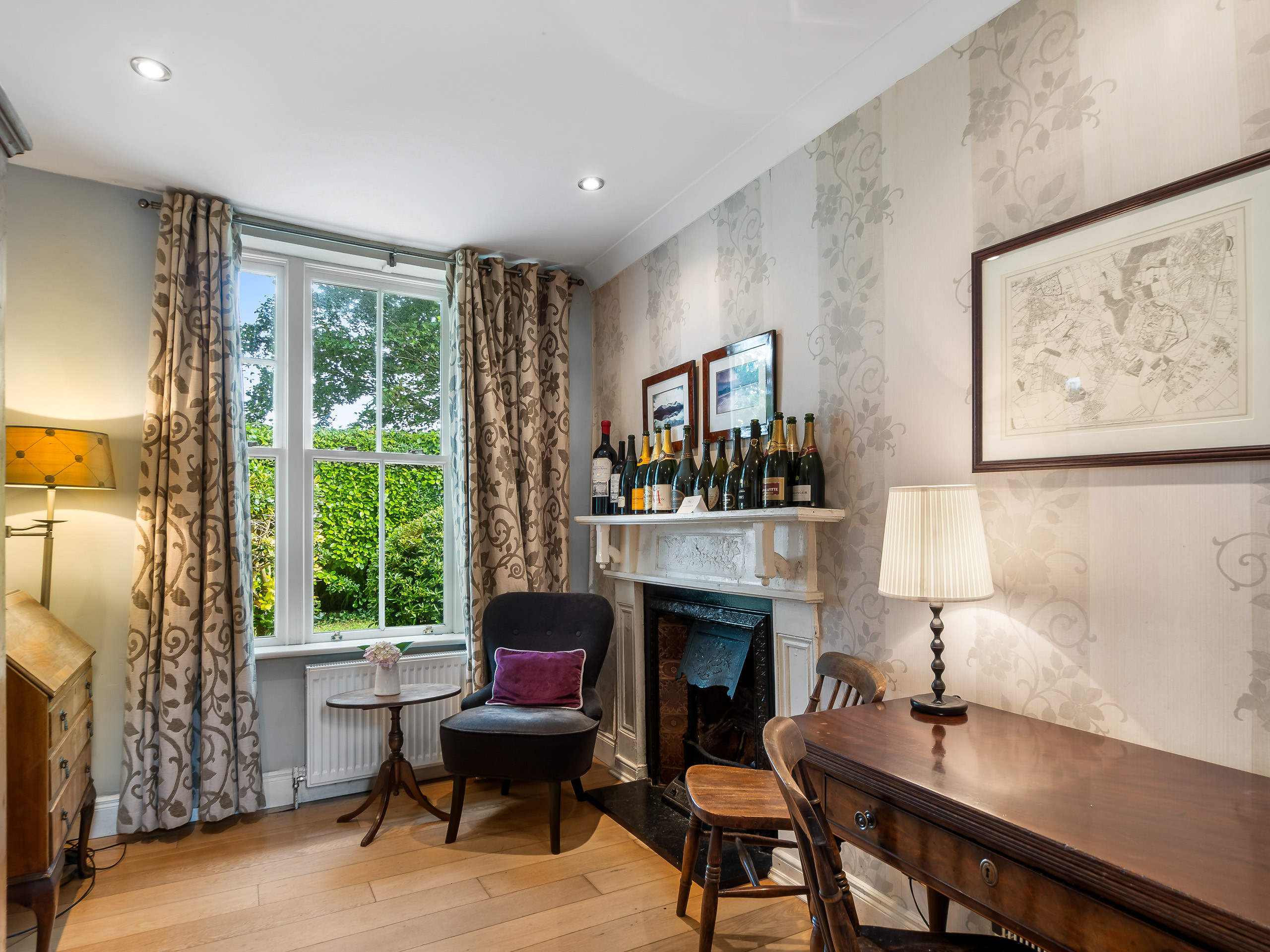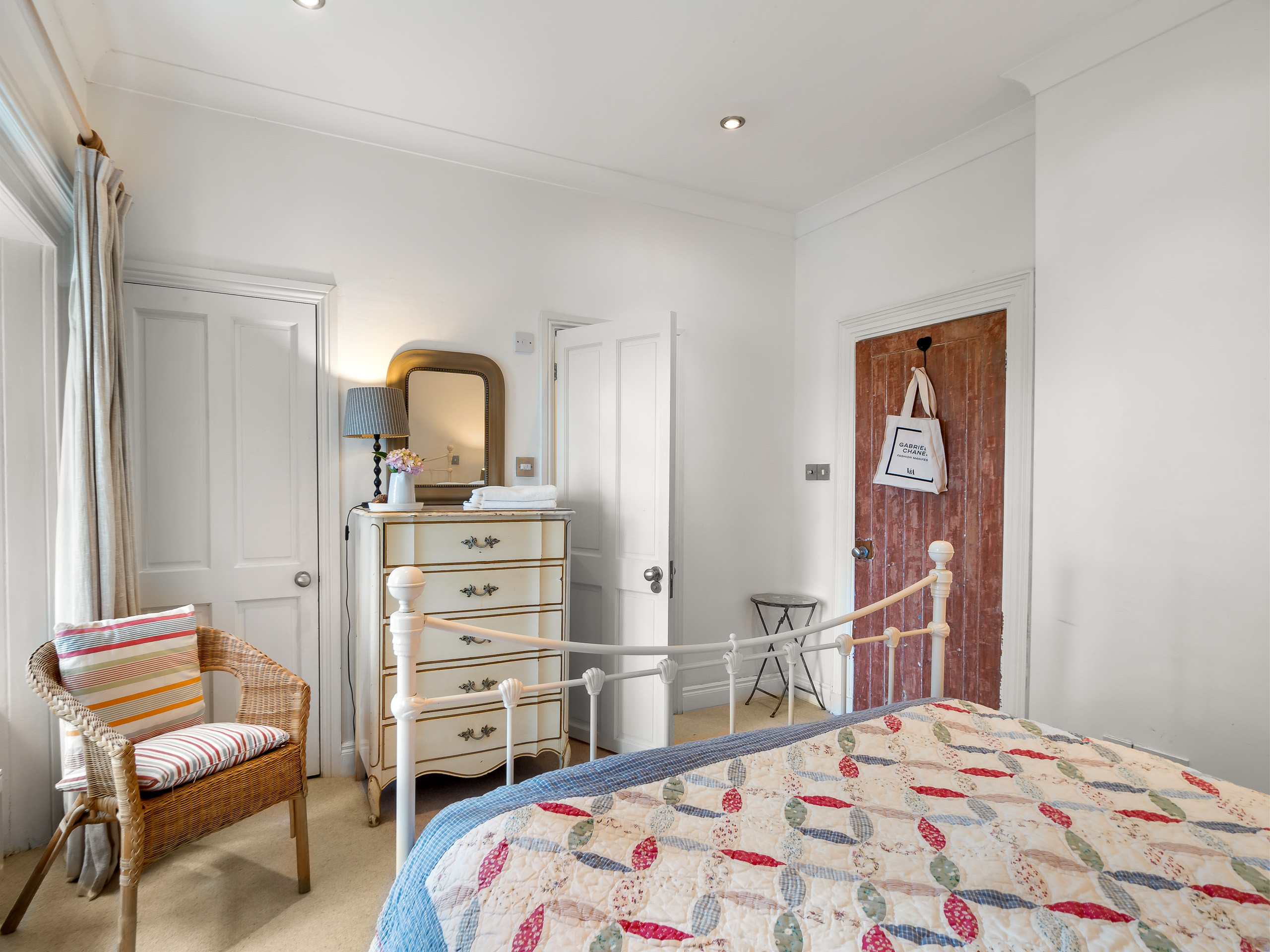 Bedroom 2: King-size bed, wardrobe, dressing table and free-standing mirror. High ceilings, 2 windows with beautiful views overlooking the gardens and allowing ample natural light.