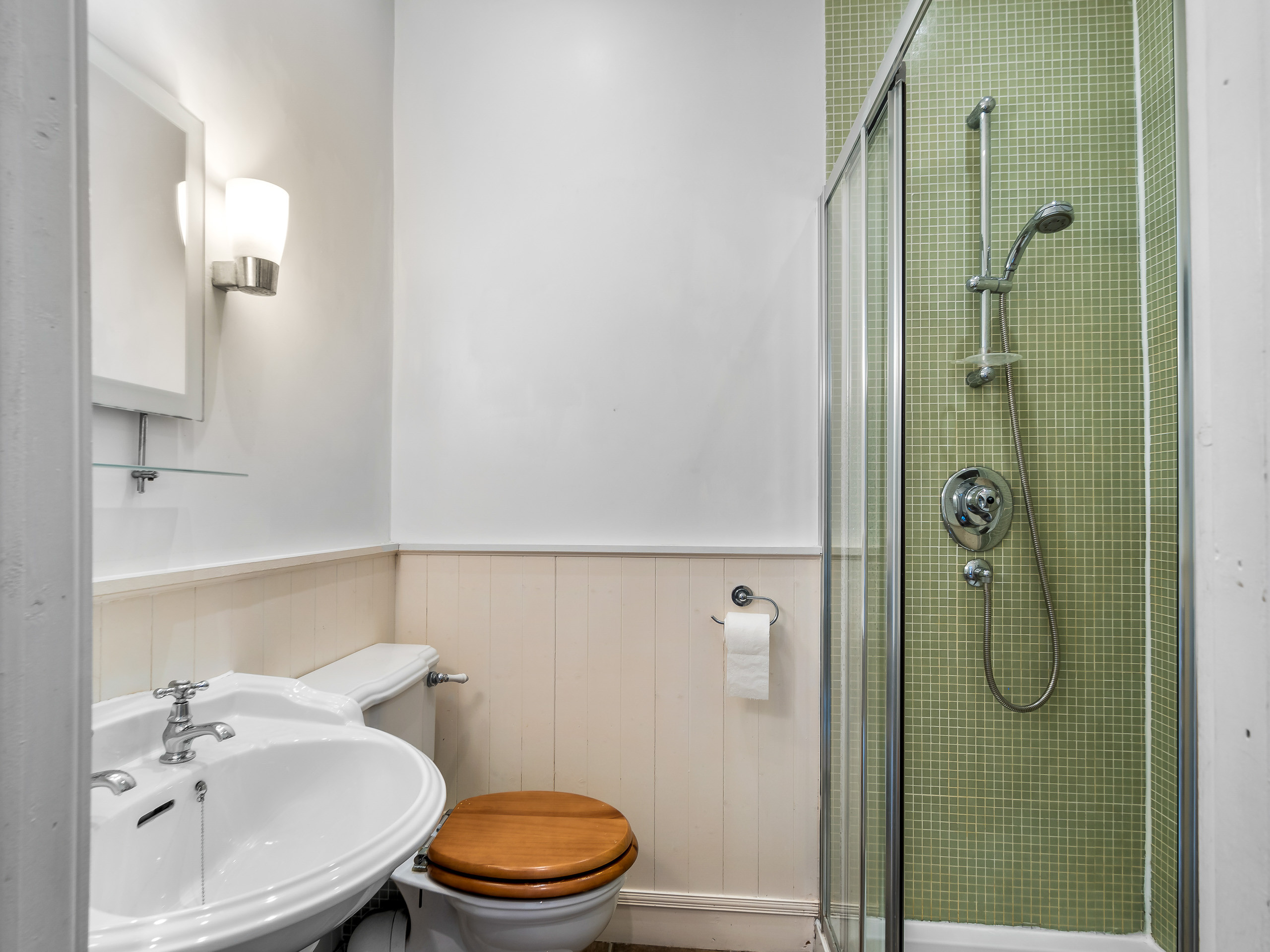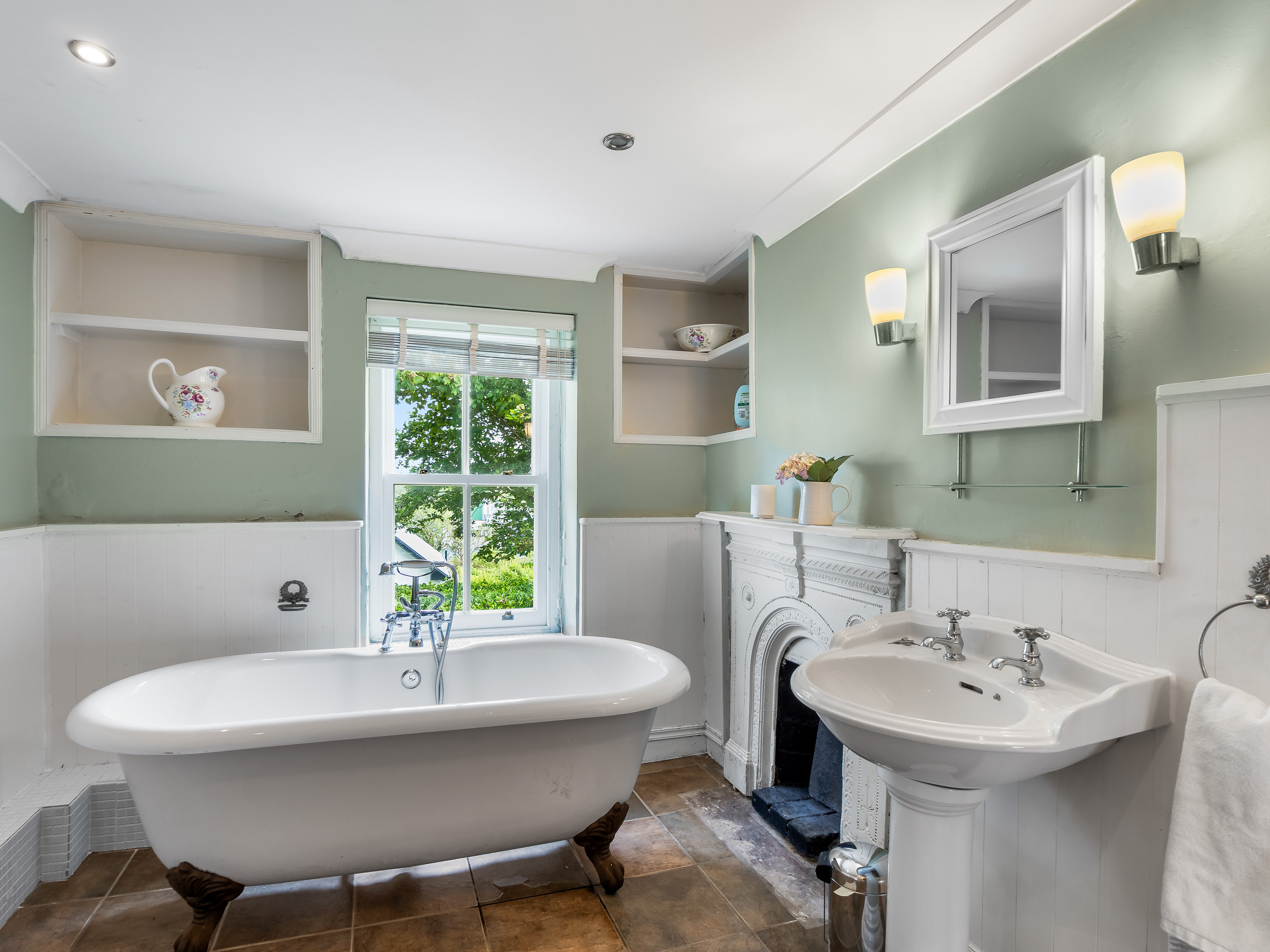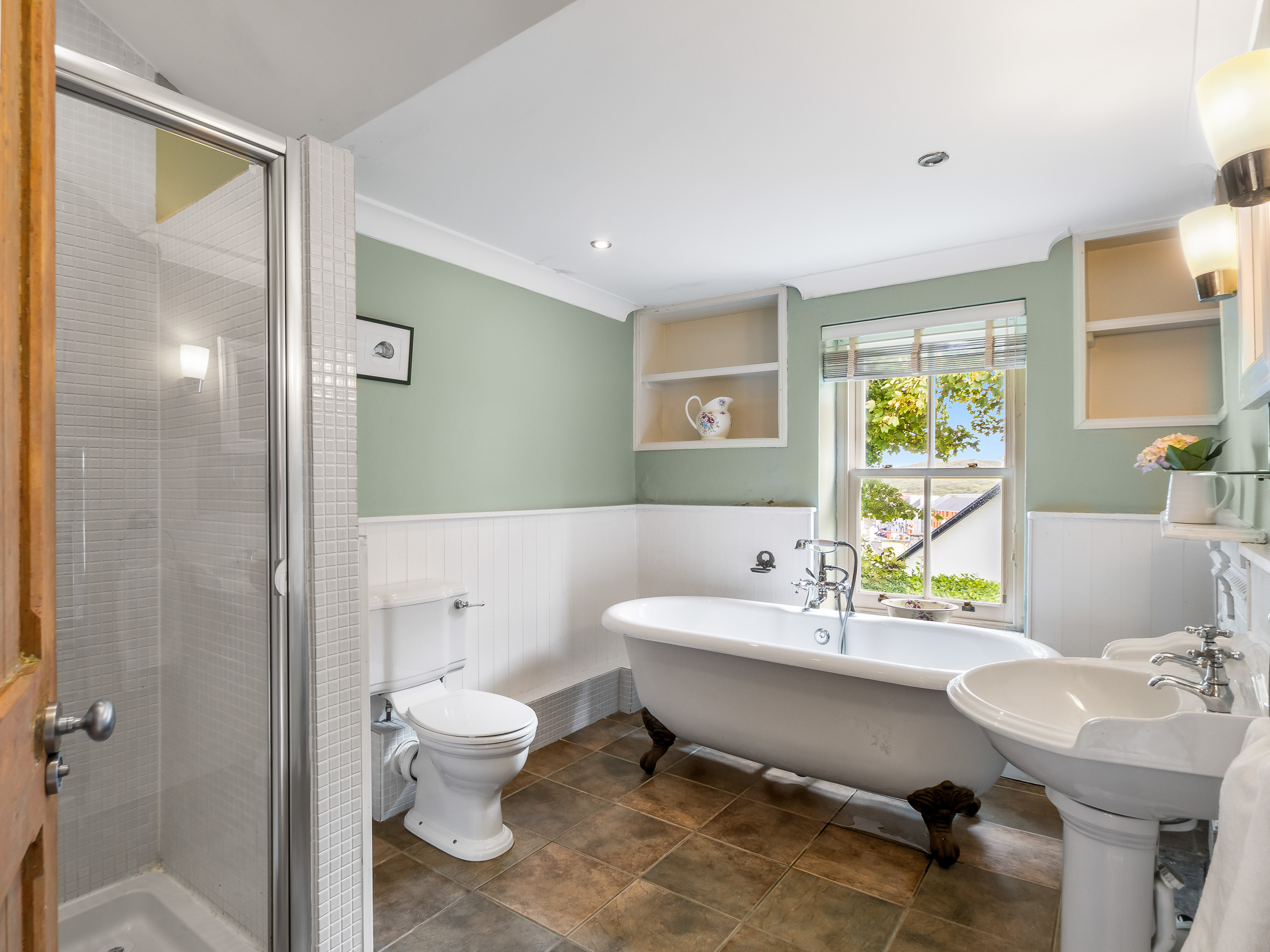 The main bathroom has a freestanding clawfoot bath and separate shower plus WC and washbasin.
