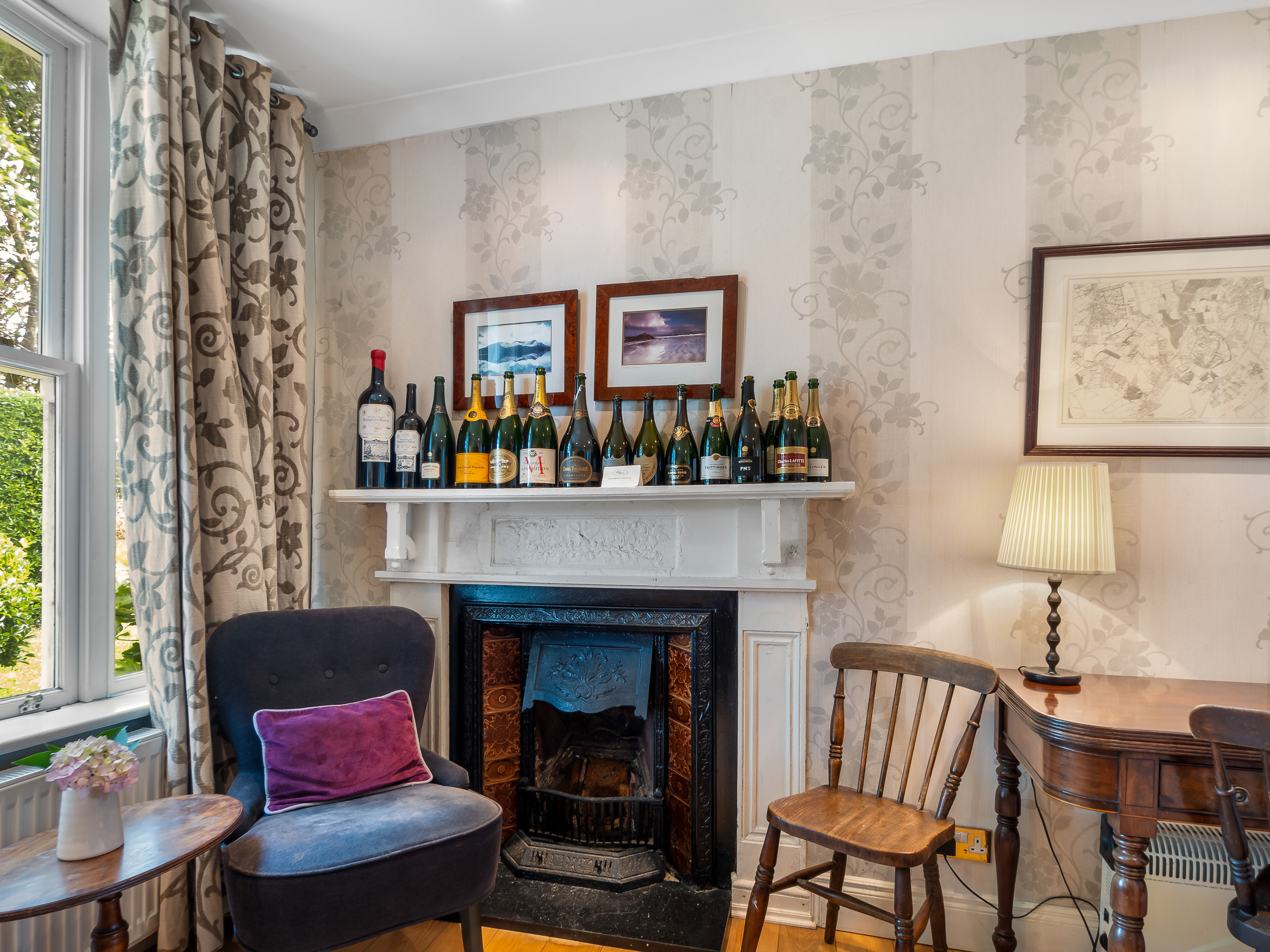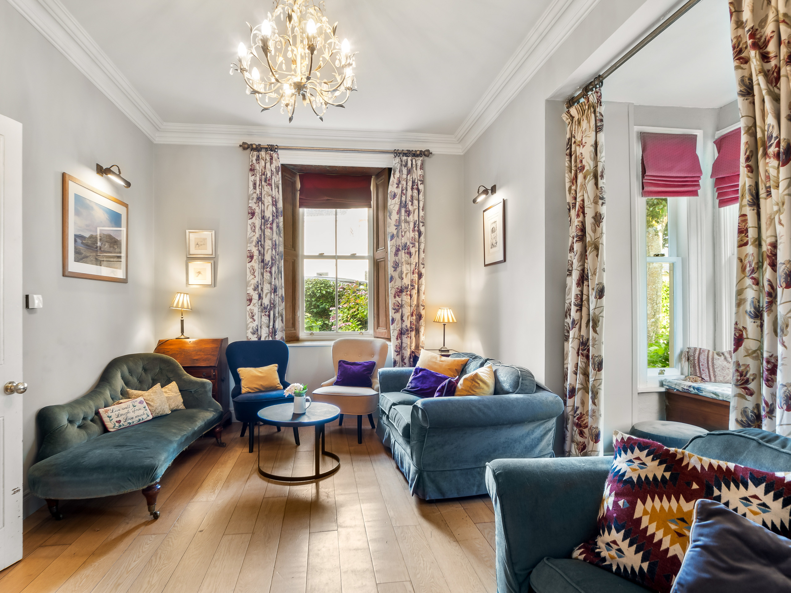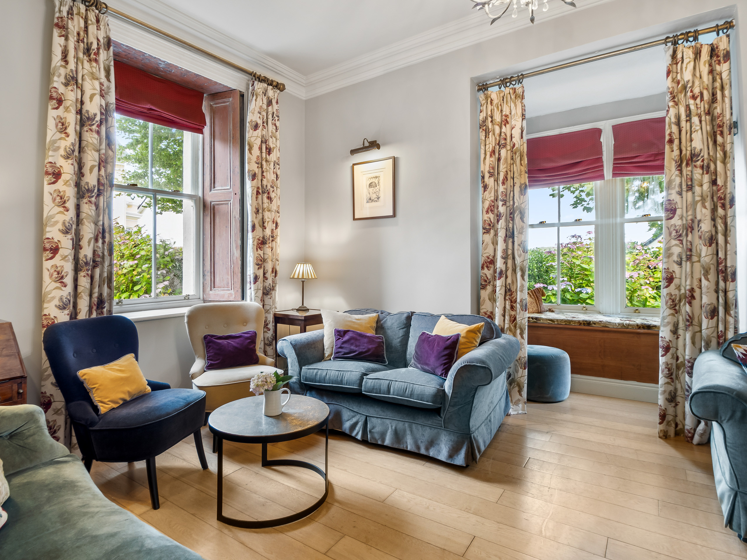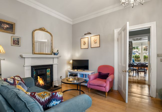 Elegant, very cosy sitting room with large picture windows with sea views, comfy sofas and gas fire.
