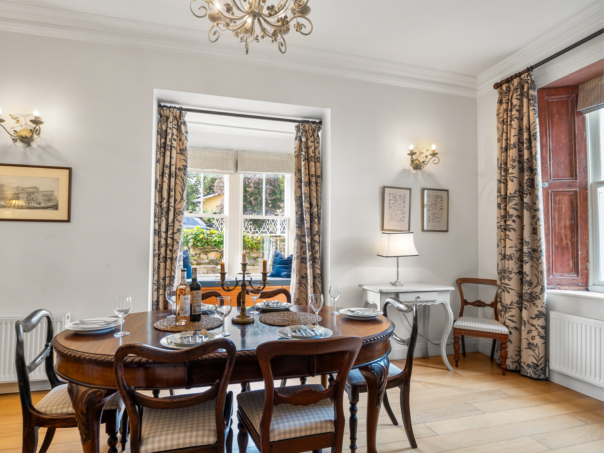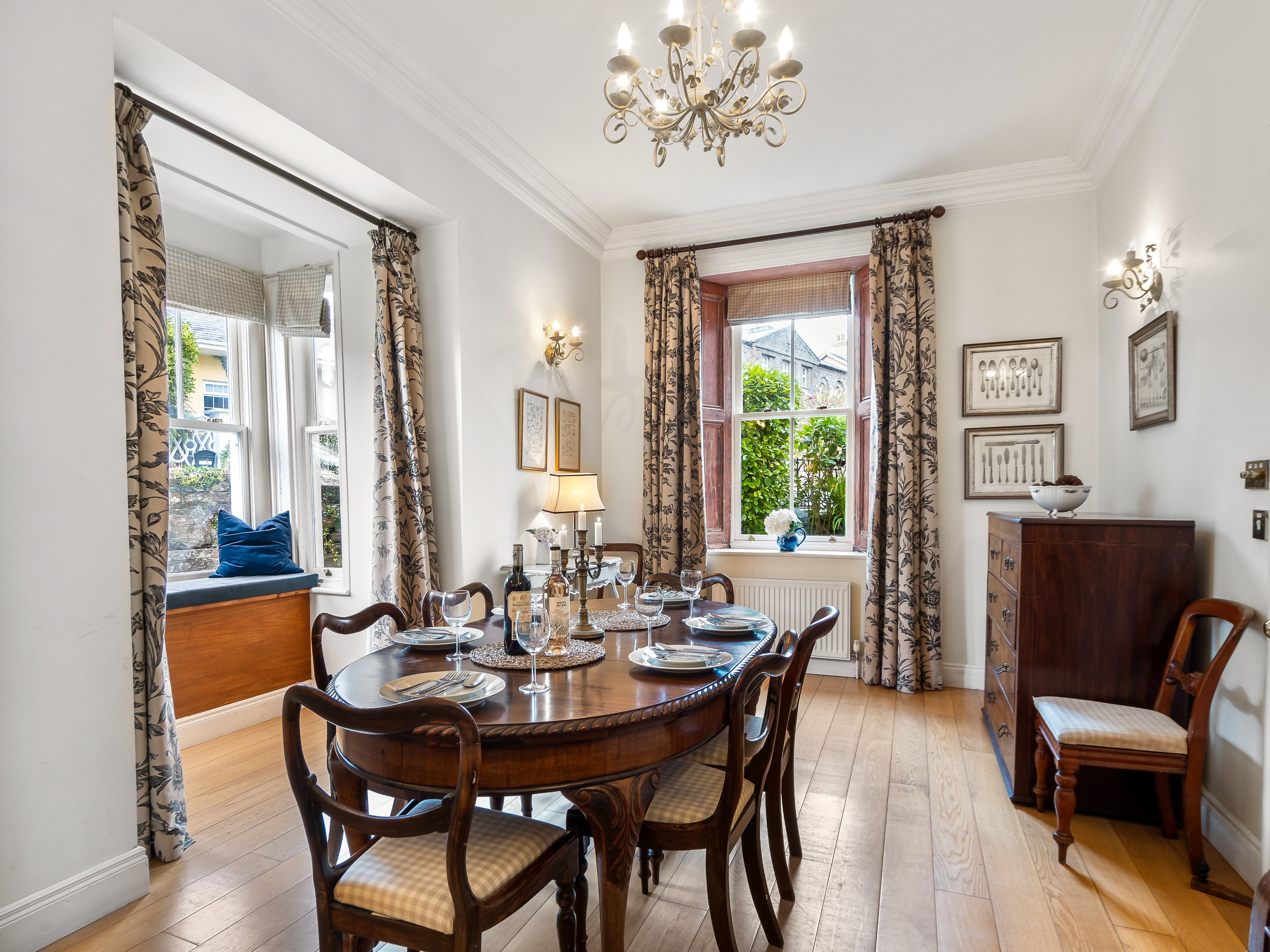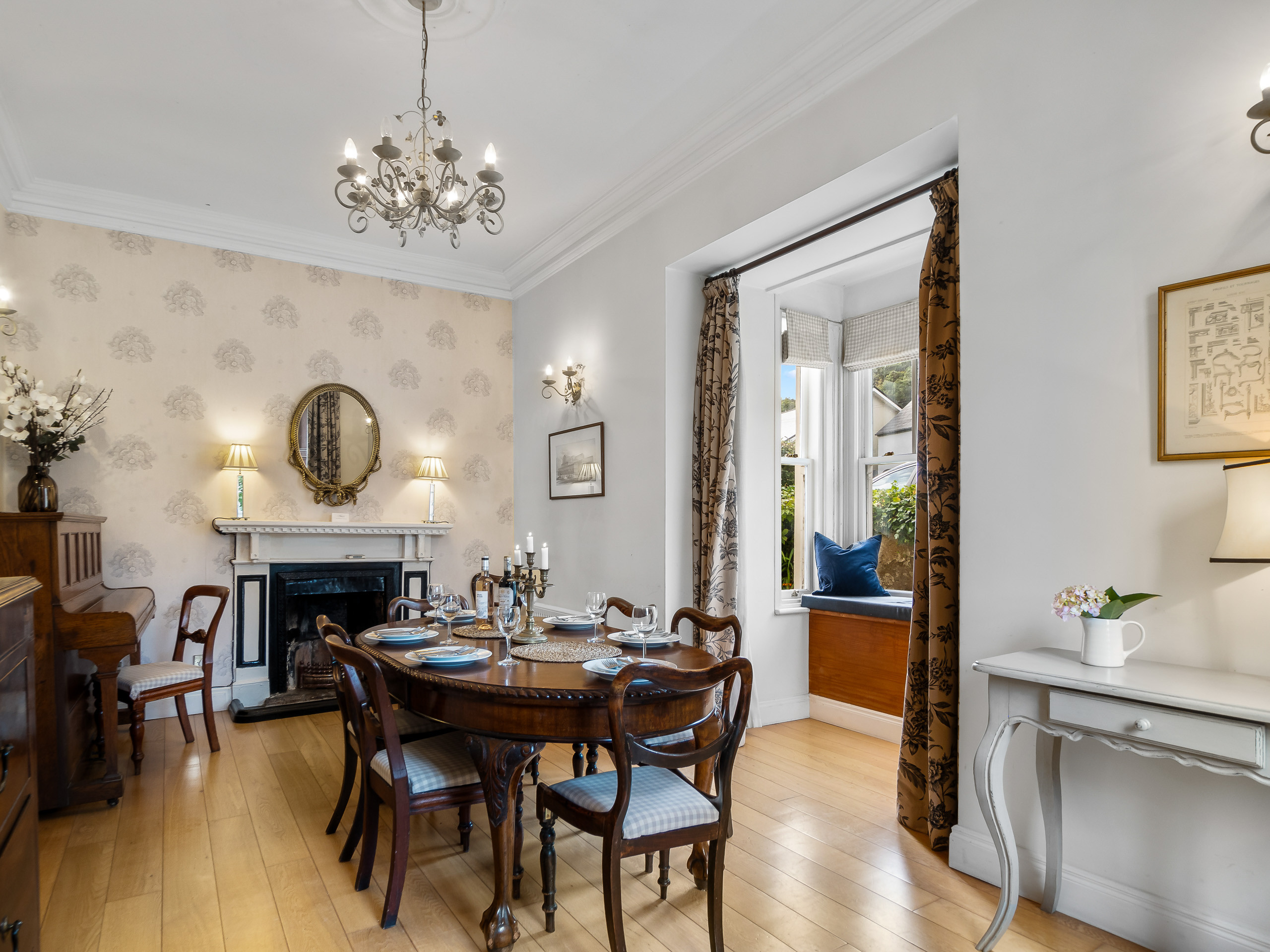 To the right of the hallway is an elegant dining room with an ornate fireplace and large windows overlooking the front and side of the property. Dining table seating 8 -the perfect room for entertaining.