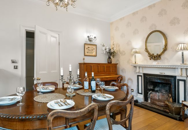 The dining room hosts a large dining table which seats up to 6 along with a smaller table seating up to 3. There is an open fireplace, ample windows allowing natural light and high ceilings. There are 2 doors leading from this large impressive room.