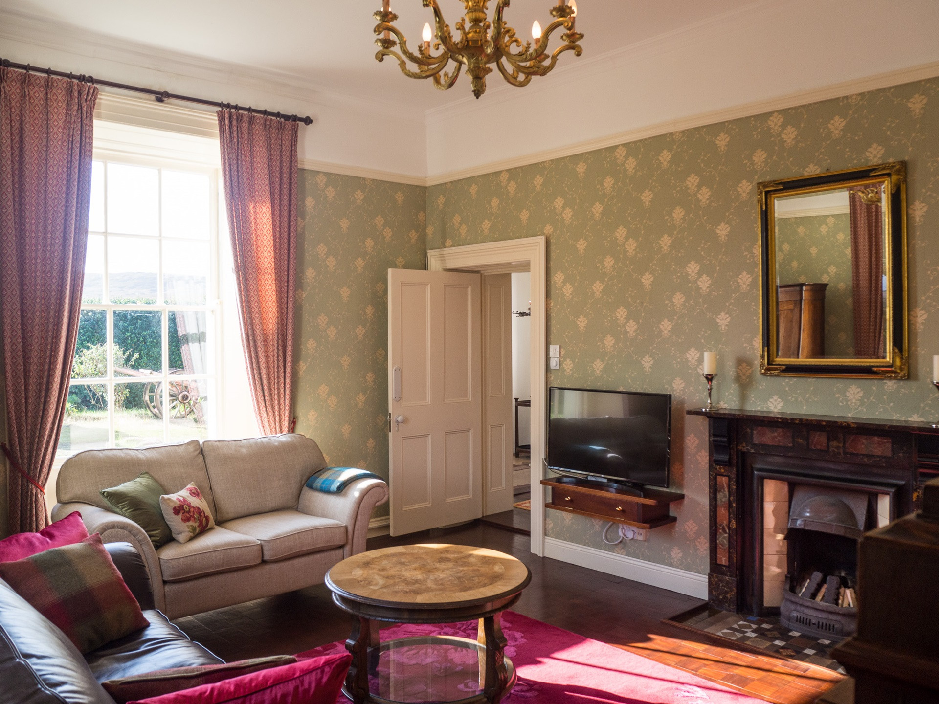 Elegant, very cosy sitting room with large picture windows with sea views, comfy sofas and gas fire.