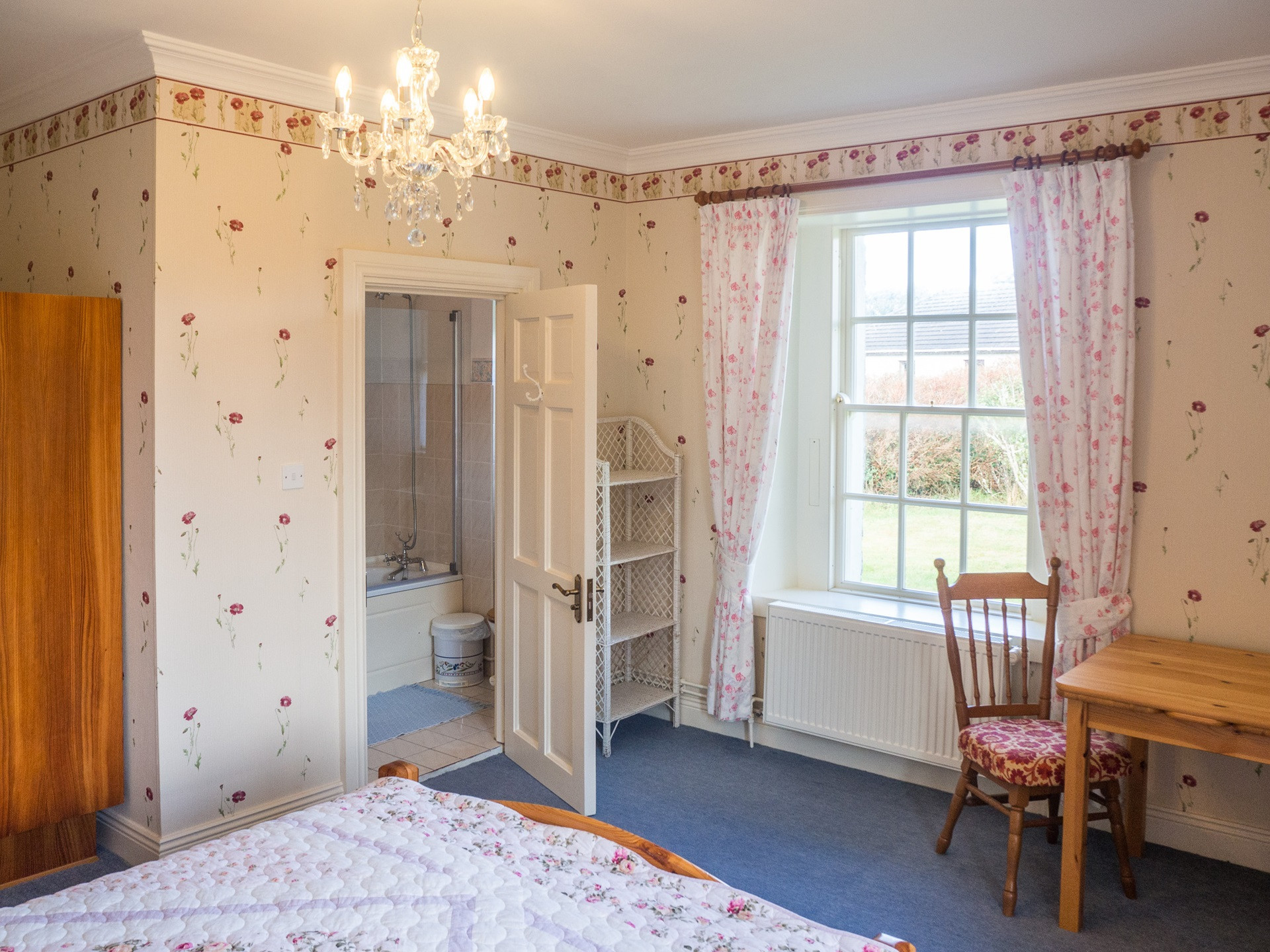 The bedroom comprises 2 large windows overlooking the front and back of the property. Table with 2 chairs, door leading to an ensuite bathroom with bath and shower overhead, sink & WC.