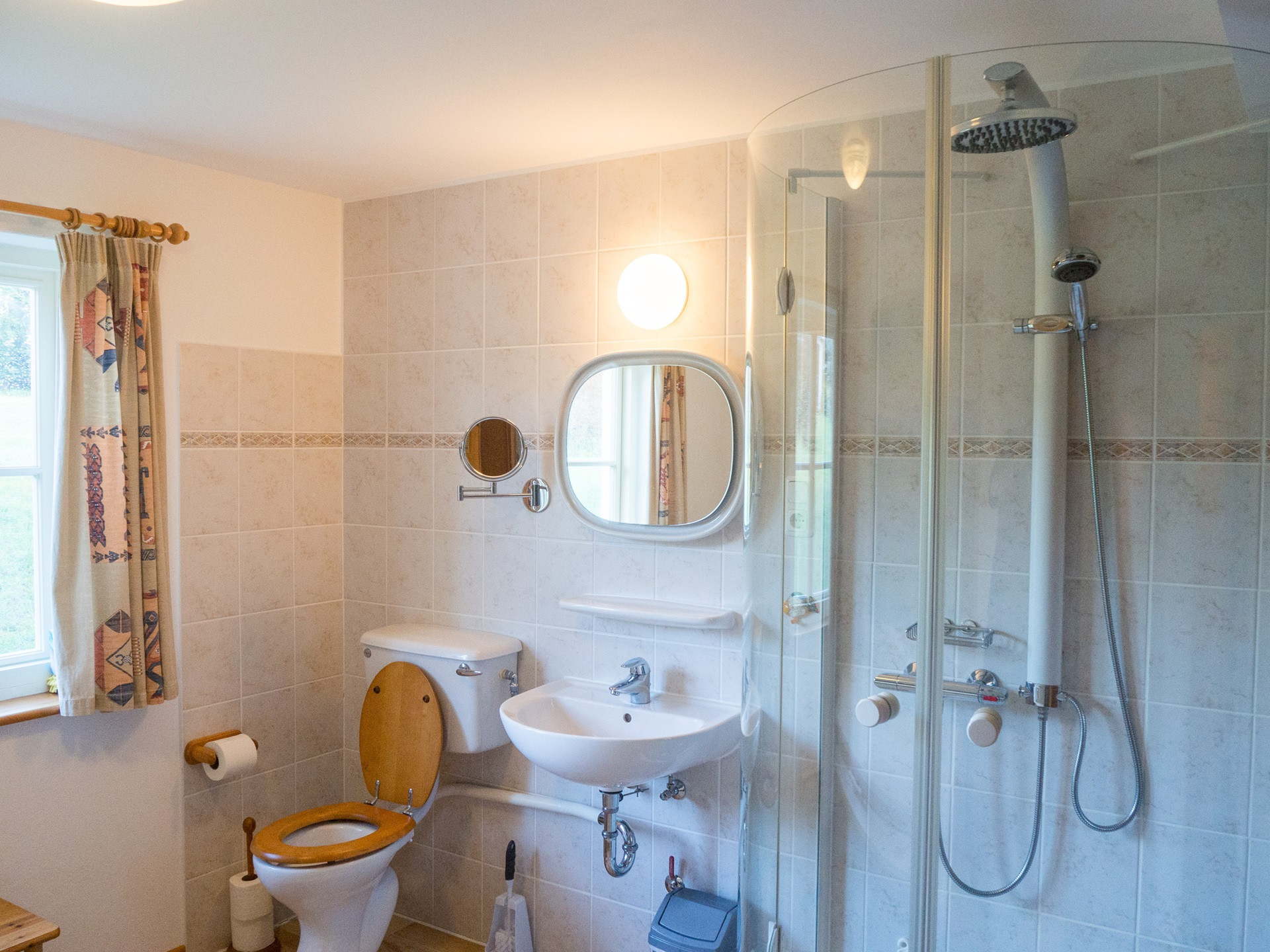 Family bathroom with bath, shower overhead, sink unit & WC.