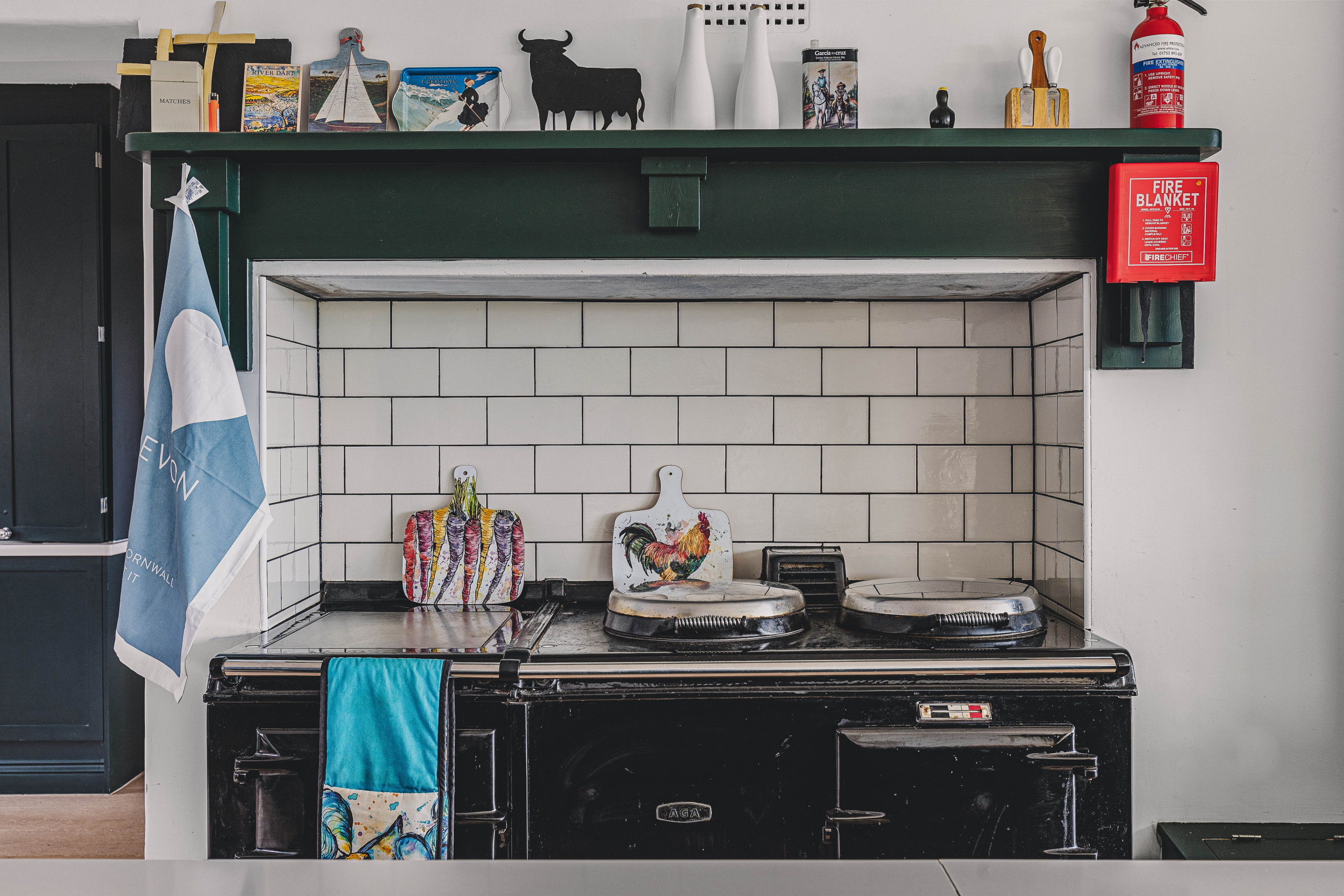 There is a beautiful bespoke handmade kitchen with built-in fridge, dishwasher, an oil-fuelled Aga, ample worktops and a breakfast bar, and with seating to the side.