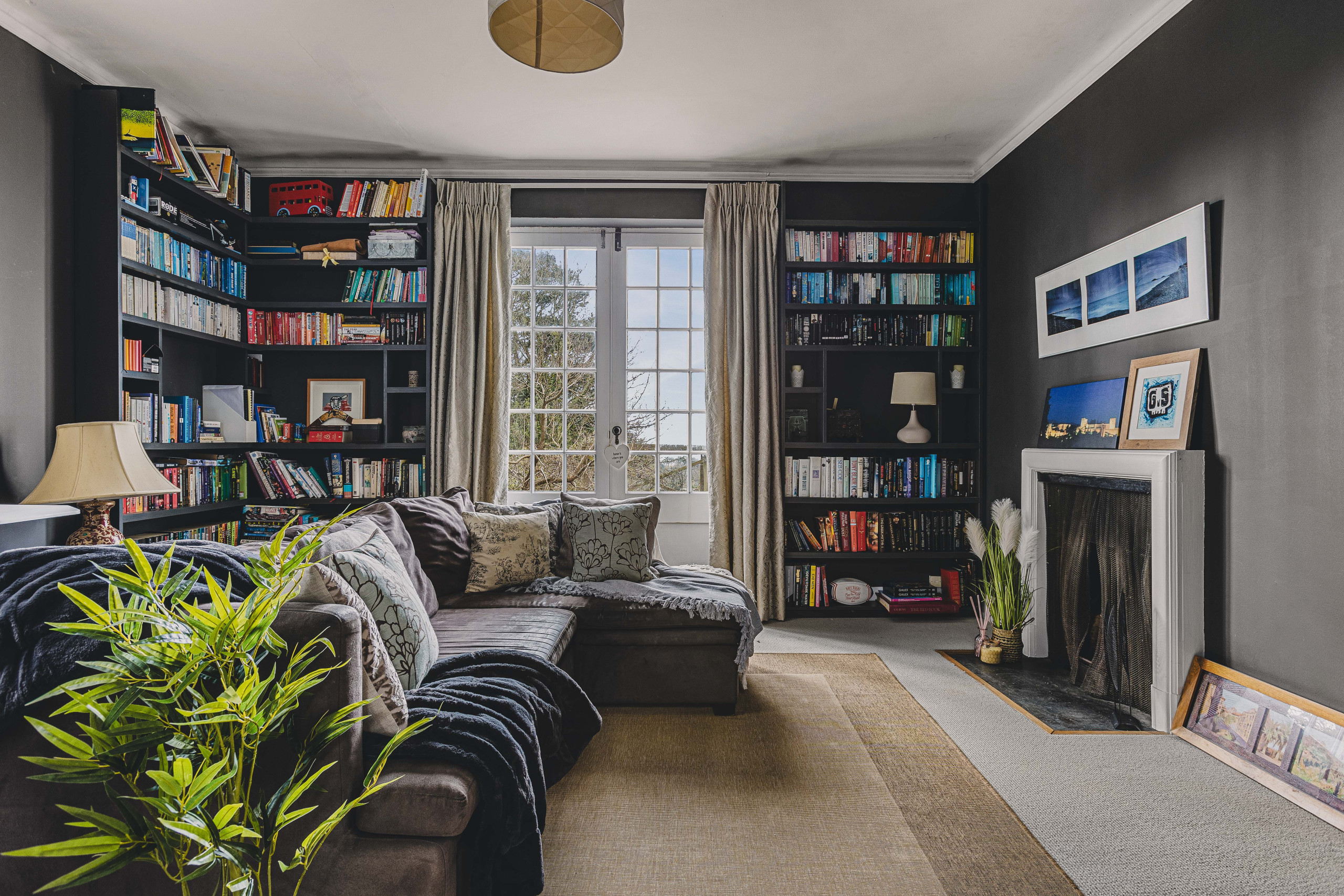 The large living/dining room with centrepiece stone fireplace and original oak flooring also has high ceilings, with windows overlooking the gardens and the sea beyond.