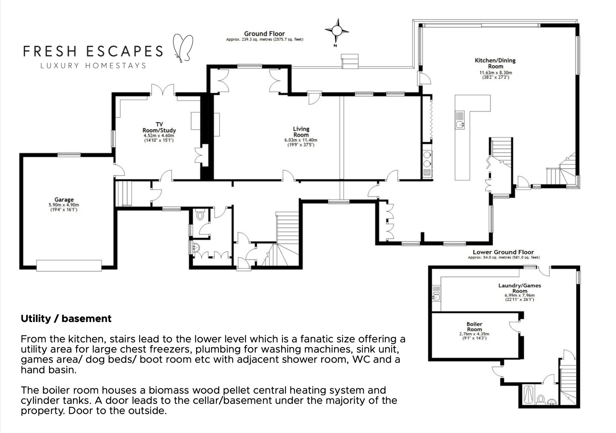 From the kitchen, stairs lead to the lower level with a utility area, with adjacent shower room, Wc and a hand basin.