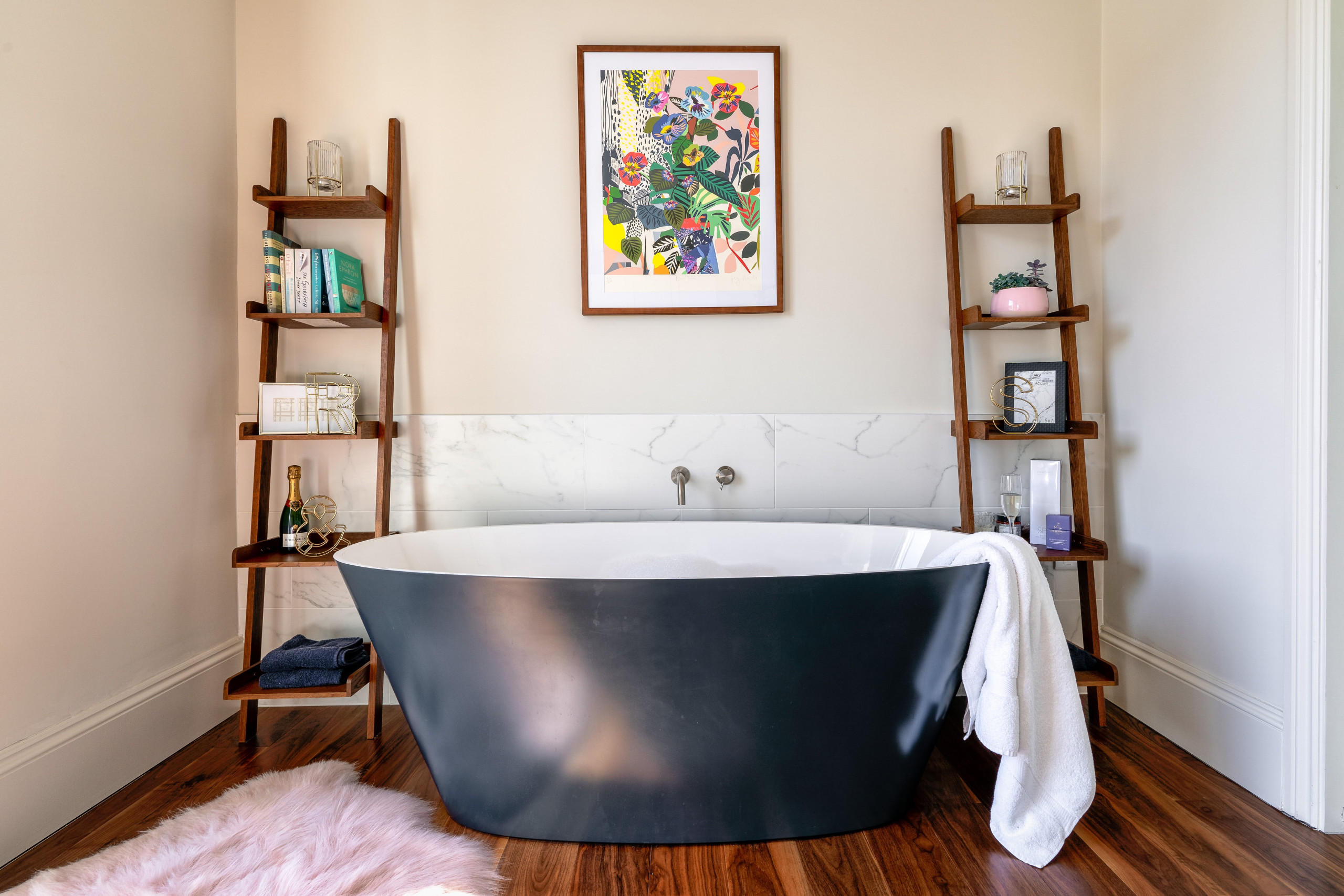 The symphony of uplifting colours and textures continues in Two Guns’ four bedrooms. The master bedroom has a super king-size bed and boasts its own deck plus a double-ended tub – the views from the bath are spectacular! Decorated in chic muted tones, and accessorised with soft throws and pom-poms aplenty, this spacious, light-filled room also has an ensuite shower room with a hand basin and WC.