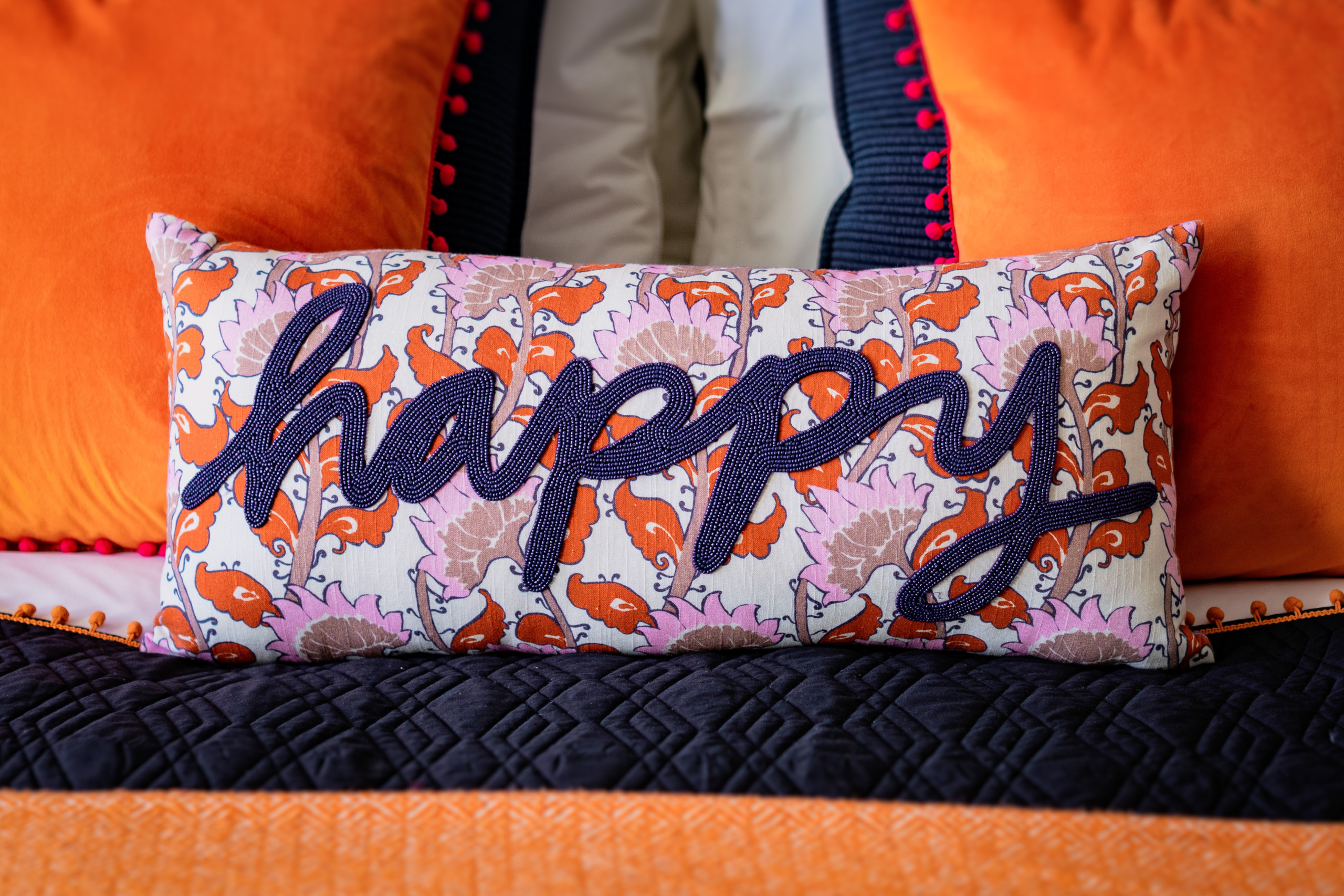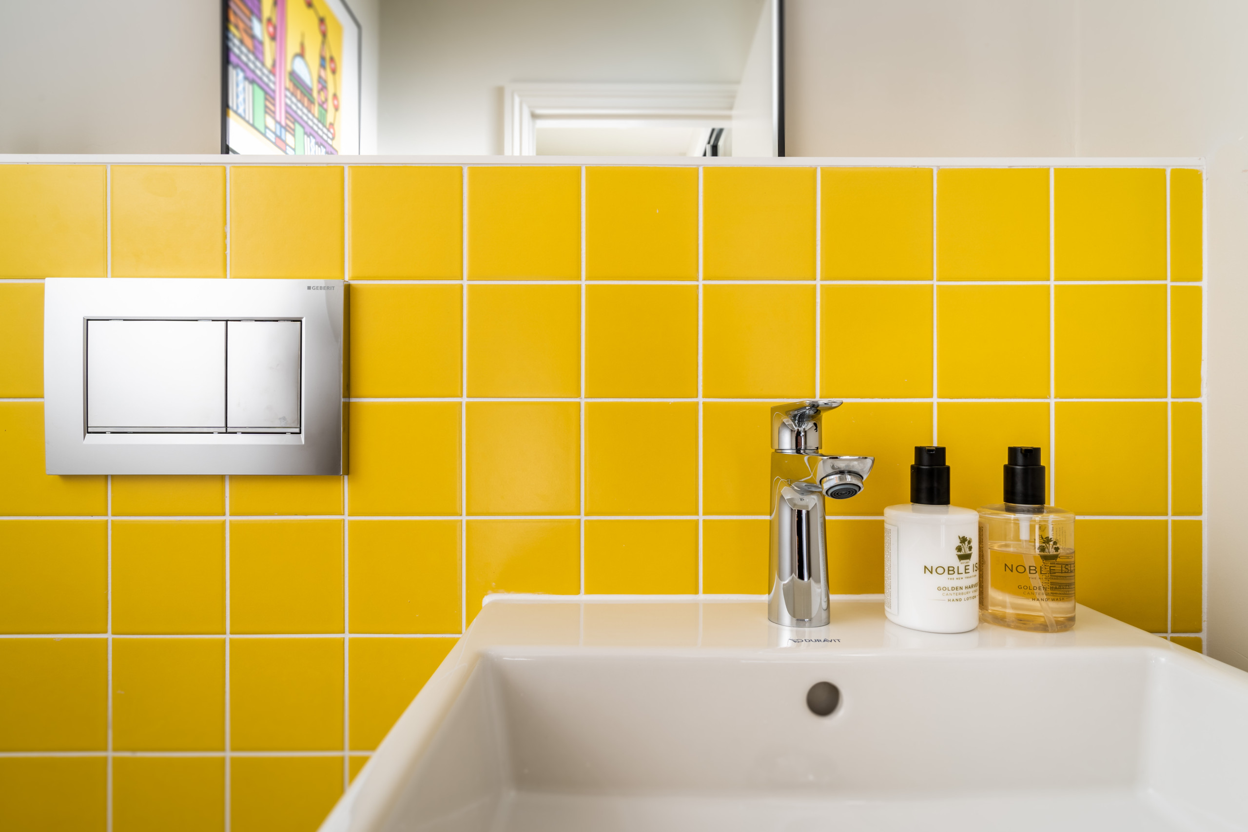 A third bedroom, accessorised with yellow throws and bright geometric cushions, provides two three-foot single beds that can be made into a super king bed upon request.