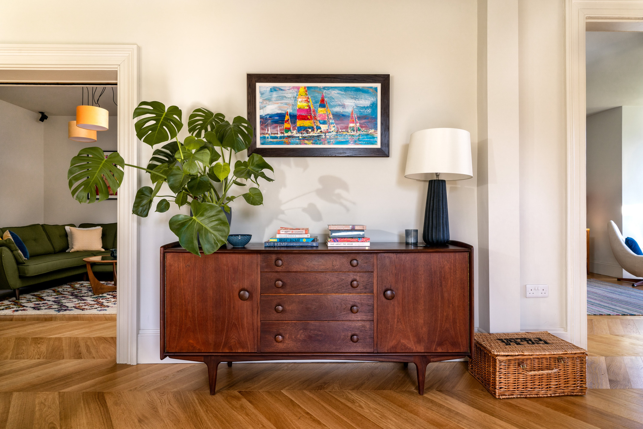 Set over three floors, the heart of this home beats within the light and airy open-plan dining, lounge and kitchen area, complemented by a canary yellow-tiled washroom. Beautiful chevron wooden flooring flows throughout the space, from the fully equipped kitchen/diner – complete with breakfast bar for that first morning coffee – into the dining area. A generous table easily seats 10, and looks out on to the wall-to-wall glass viewing deck. Just imagine sipping an ice-cold beer in the trendy cane seats while taking in those panoramic river views!