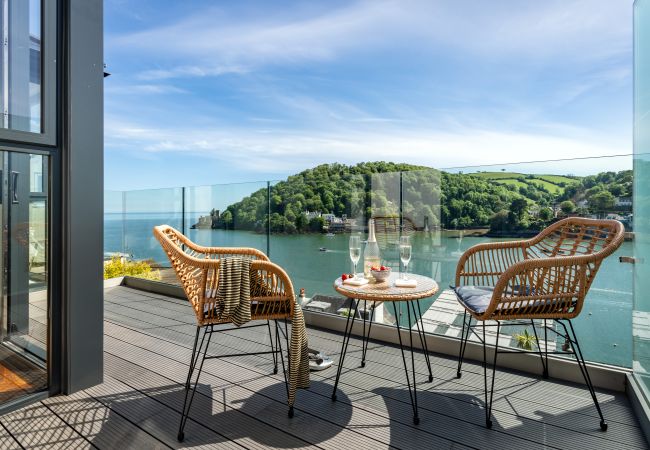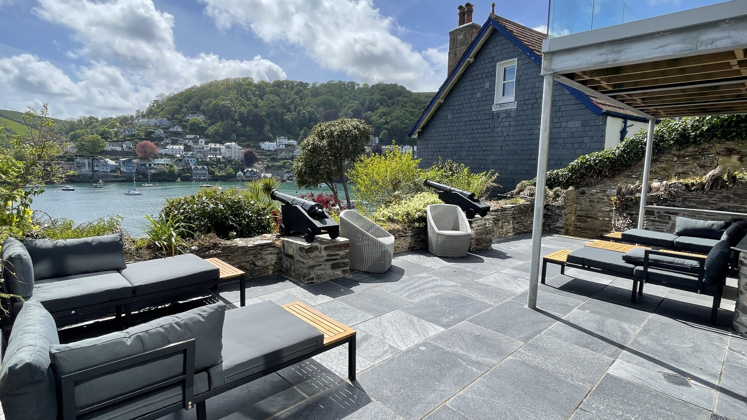 From the kitchen-diner, the room flows out through the glass walls onto the terraced decking, giving a choice of seating and dining areas. Gather to enjoy the incredible Dart estuary views from the lower terrace; there’s dining for up to 8 on the middle terrace, where you can also lay back to enjoy the Summer warmth on the sunloungers.