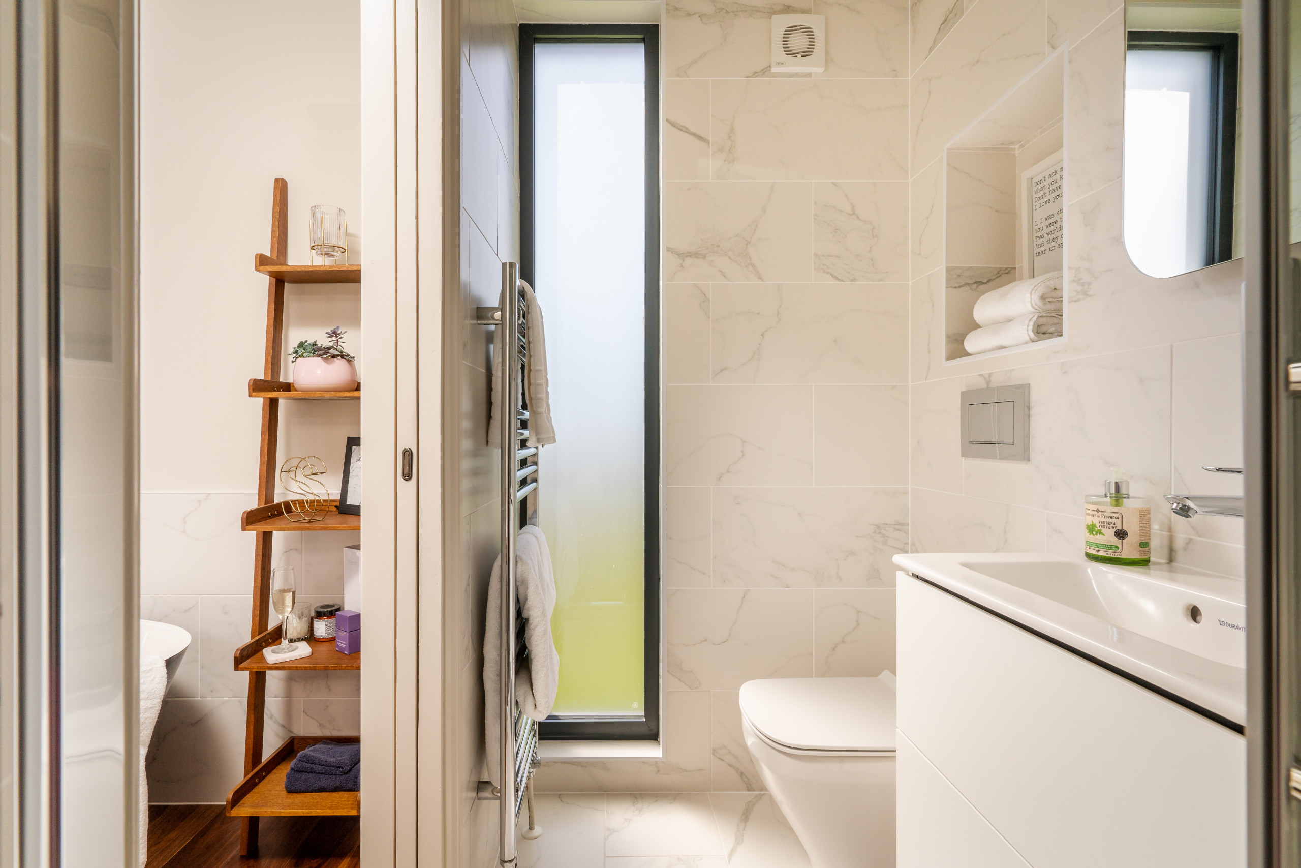 Floor-level lighting guides you upstairs to Homefield’s four individually-styled bedrooms – two with balconies to enjoy the astounding views when you waken. The elegant master bedroom with king size bed, in soothing neutrals, has an en suite bathroom with free-standing bath, shower, vanity unit basin, wc, and heated towel rail. Start the day taking in the view of the wooded hillside from the bedroom’s private balcony.