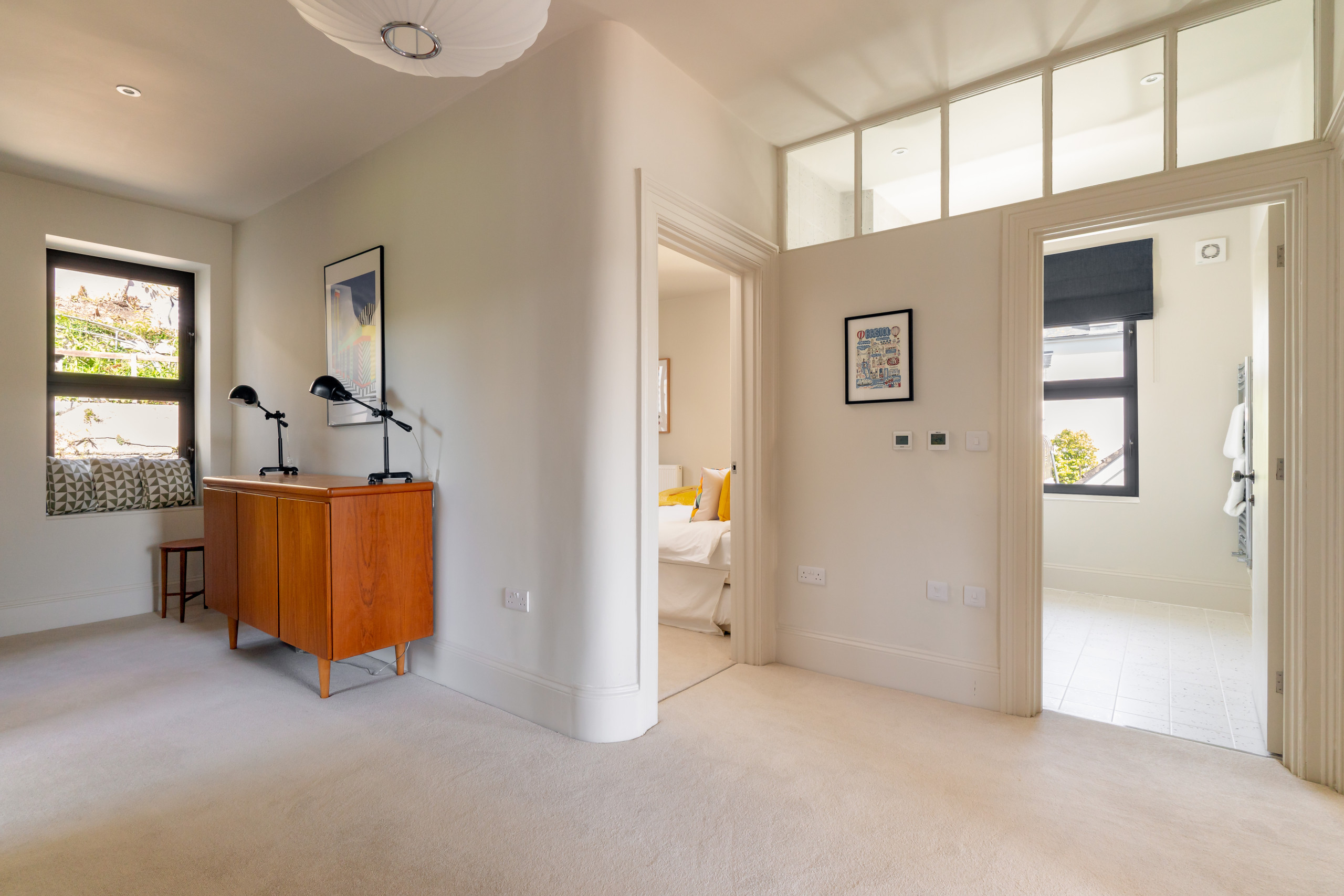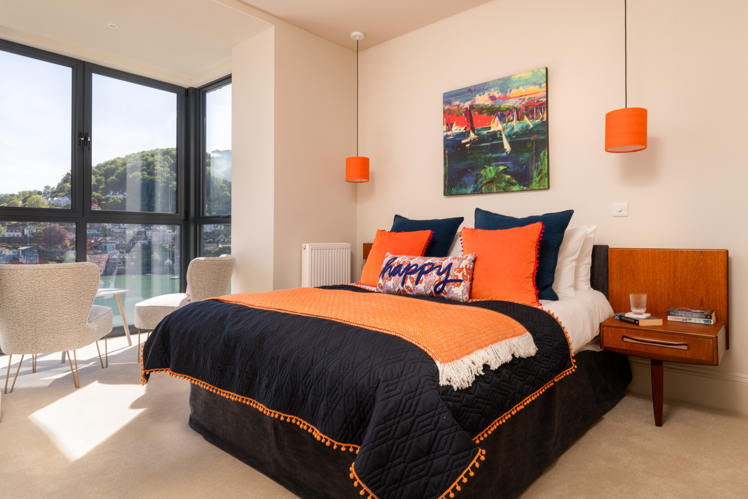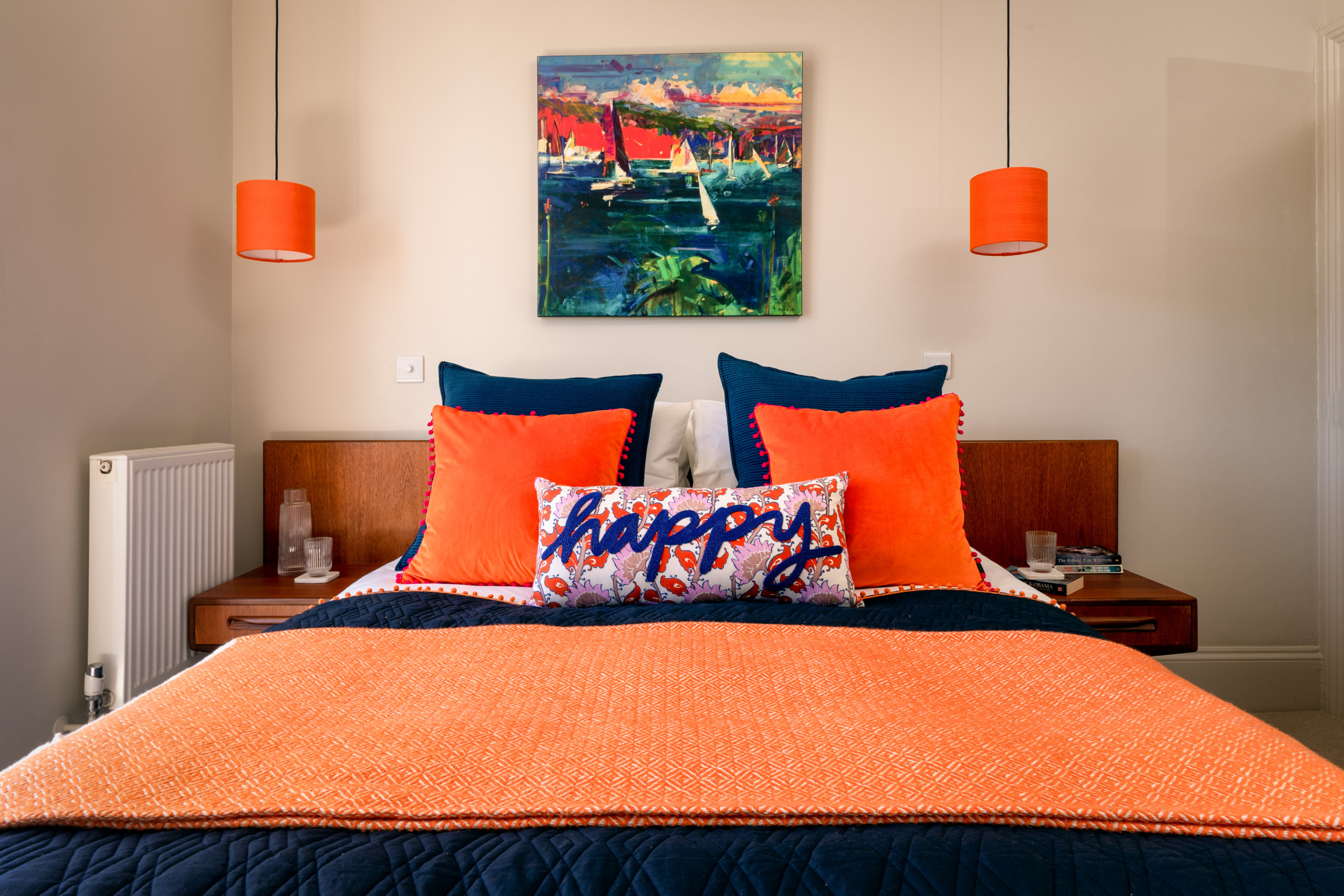 In contrast to the demure master bedroom, uplifting oranges and blues characterise the second bedroom, which offers a king-size bed and access to an ensuite bathroom with shower, hand basin and WC, which is also accessible from the landing.