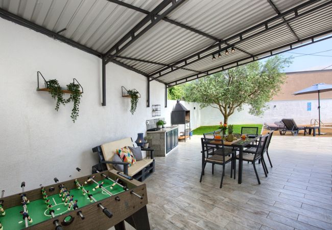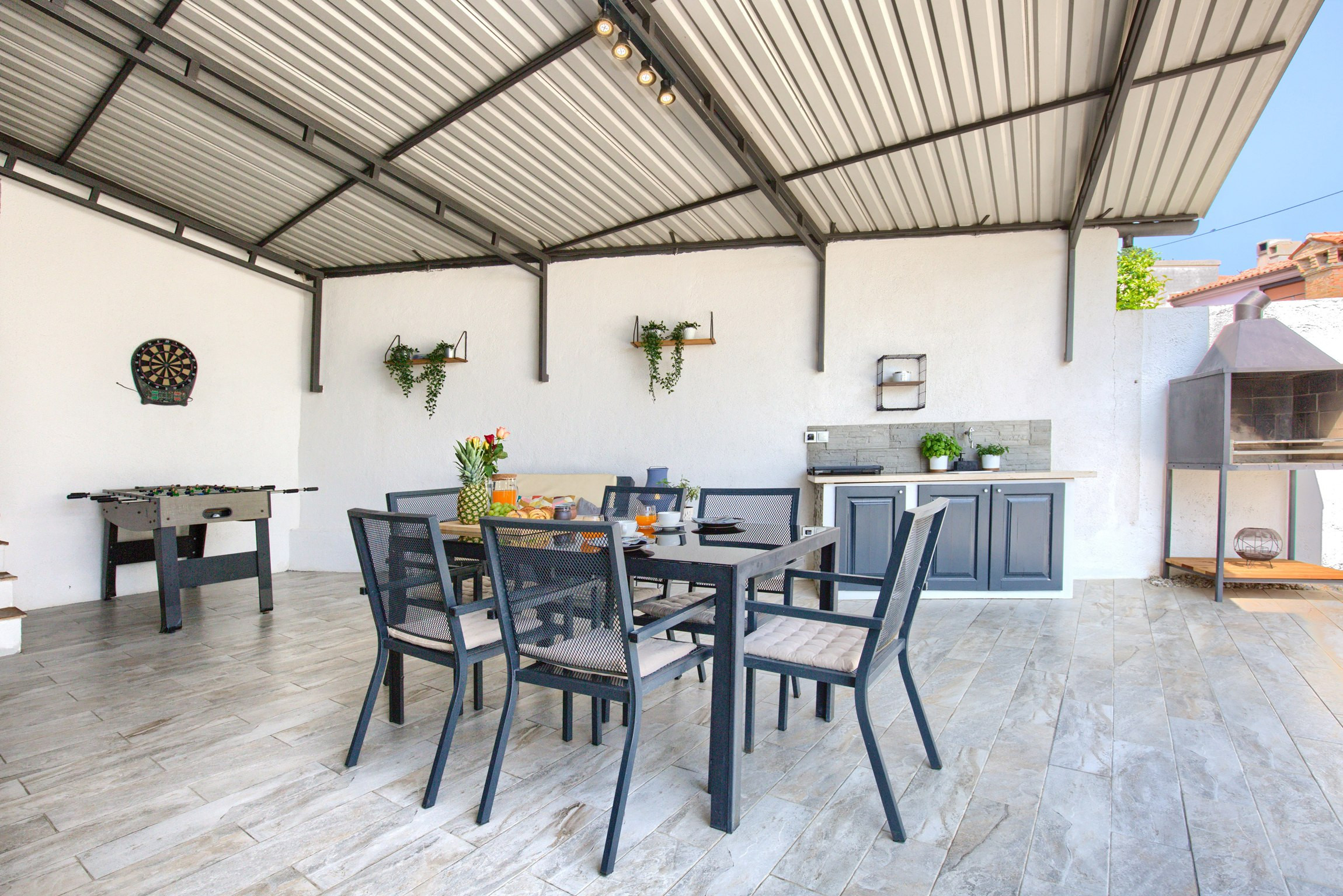 Foosball and darts are placed in the backyard, next to the bbq and dining area. The trampoline for children is also located in the garden.