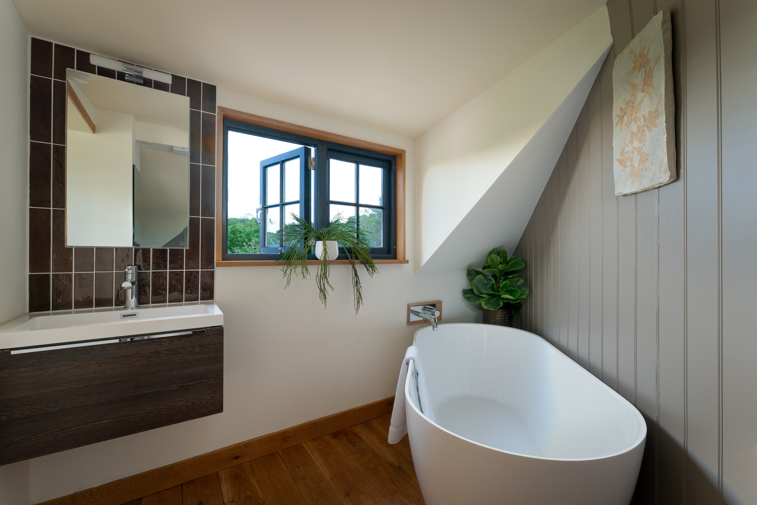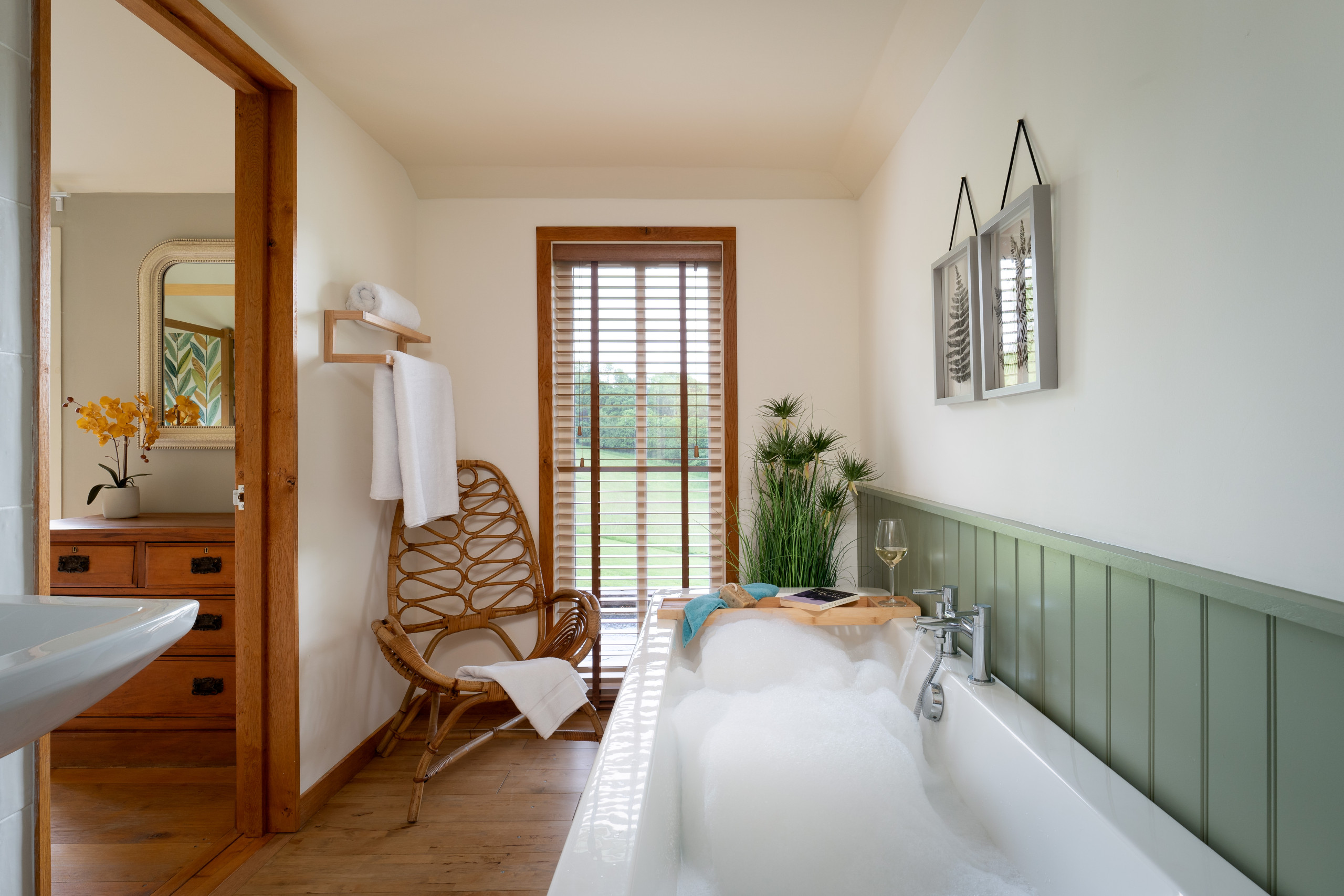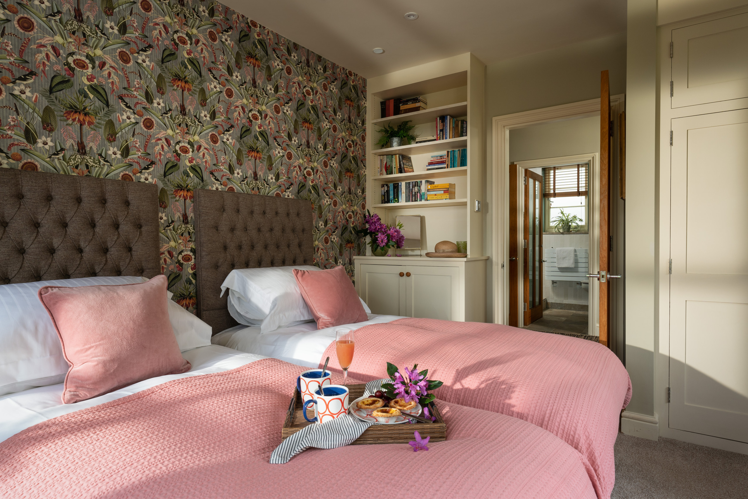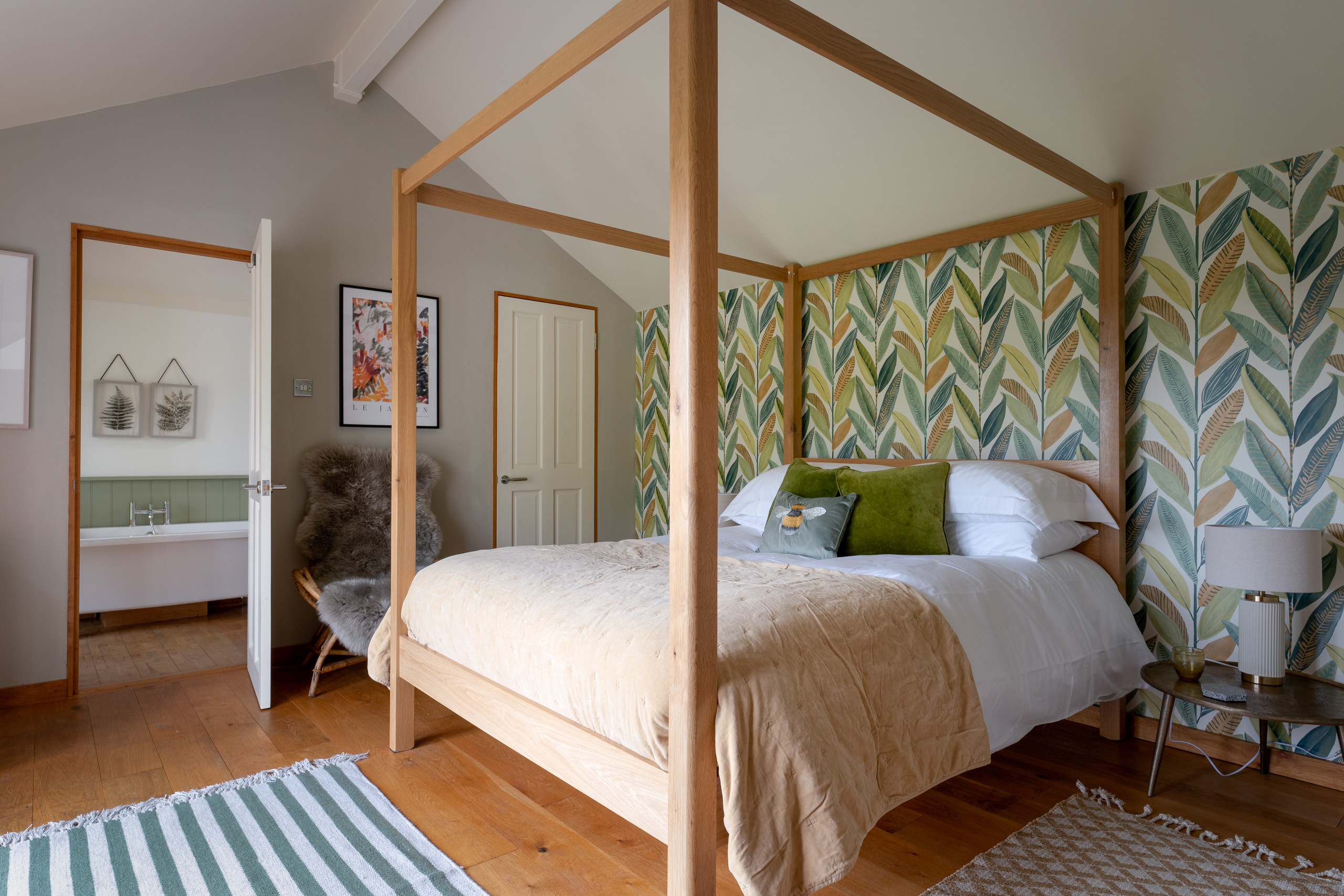 And so to bed. The beautifully decorated sleeping quarters at Higher Mapstone are sure to impress, with plush linens, cloud-soft pillows and stunning views to encourage long lie-ins and breakfasts in bed. On the ground floor, a sweet, dusky-pink twin room with two single beds and access to a family shower room is ideal for children or any guests with mobility issues. If you’re lucky enough to bag the master suite with its four-poster and elegant ensuite bathroom, don’t forget to fling open the bi-fold doors, let the air billow in and take in the views over the grounds and beyond. Upstairs, there are two further individually decorated king bedrooms, one with a walk-through dressing area and shower room, and the other with an en-suite bathroom.
