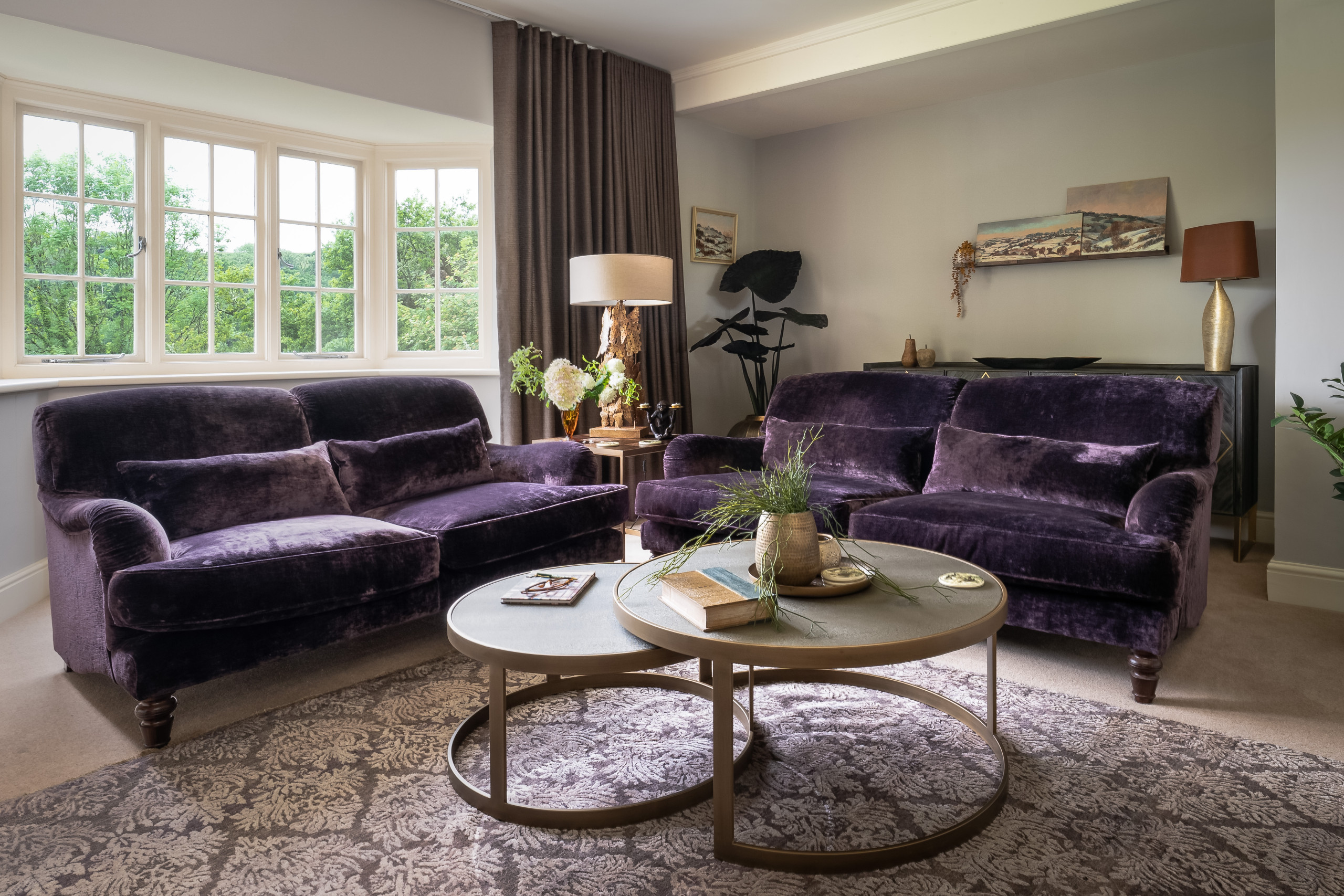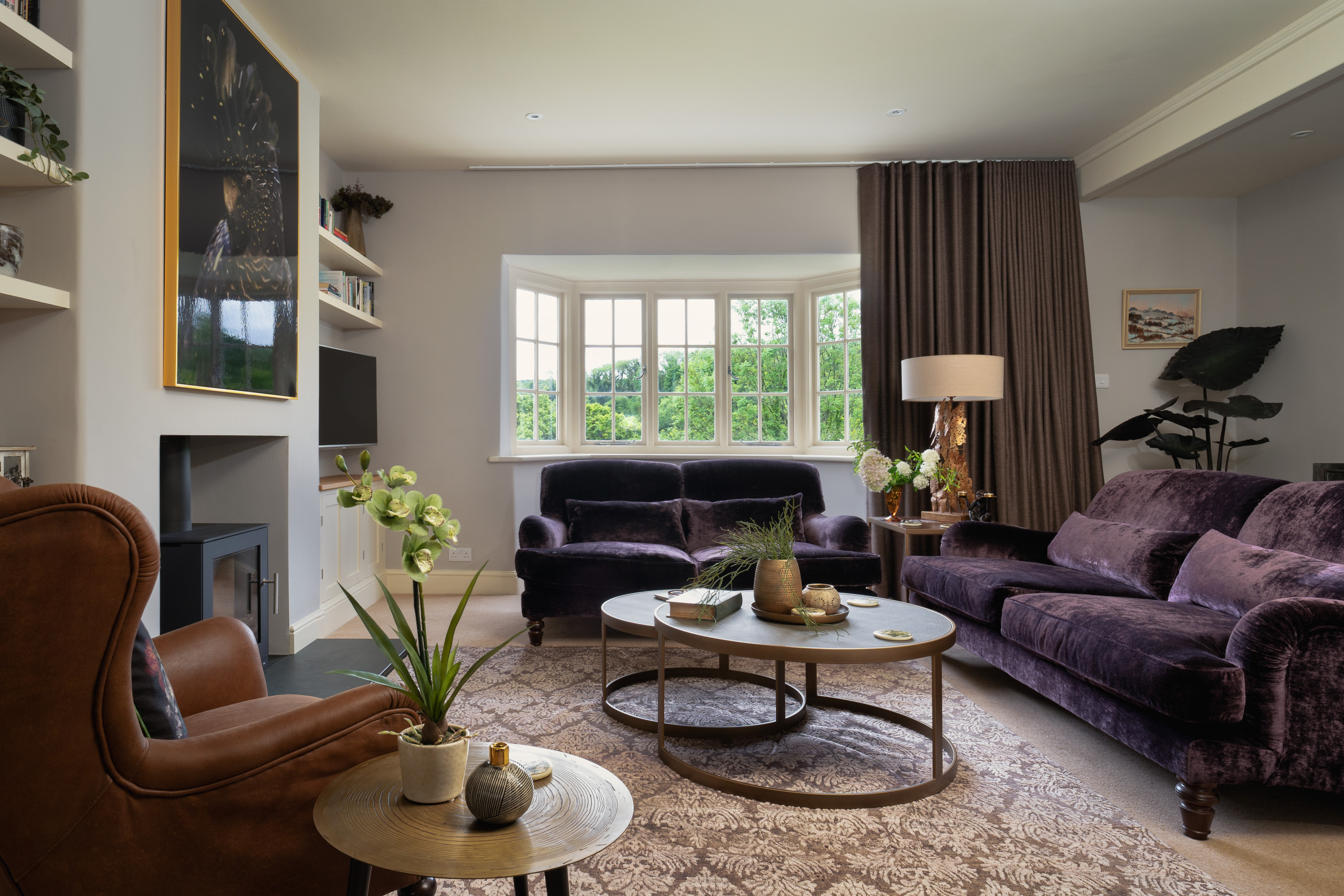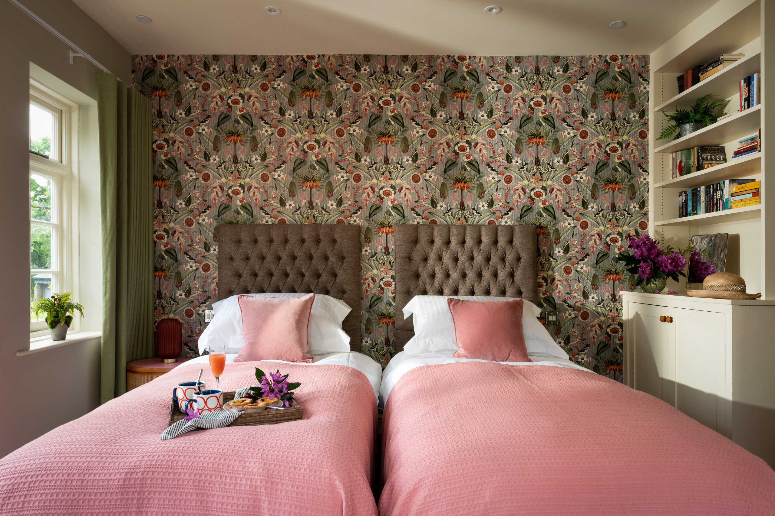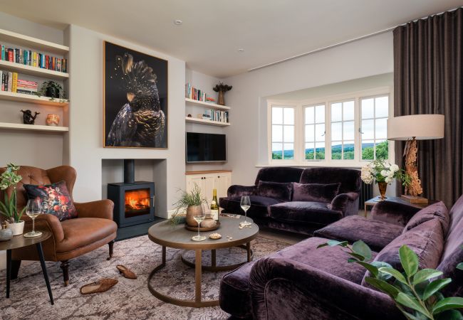 You know you’ve come home as soon as you enter the front door. Kick off your shoes and pad through the welcoming entrance hall to the sitting room, where sumptuous velvet sofas beg you to snuggle up in front of the wood-burning stove with a mug of steaming hot cocoa. The kitchen-dining room is a delight: hand-built in oak and stainless steel, including the dining table, the light and airy space include two distinct sitting areas, from which bi-fold and French doors provide seamless access to the terraces and views. The elegant drawing room, with its fabulous wallpaper adorned with birds and foliage, is the perfect place to retire after a delicious, locally sourced meal, if the elements mean it’s cosier to stay inside.