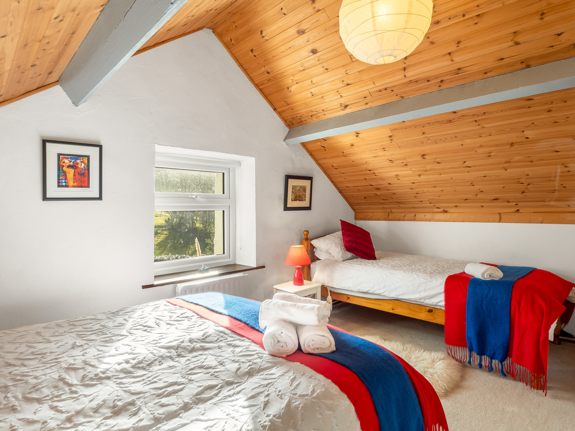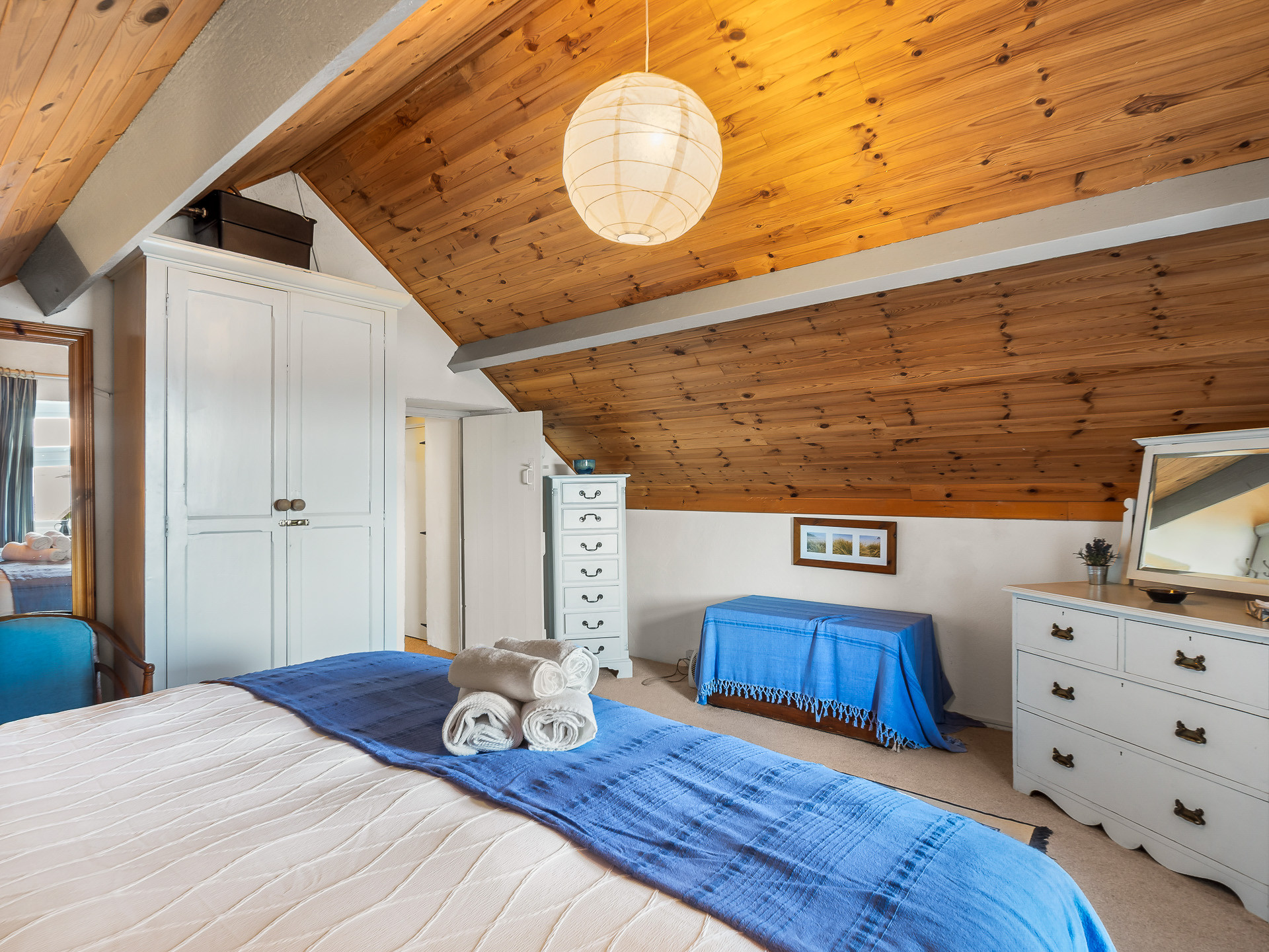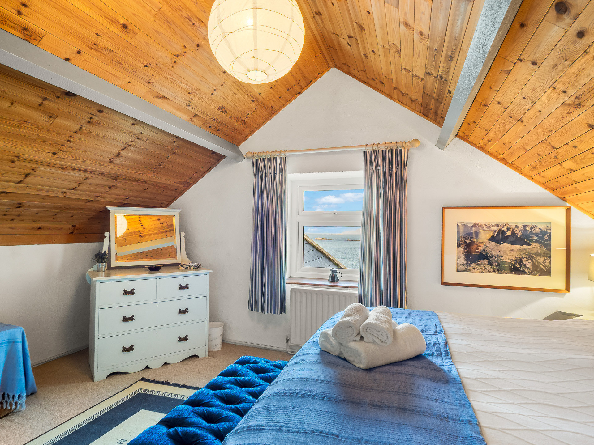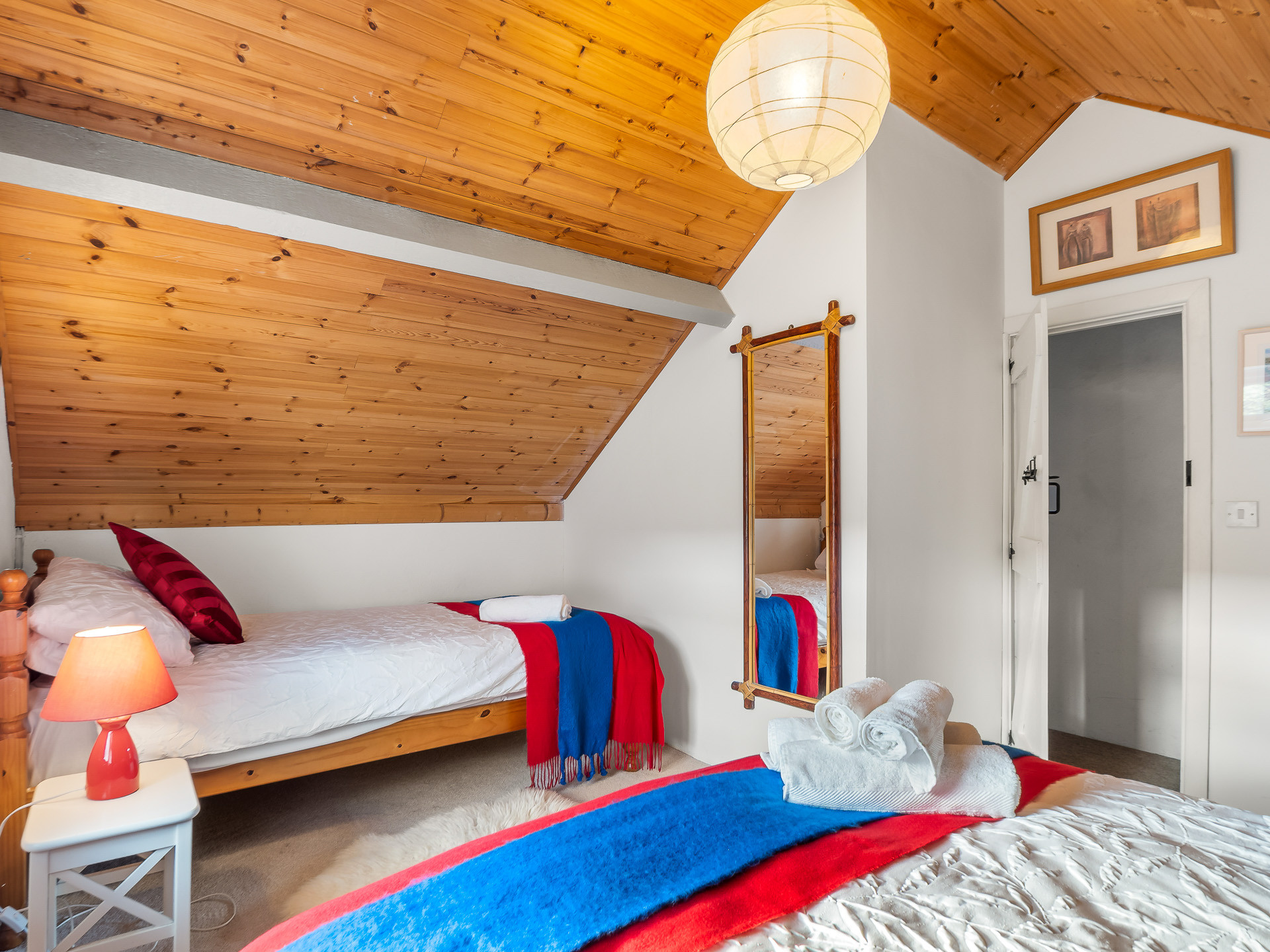 Upstairs, the home offers two beautifully appointed bedrooms, one with a super king bed and freestanding wardrobe, and the second with a double and single bed and a built-in wardrobe — perfect for families or friends. Two bathrooms complete the layout: one with a shower, and another with a toilet and basin.